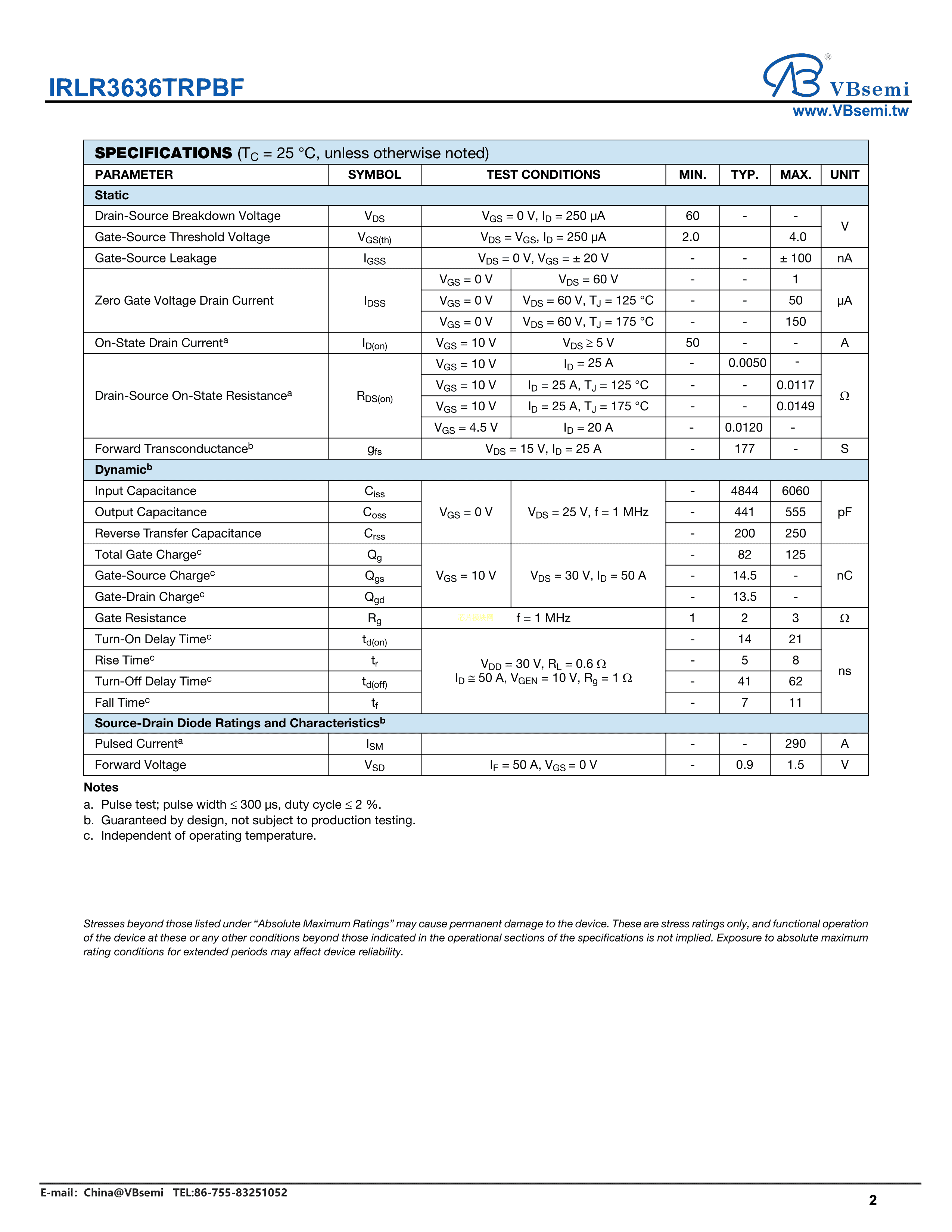 IRLR3636TRPBF数据手册TO-252封装VBsemi(台湾微碧)PDF规格书,中英文下载