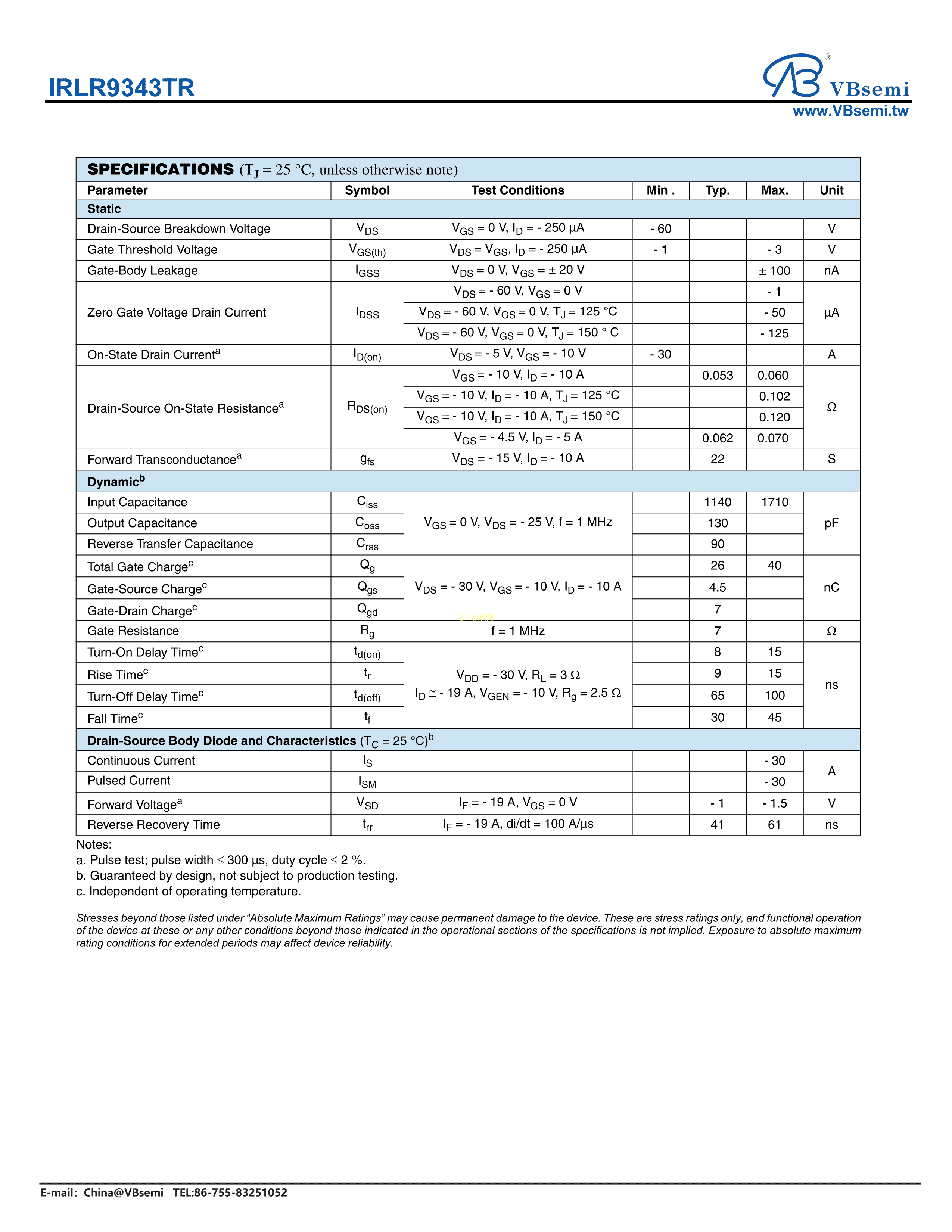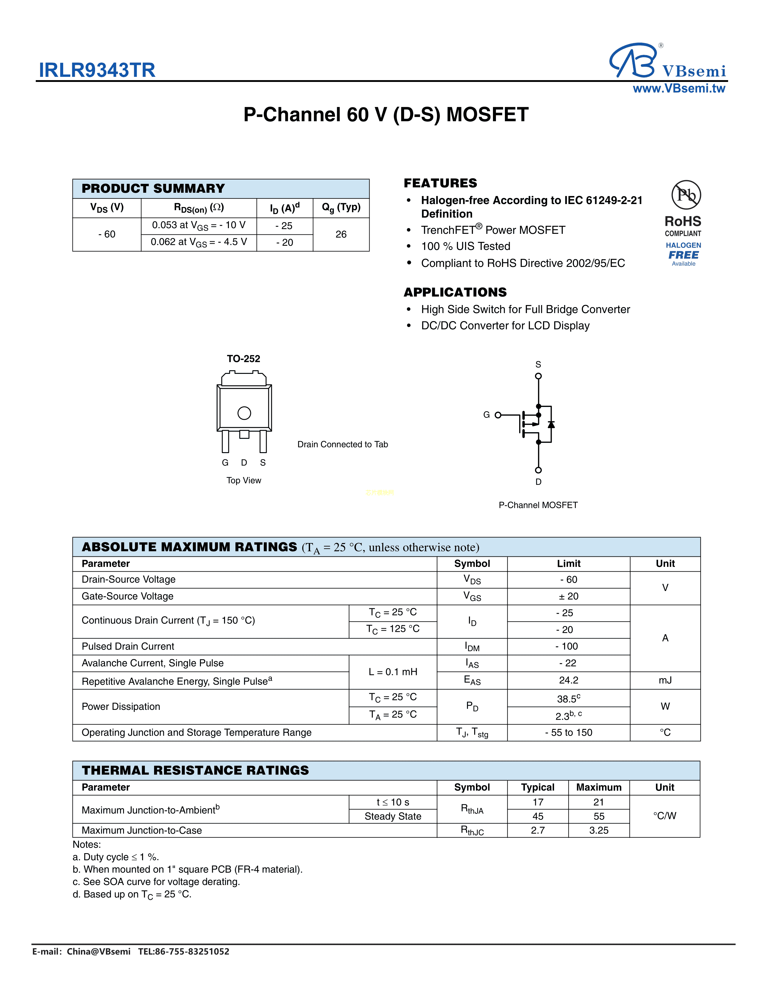 IRLR9343TR数据手册TO-252封装VBsemi(台湾微碧)PDF规格书,中英文下载