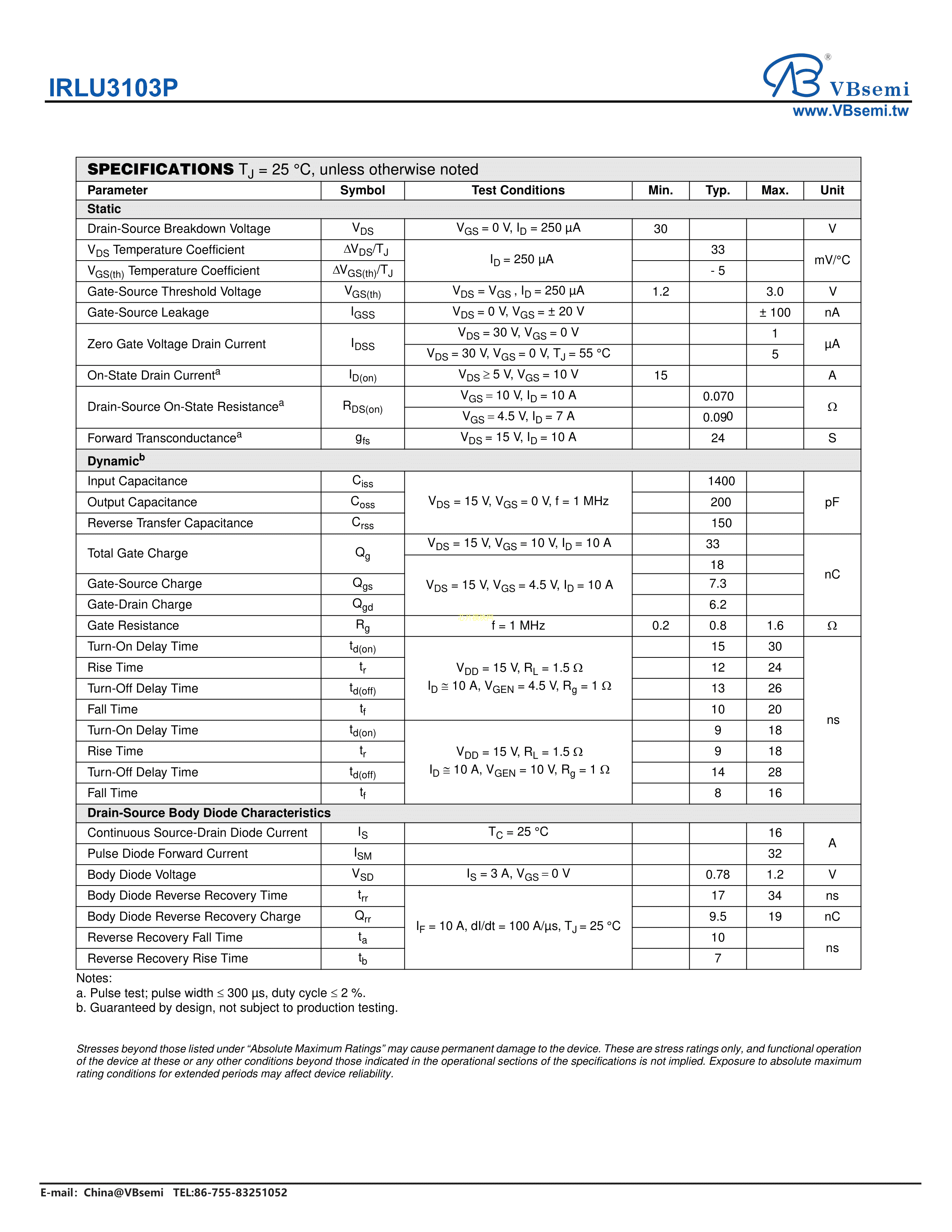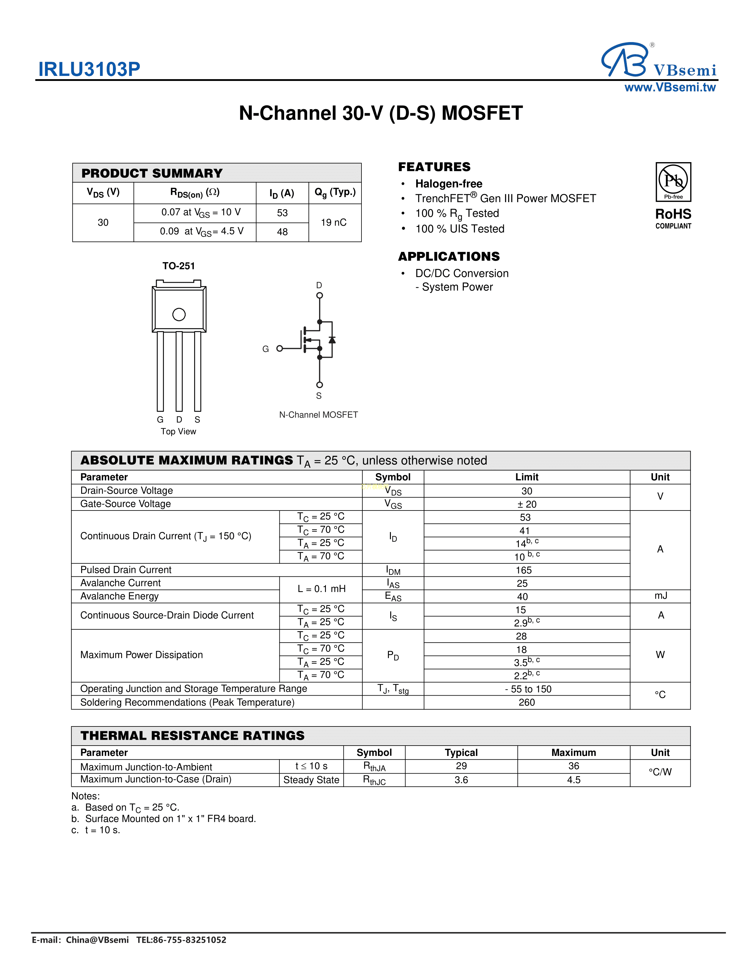 IRLU3103P数据手册TO-251封装VBsemi(台湾微碧)PDF规格书,中英文下载