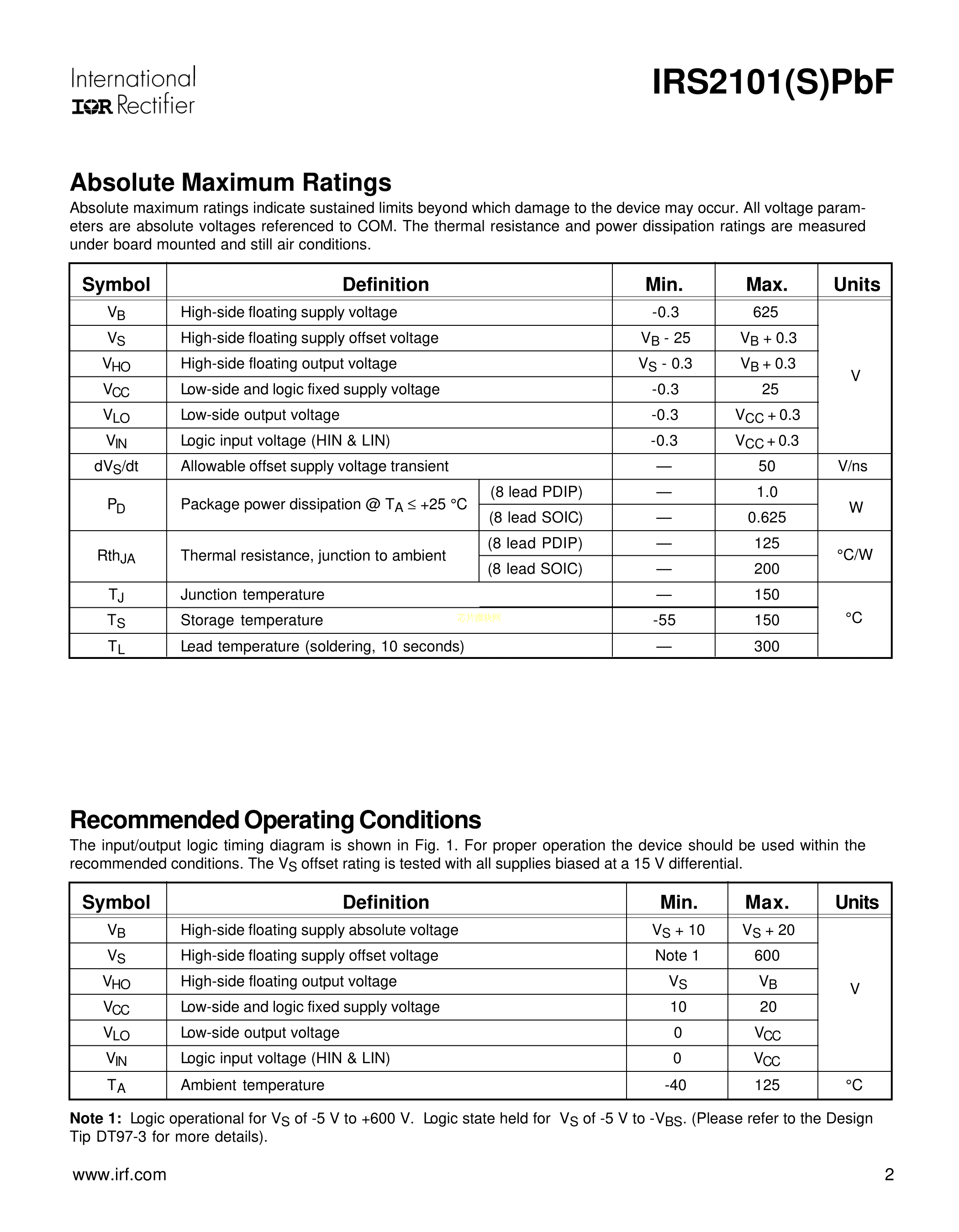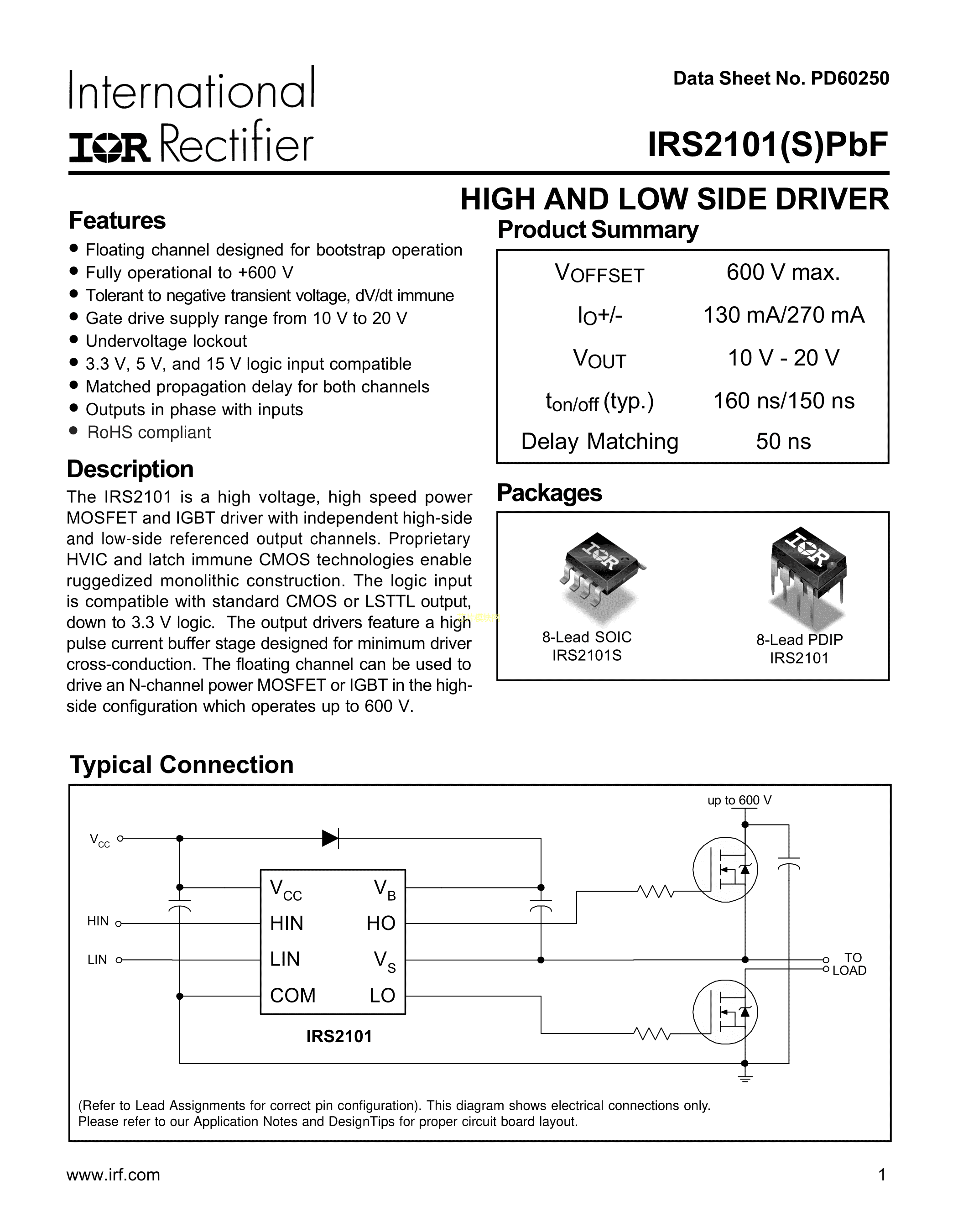 IRS2101PBF数据手册PDIP-8封装Infineon(英飞凌)PDF规格书,中英文下载