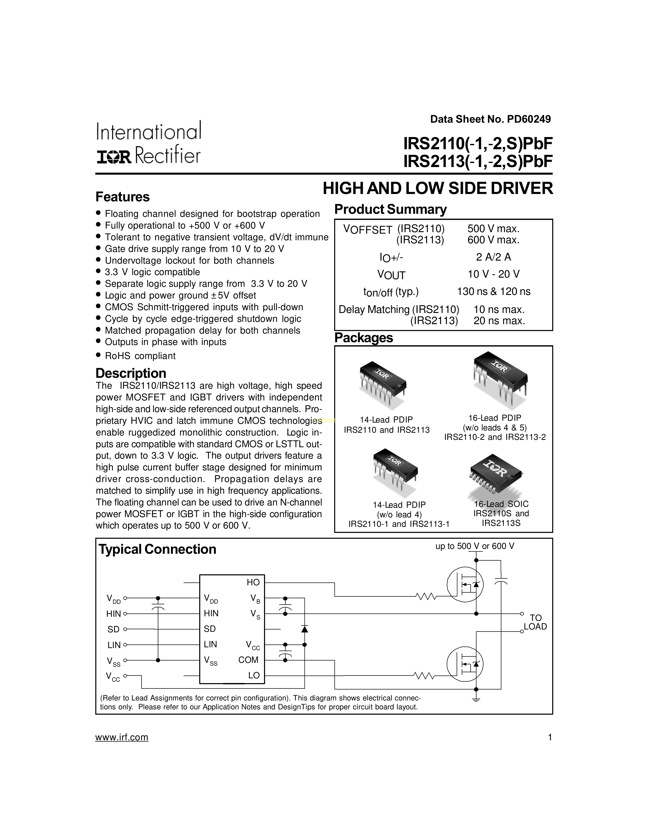 IRS2113STRPBF数据手册SOIC-16封装Infineon(英飞凌)PDF规格书,中英文下载