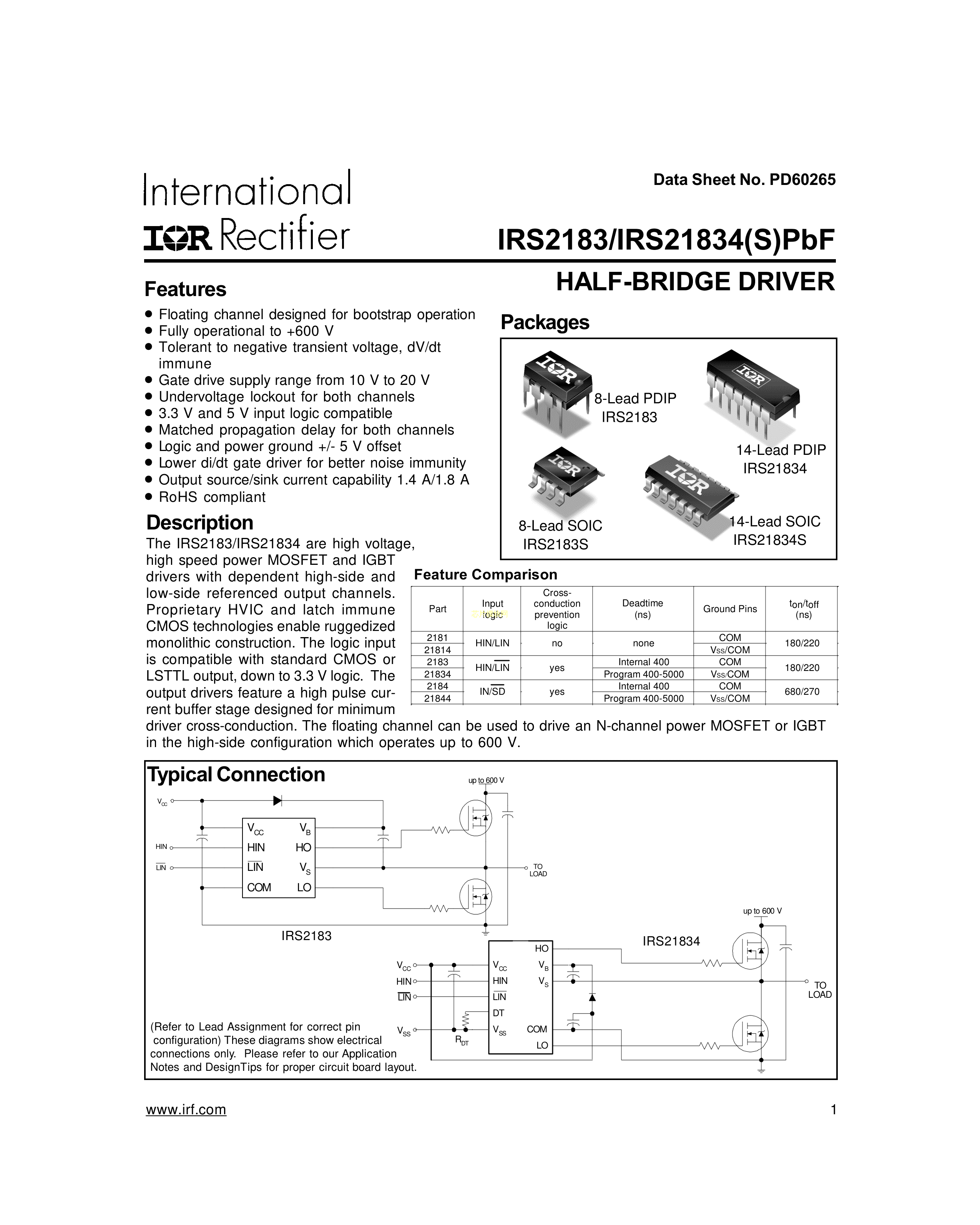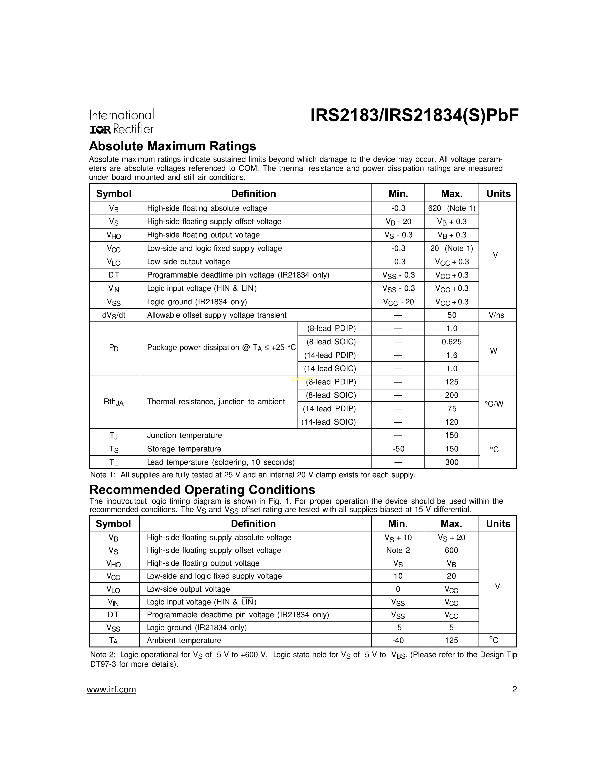 IRS2183PBF数据手册PDIP-8封装Infineon(英飞凌)PDF规格书,中英文下载