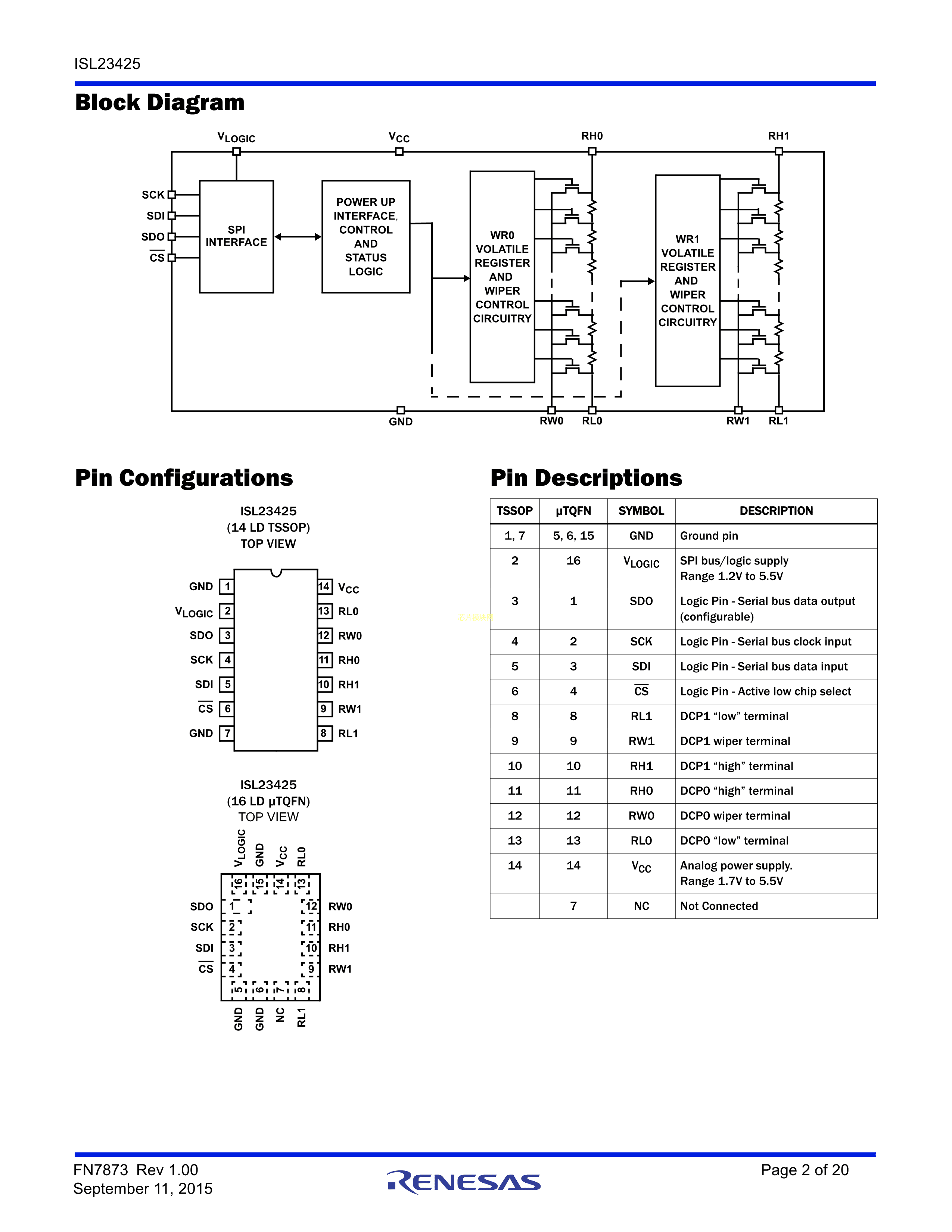 ISL23425WFVZ-T7A数据手册TSSOP-14封装RENESAS(瑞萨)-IDTPDF规格