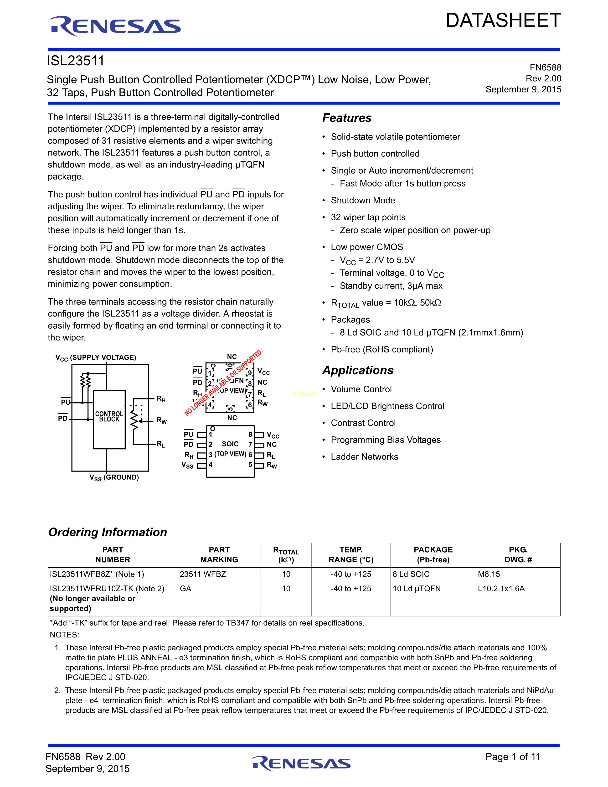 ISL23428TFRUZ-TK数据手册UTQFN-16(2.6x1.8)封装RENESAS(瑞萨)