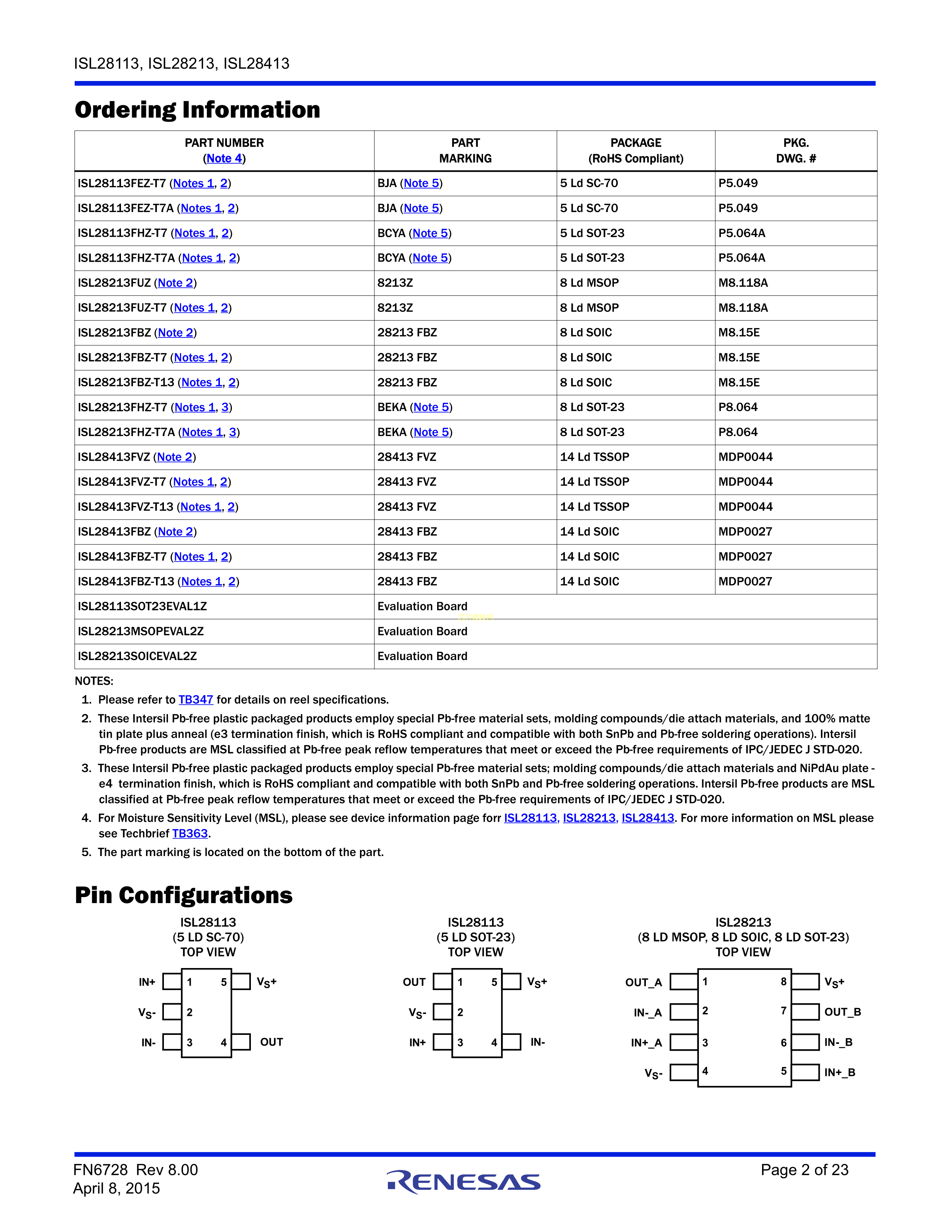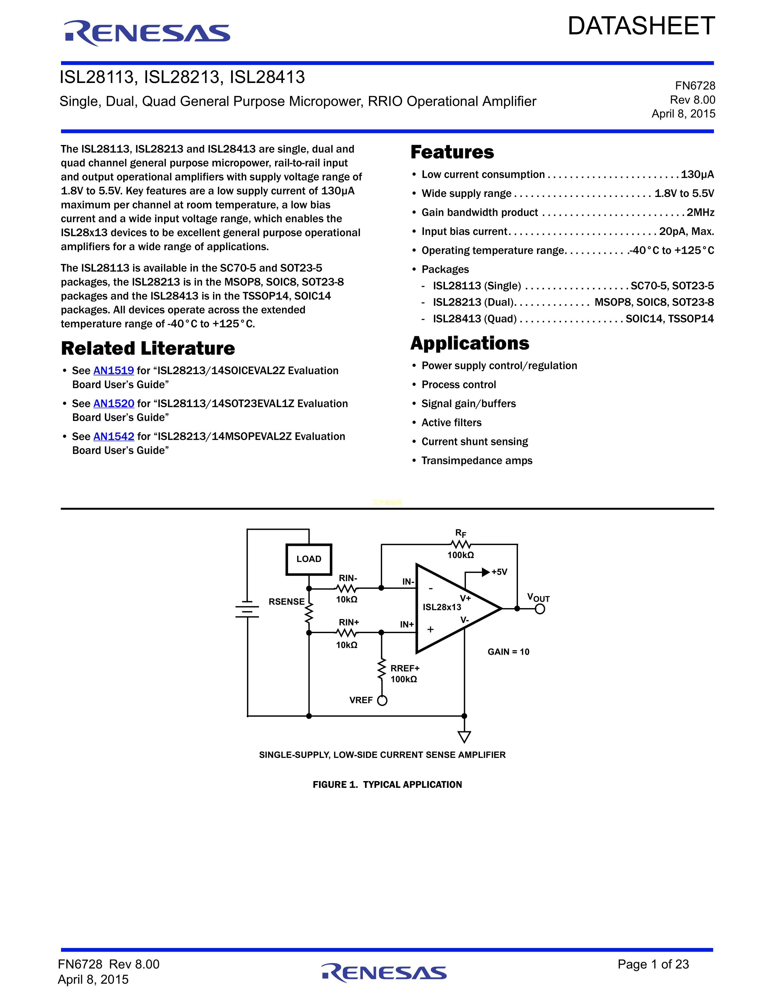 ISL28113FEZ-T7A数据手册SC-70-5封装RENESAS(瑞萨)-IDTPDF规格书,