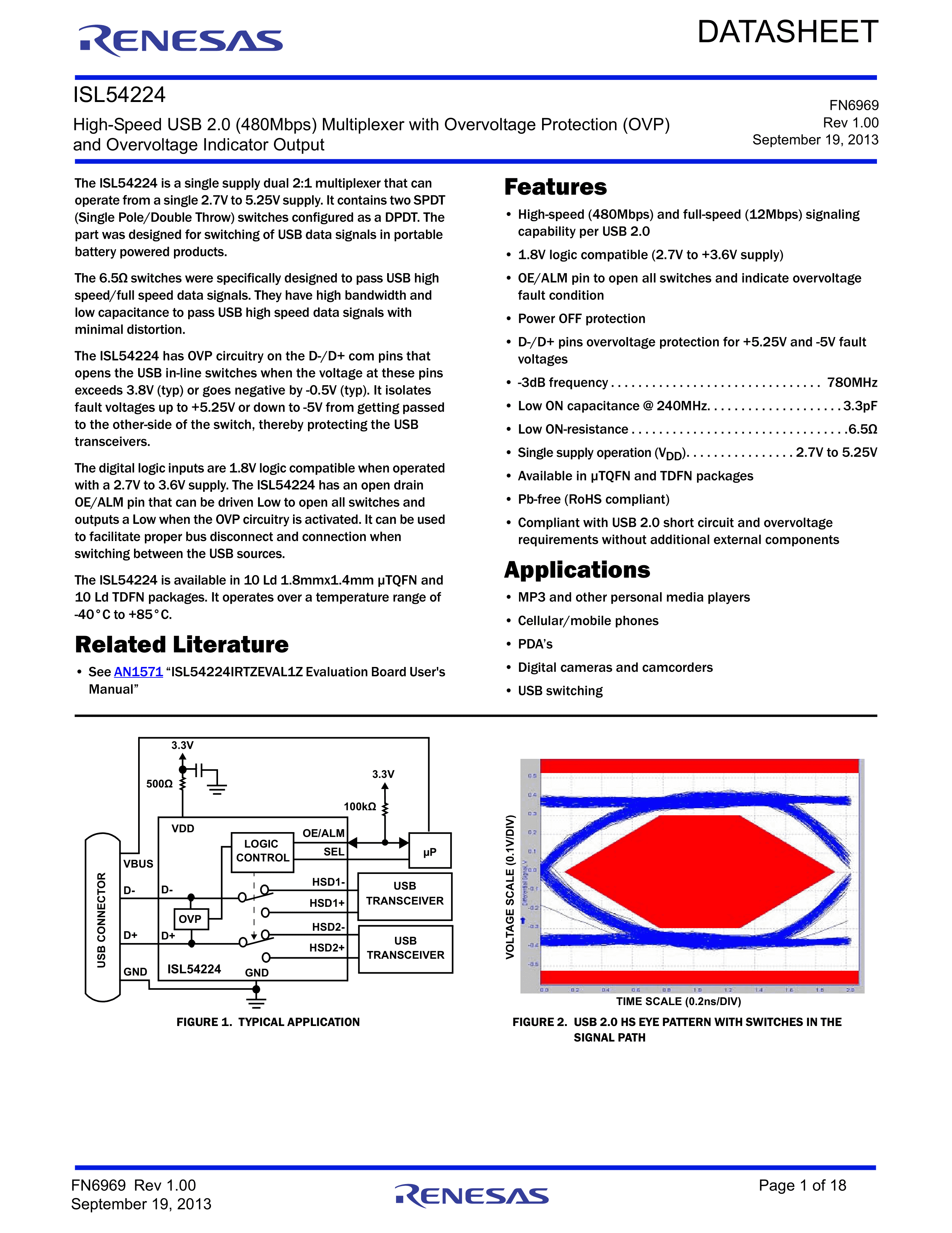 ISL54224IRUZ-T数据手册UTQFN-10(1.8x1.4)封装RENESAS(瑞萨)-I