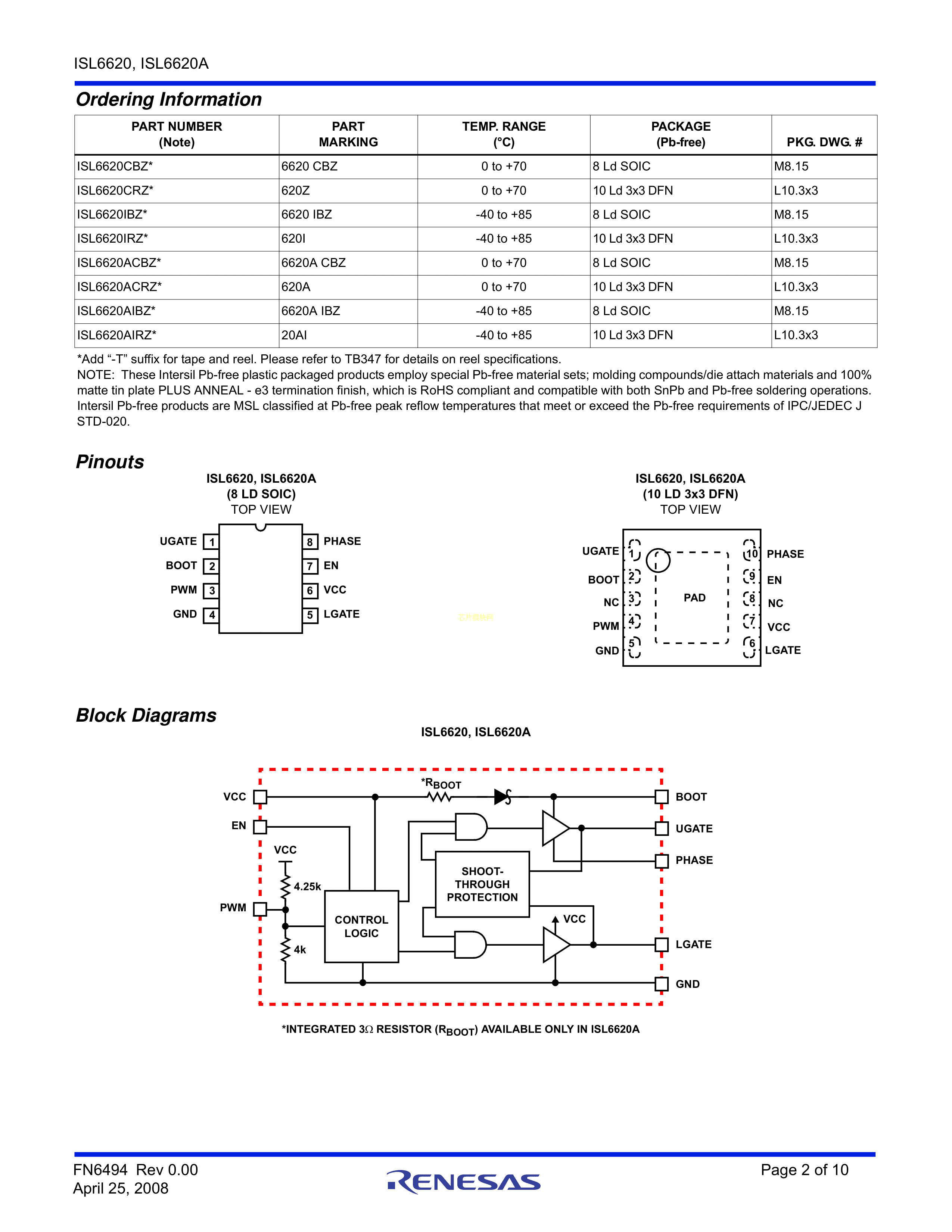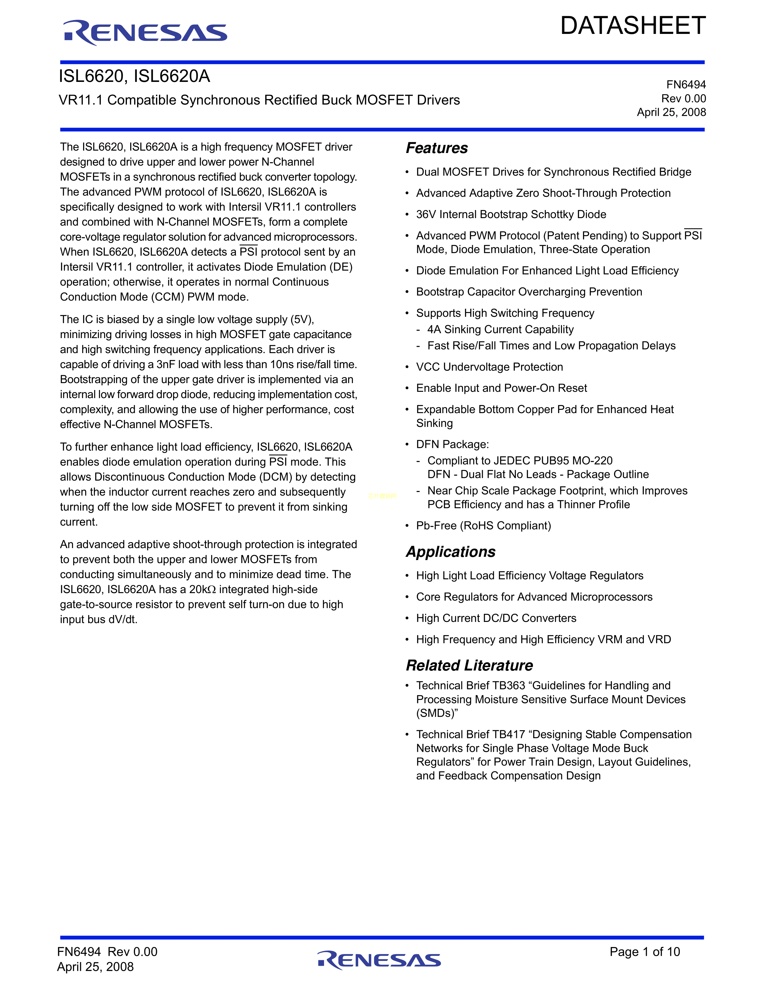 ISL6620ACRZ-T数据手册DFN-10(3x3)封装RENESAS(瑞萨)-IDTPDF规格