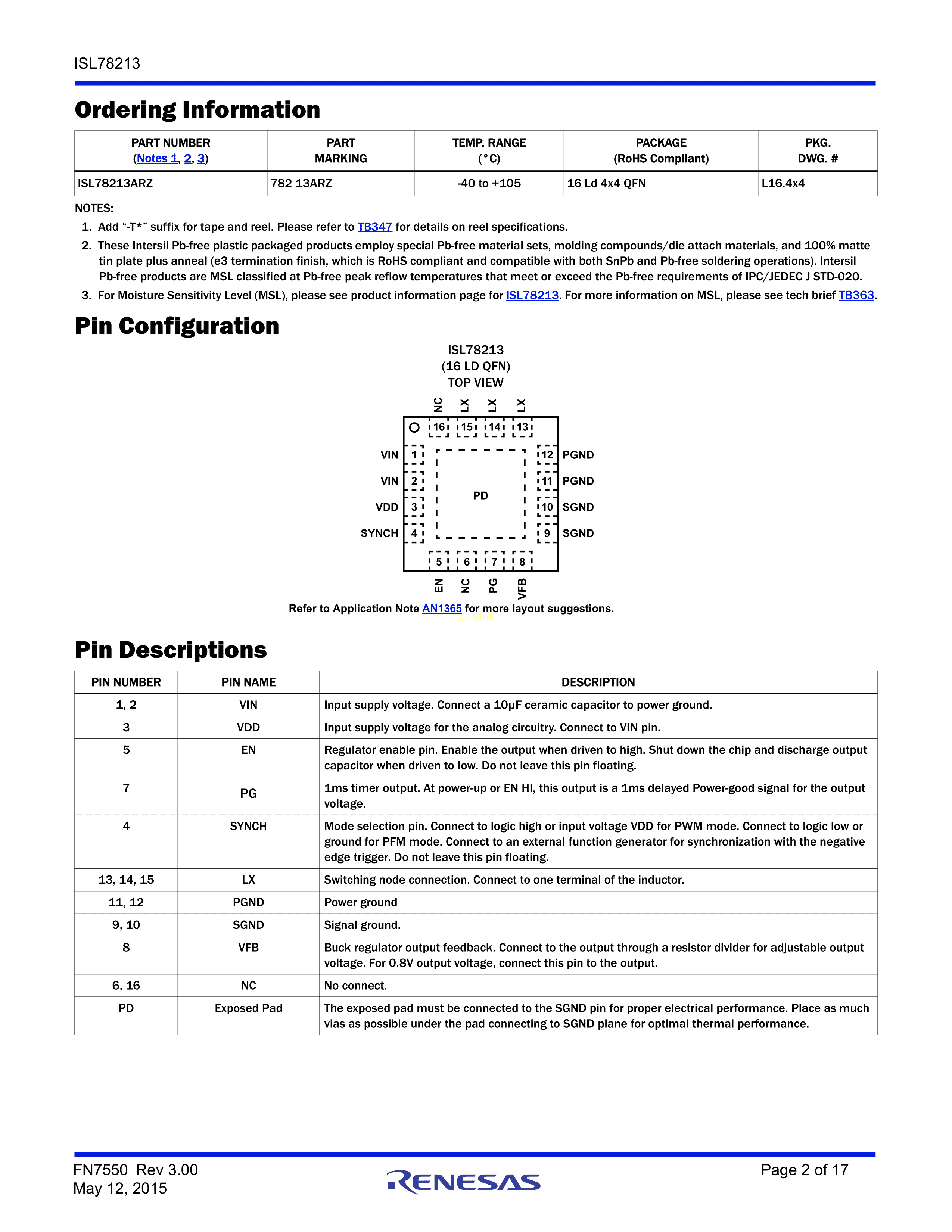 ISL78213ARZ数据手册QFN-16(4x4)封装RENESAS(瑞萨)-IDTPDF规格书,