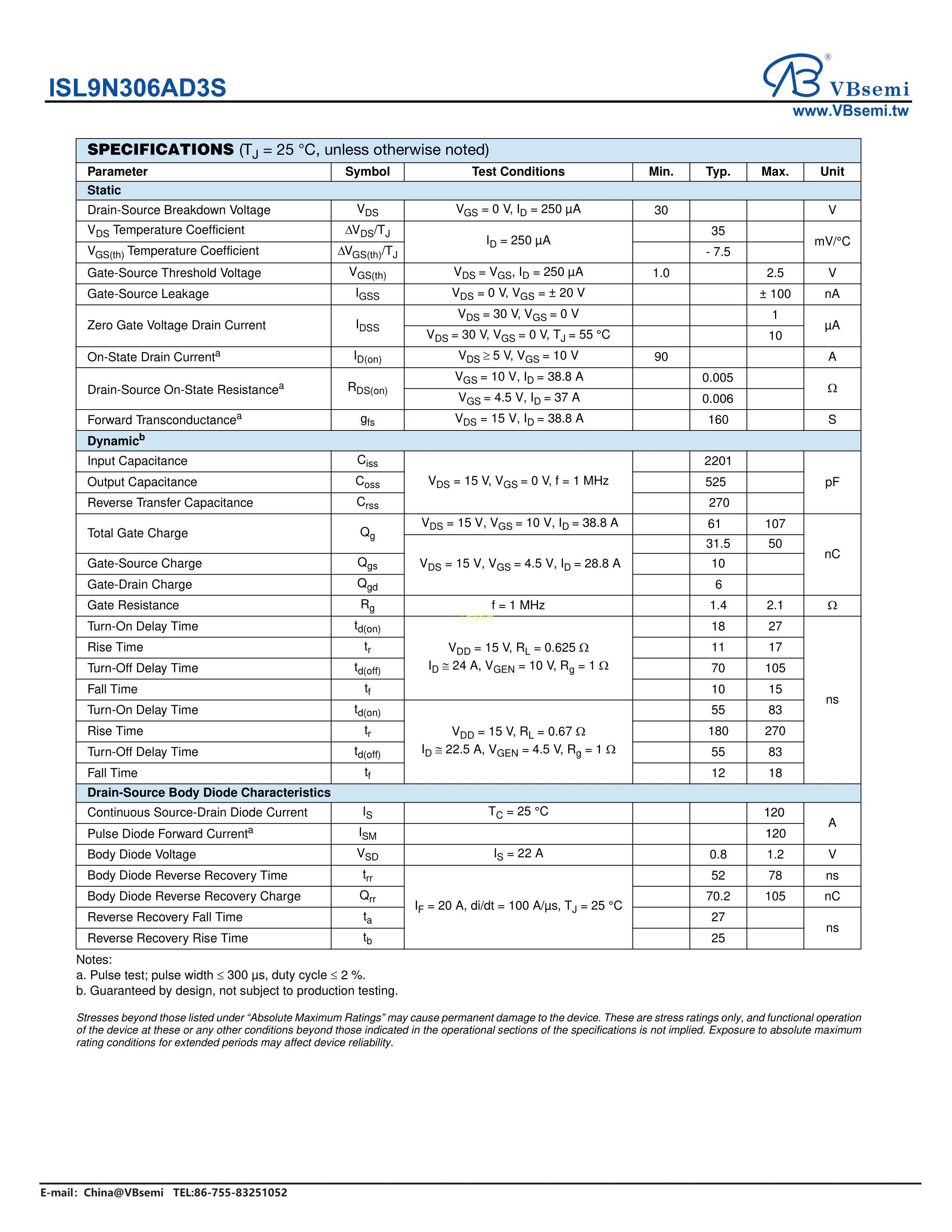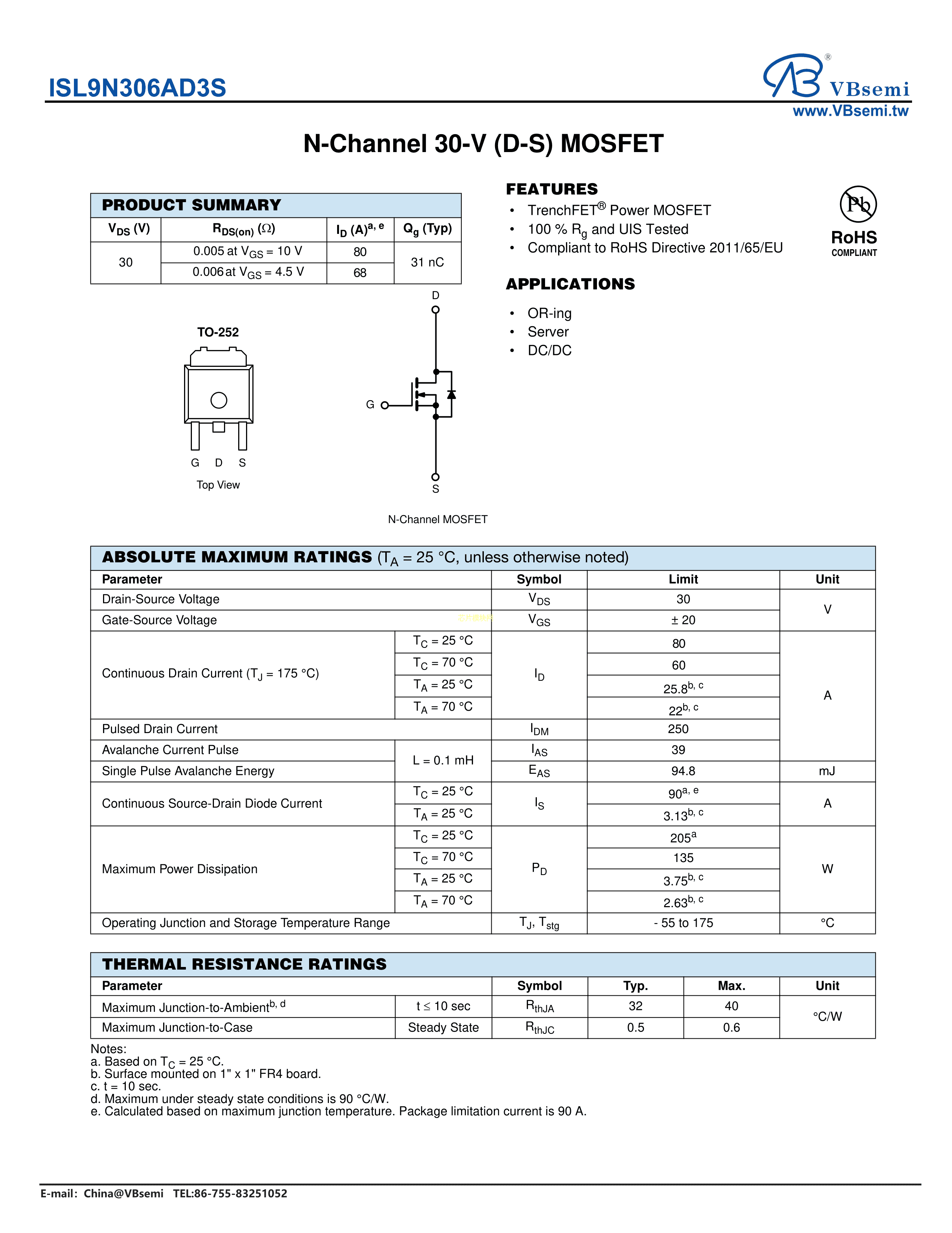 ISL9N306AD3S数据手册TO-252封装VBsemi(台湾微碧)PDF规格书,中英文下载
