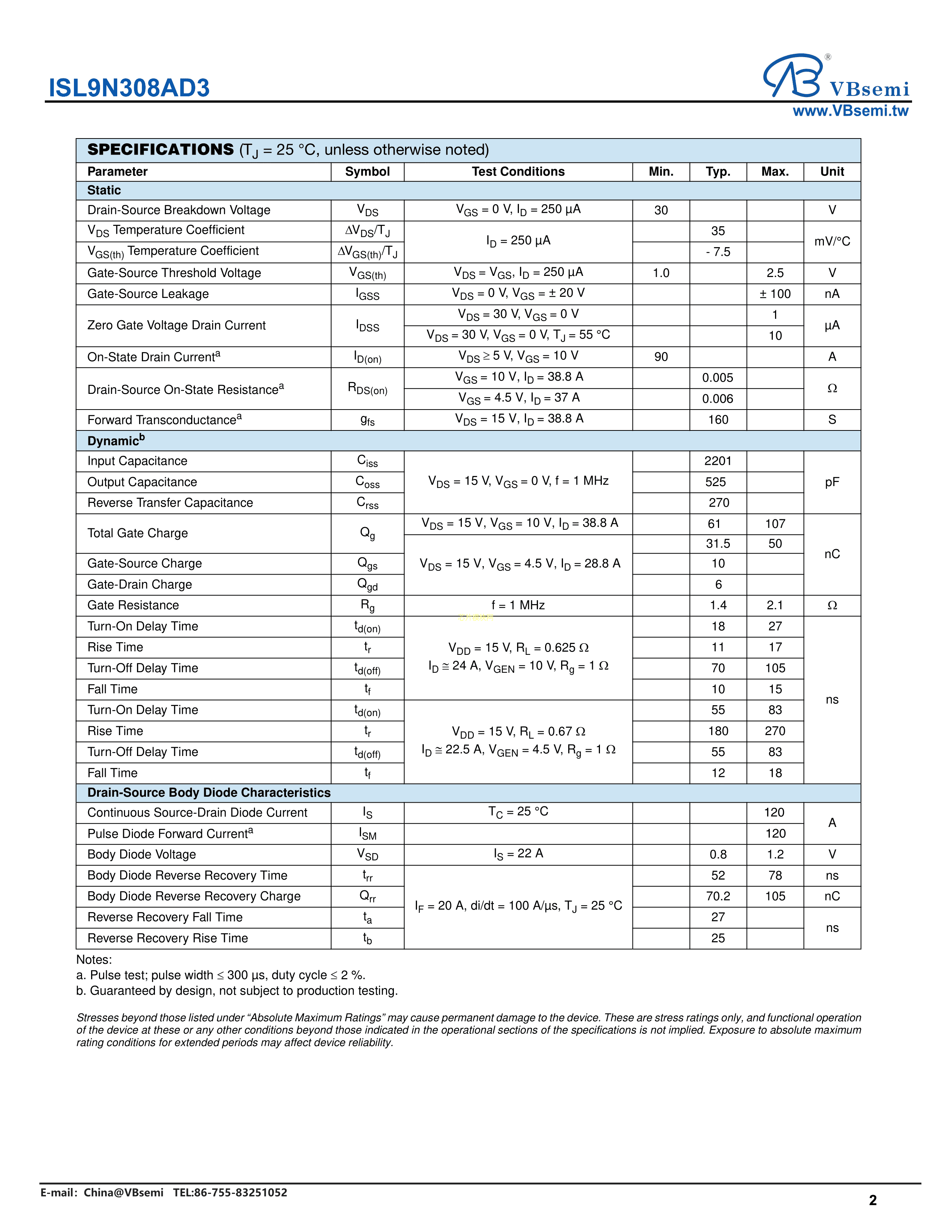 ISL9N308AD3数据手册TO-252封装VBsemi(台湾微碧)PDF规格书,中英文下载
