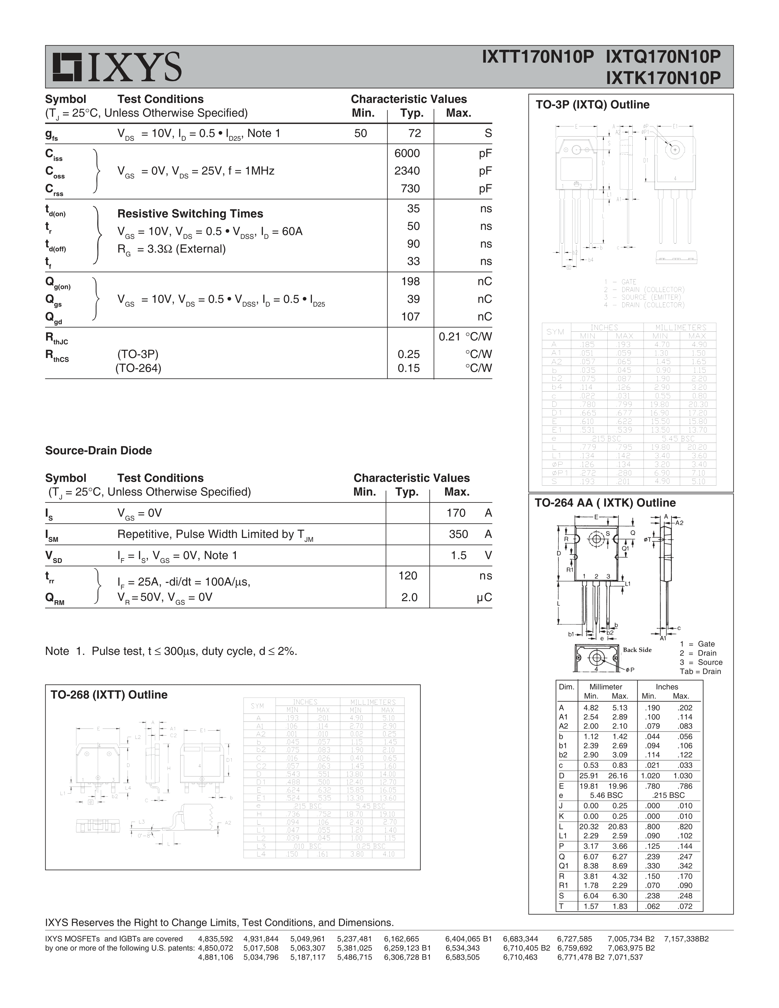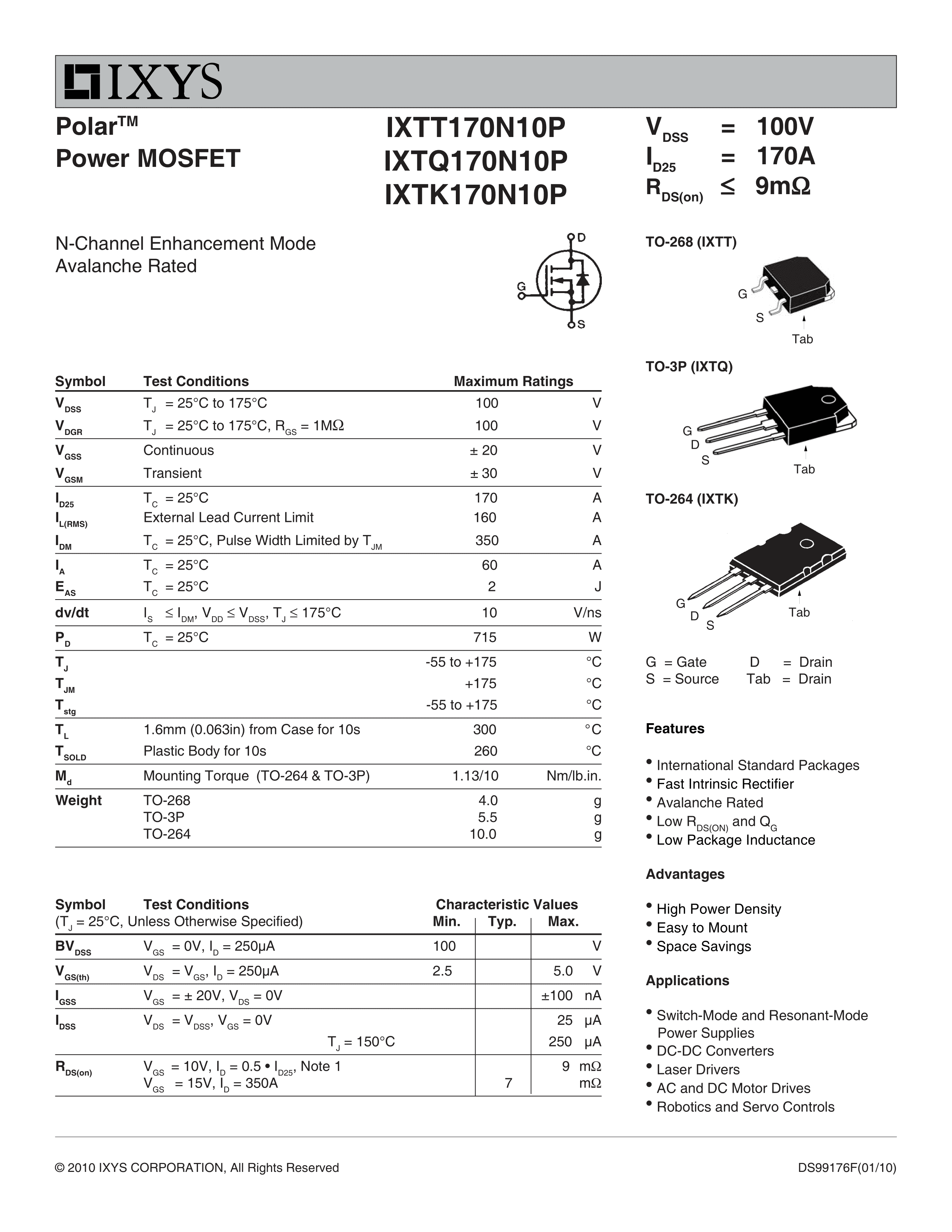 IXTQ170N10P数据手册TO-3P封装IXYSPDF规格书,中英文下载