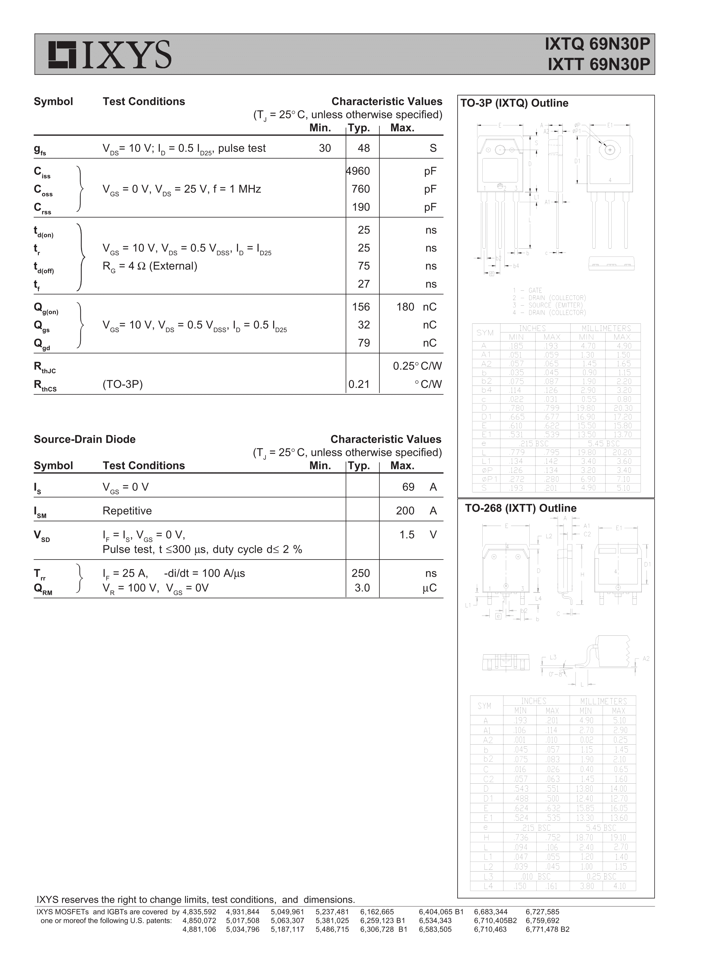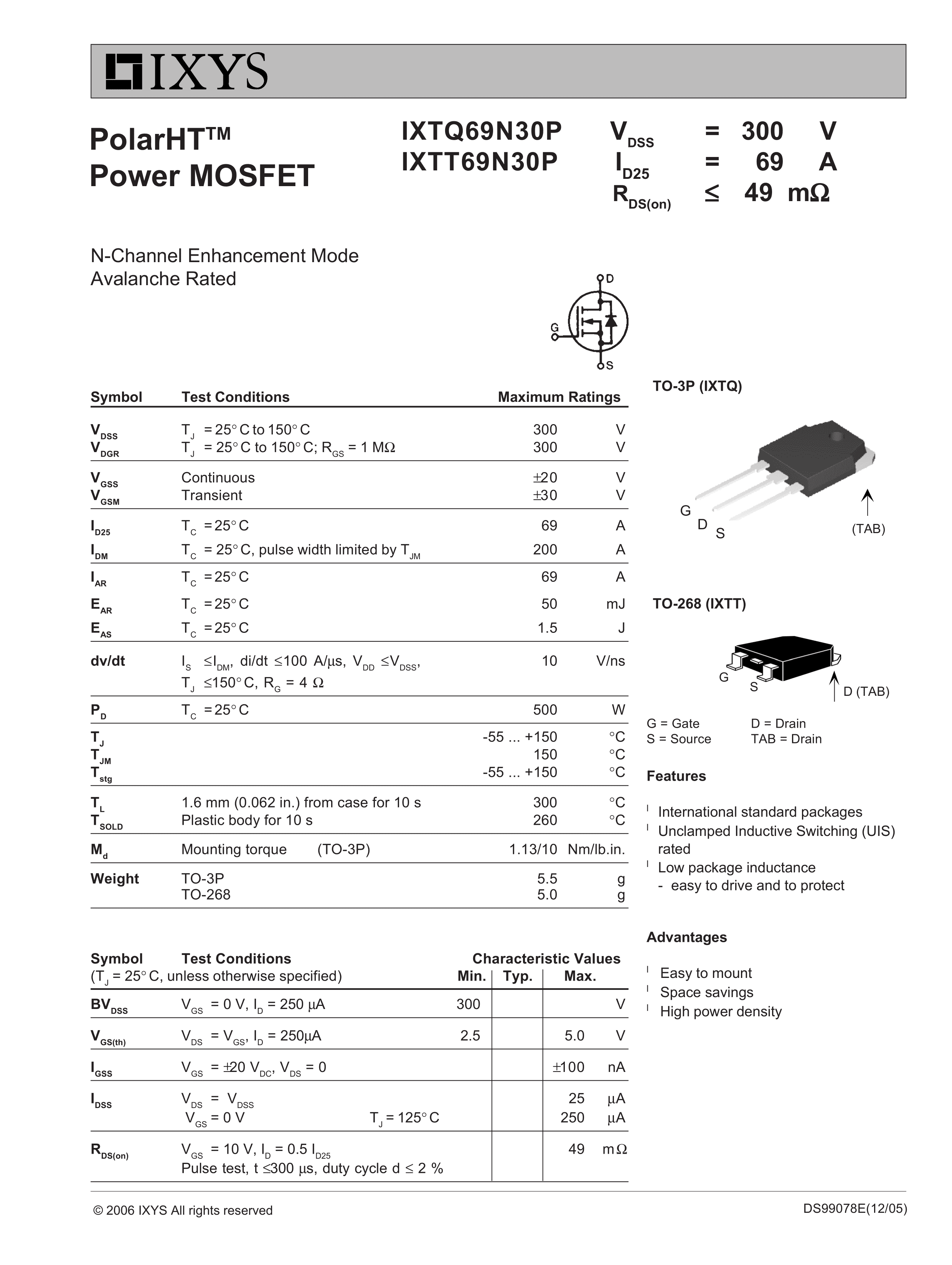 IXTQ69N30P数据手册TO-3P封装IXYSPDF规格书,中英文下载
