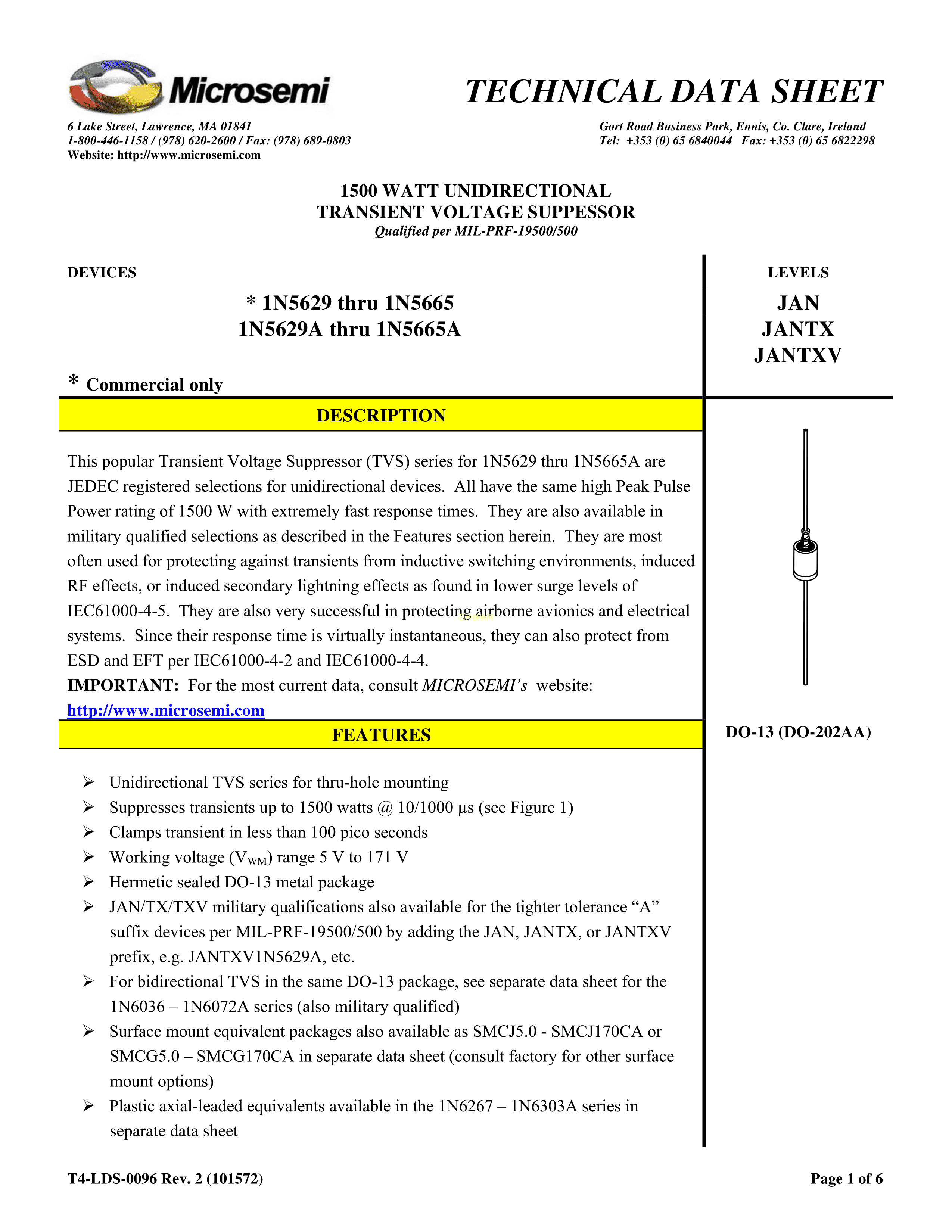 JAN1N5652A数据手册DO-13(DO-202AA)封装Microsemi(美高森美)PDF规
