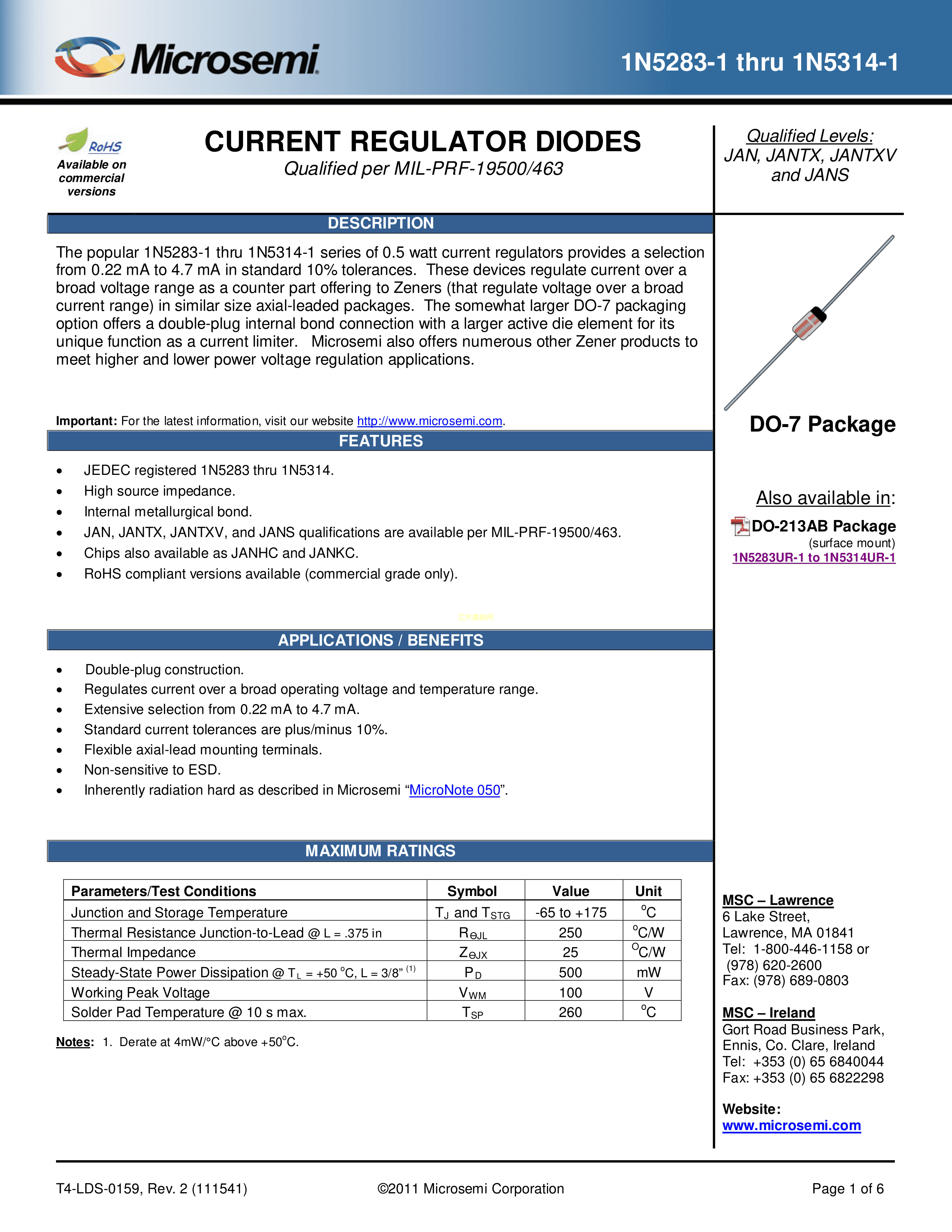 JANTX1N5297-1数据手册DO-7封装Microsemi(美高森美)PDF规格书,中英文下载