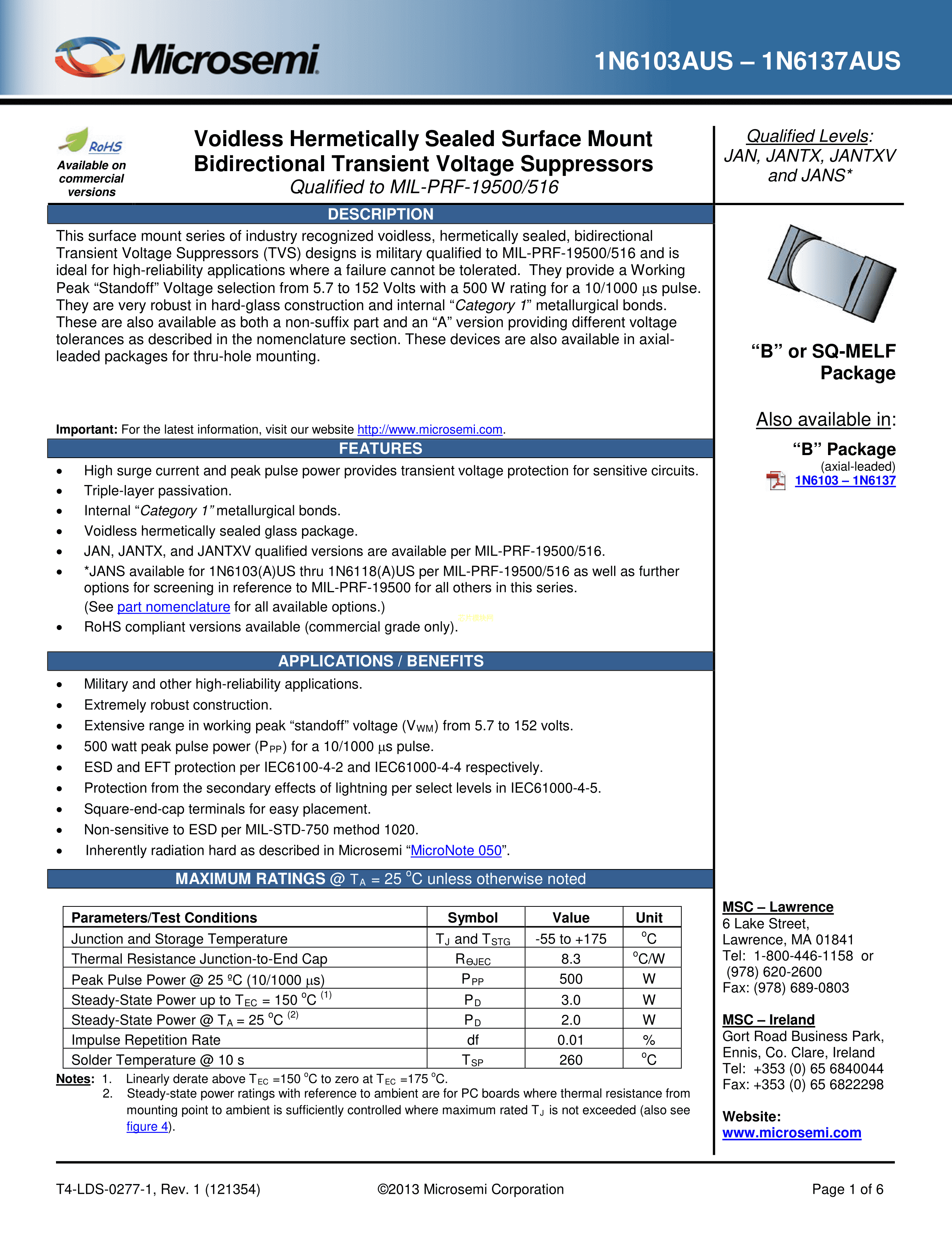 JANTX1N6115US数据手册B-SQ-MELF封装Microsemi(美高森美)PDF规格书,