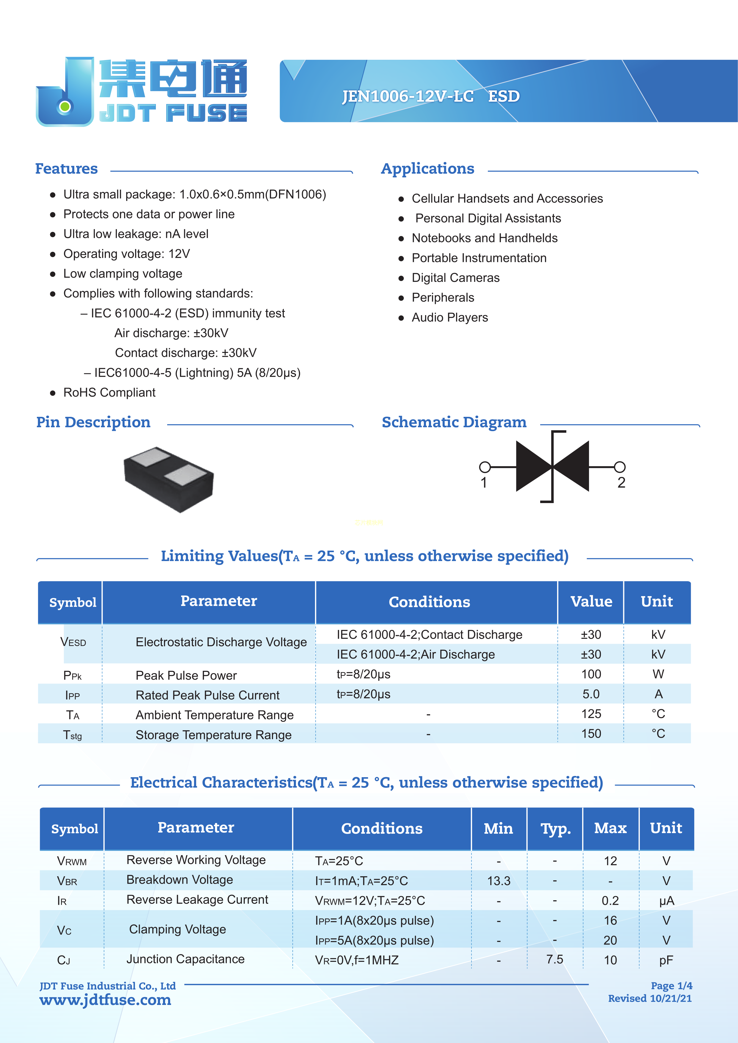 JEN1006-12V-LC数据手册DFN1006封装JDTfuse(集电通)PDF规格书,中英文下