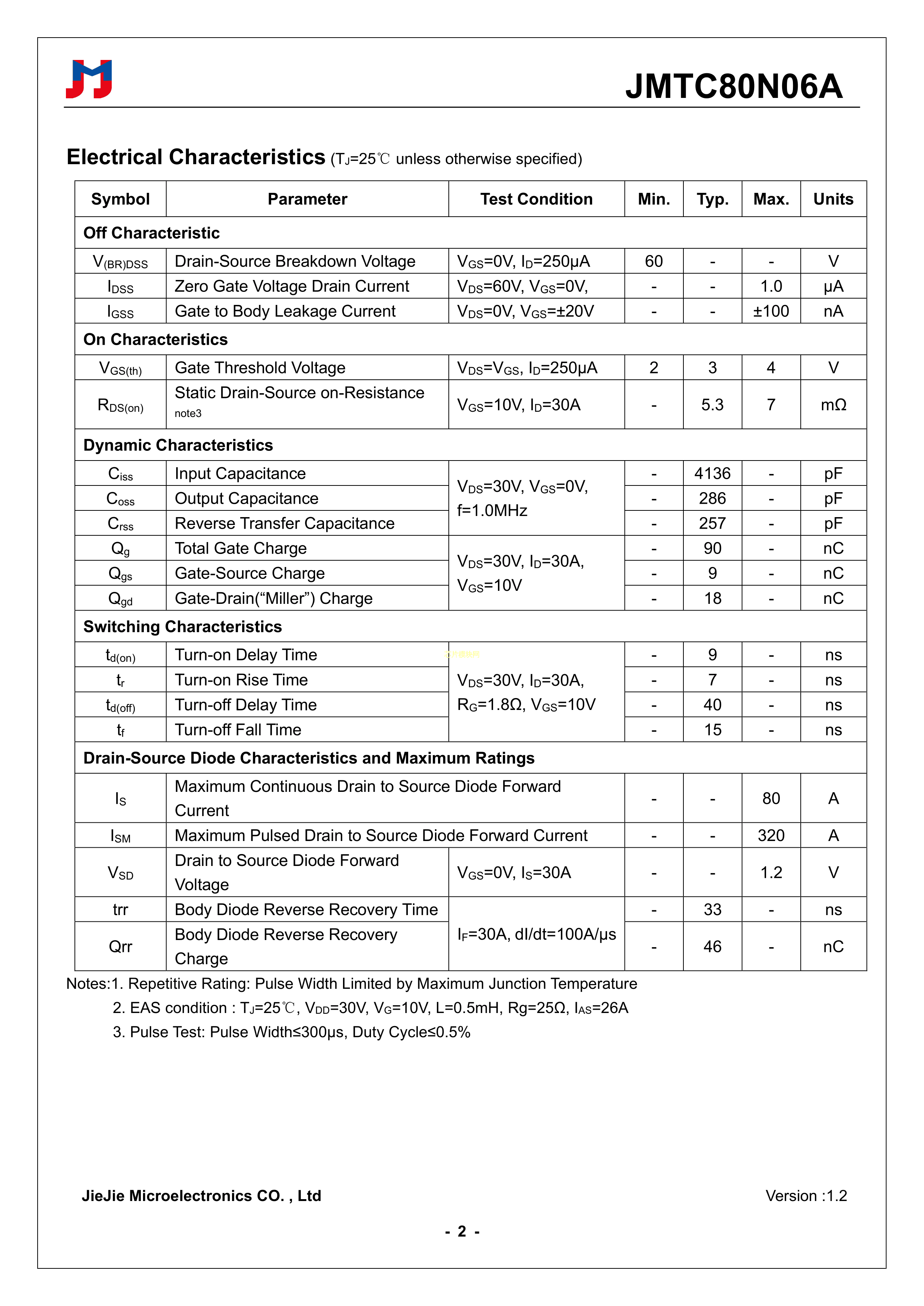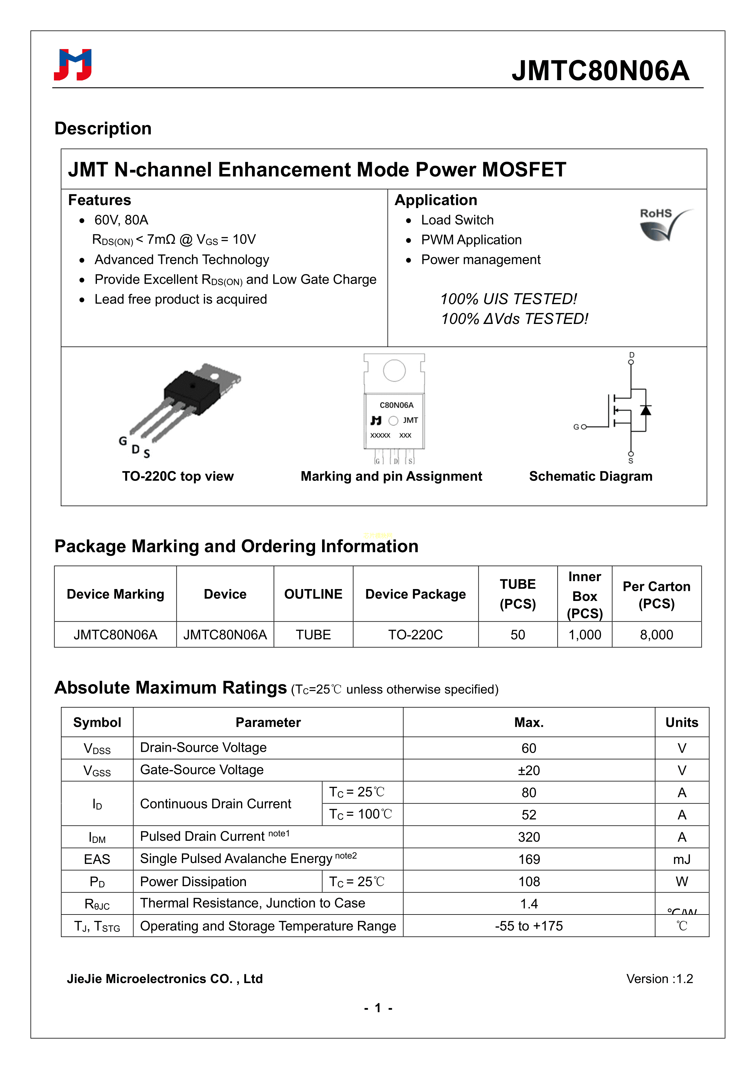 JMTC80N06A数据手册TO-220C封装JJW(捷捷微)PDF规格书,中英文下载