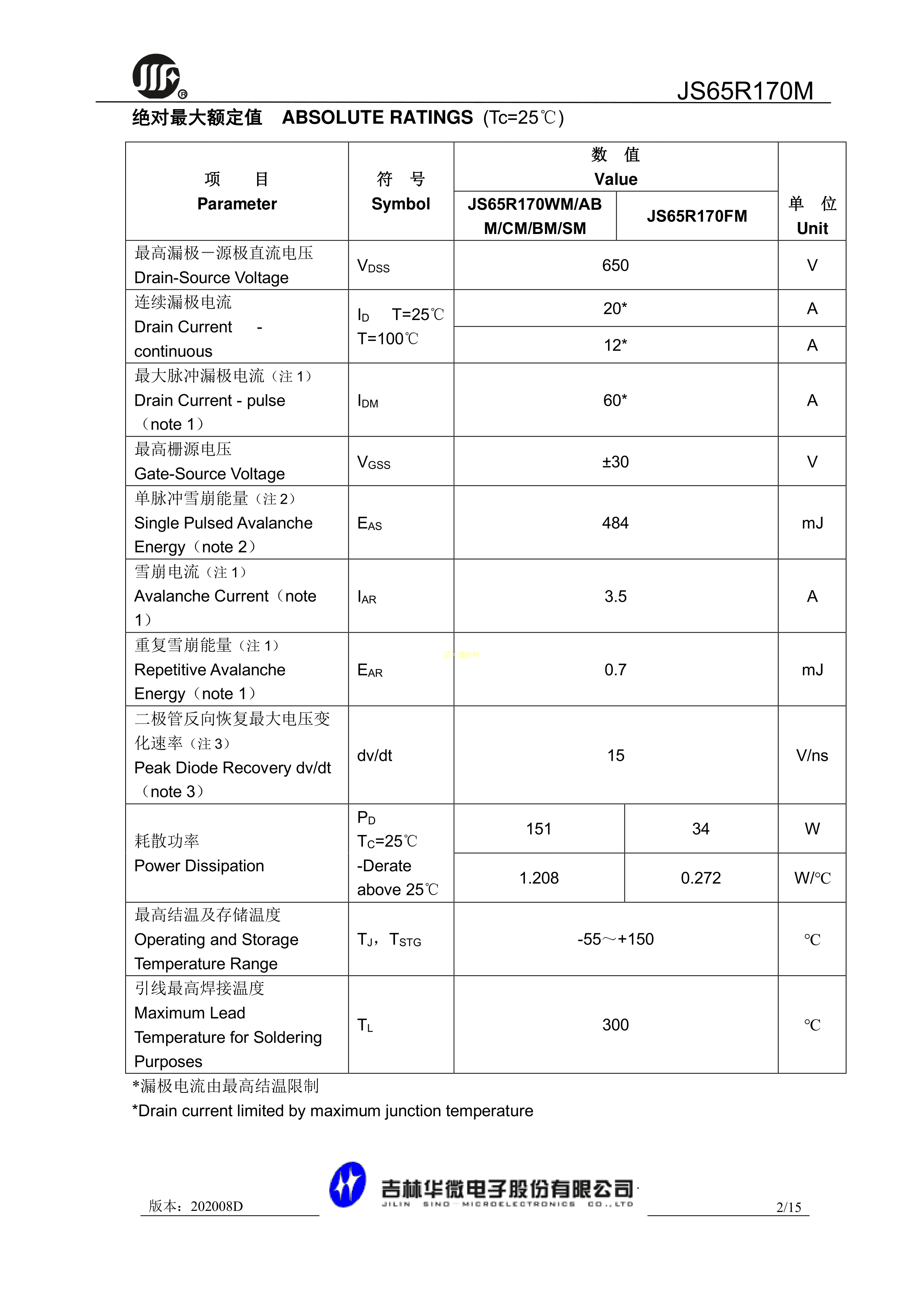 JS65R170WM数据手册TO-247封装吉林华微PDF规格书,中英文下载