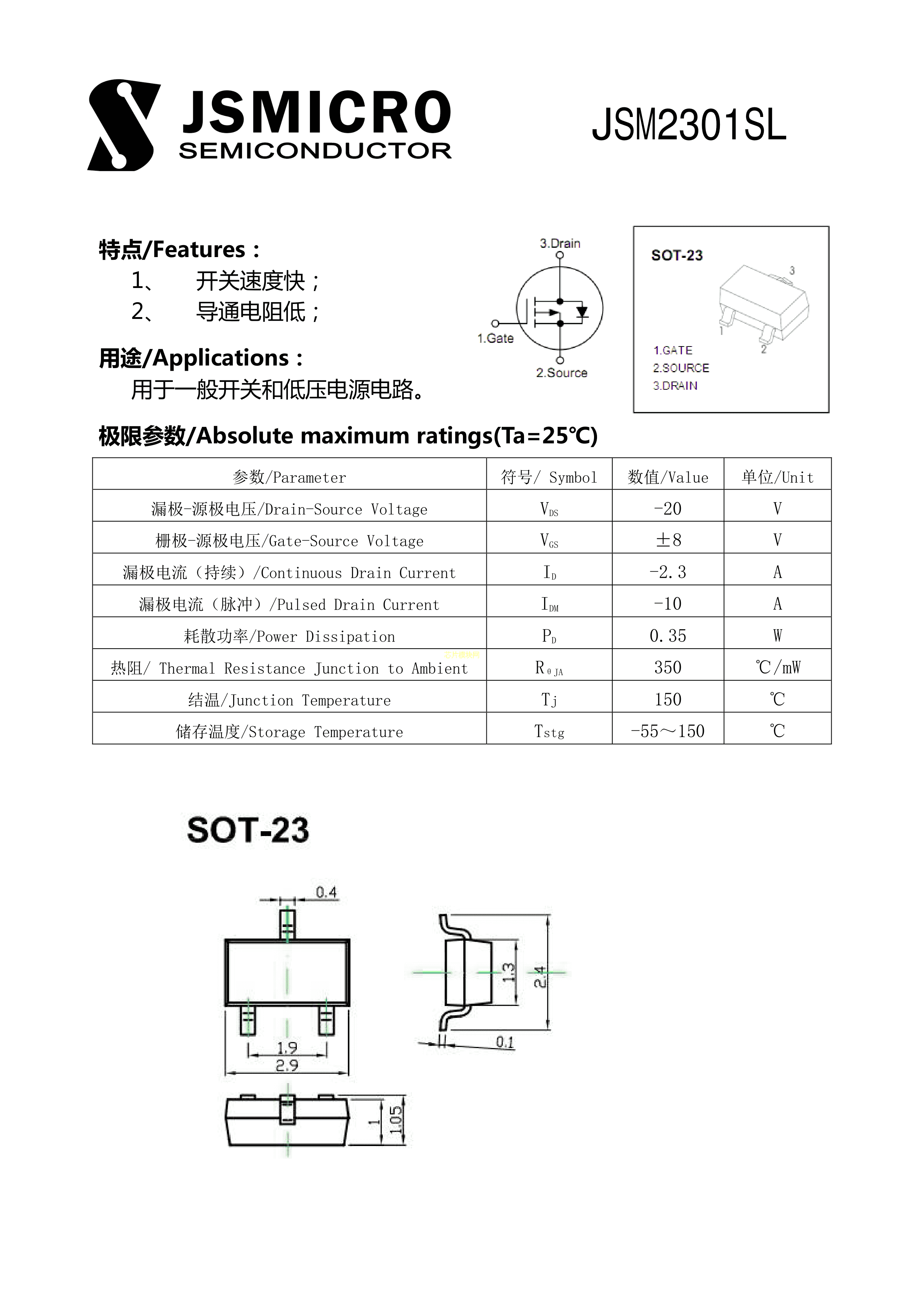 JSM2301SL数据手册SOT-23-3L封装JSMSEMI(杰盛微)PDF规格书,中英文下载