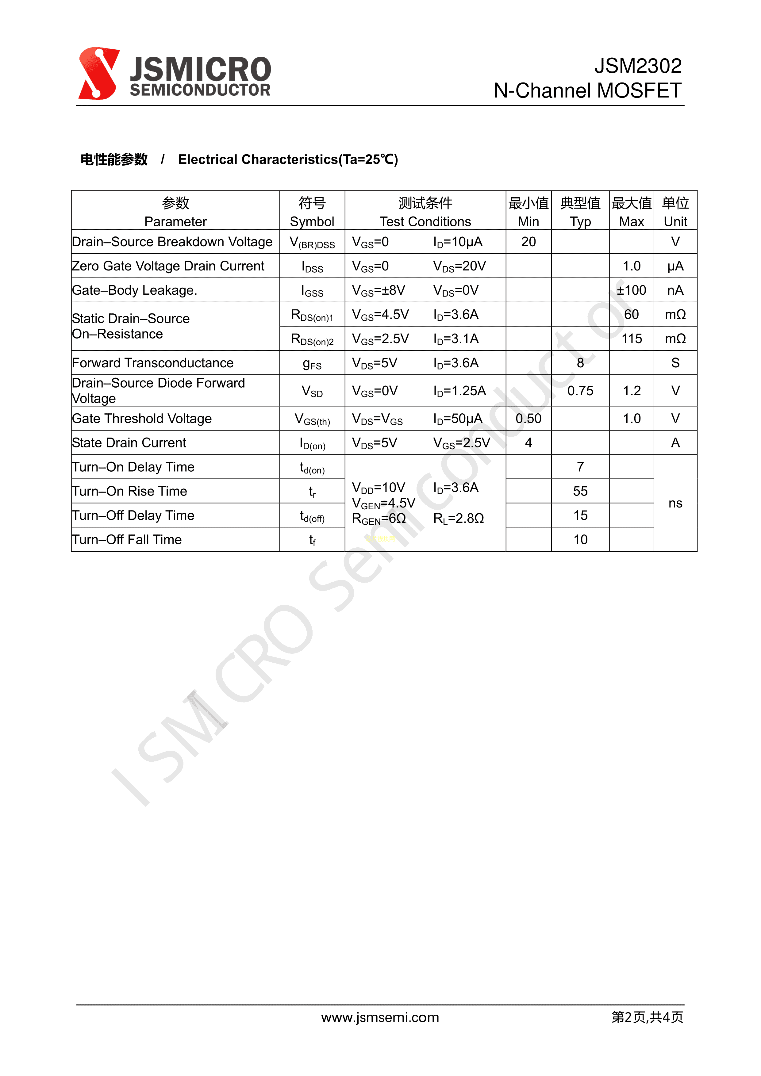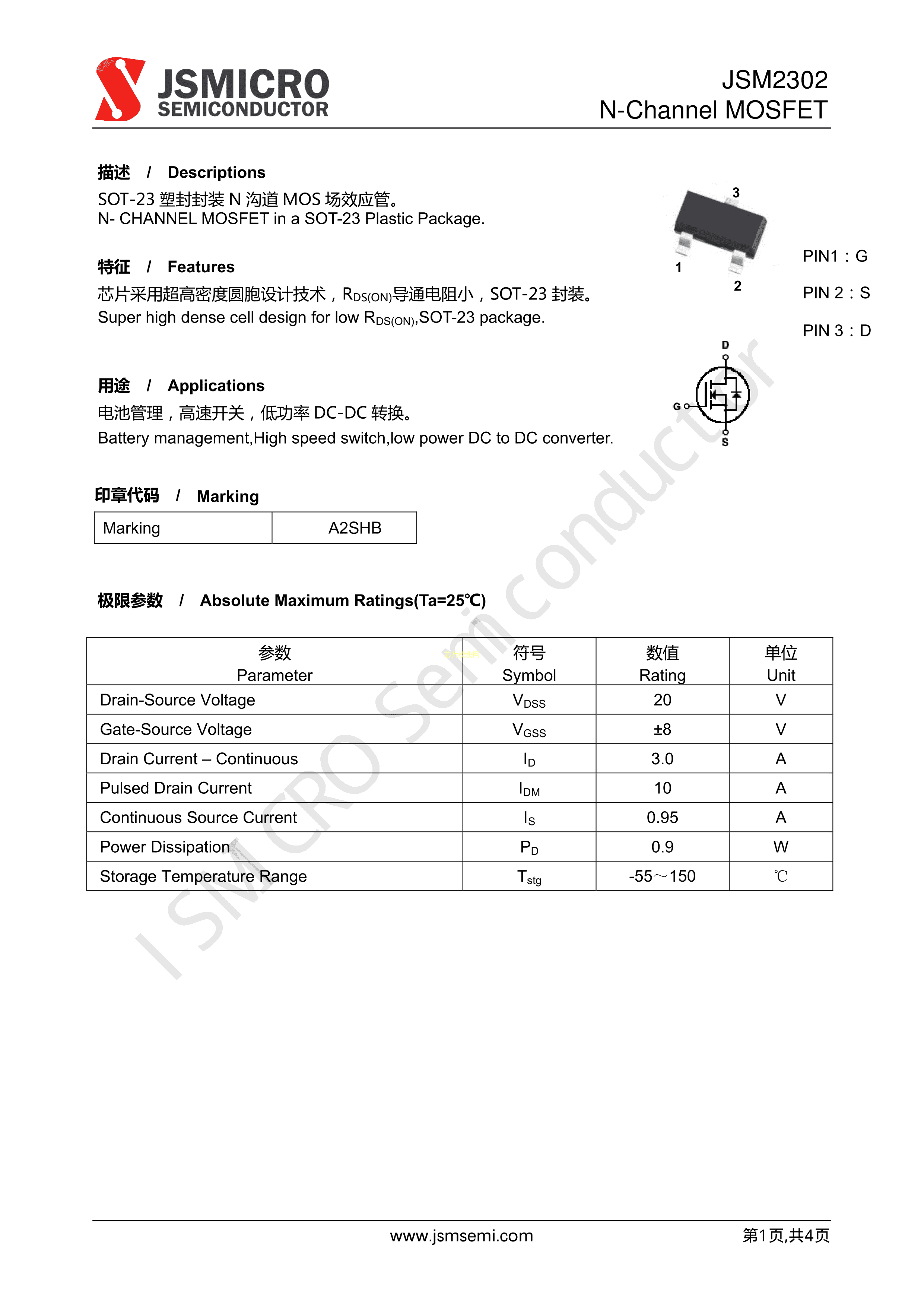 JSM2302数据手册SOT-23封装JSMSEMI(杰盛微)PDF规格书,中英文下载