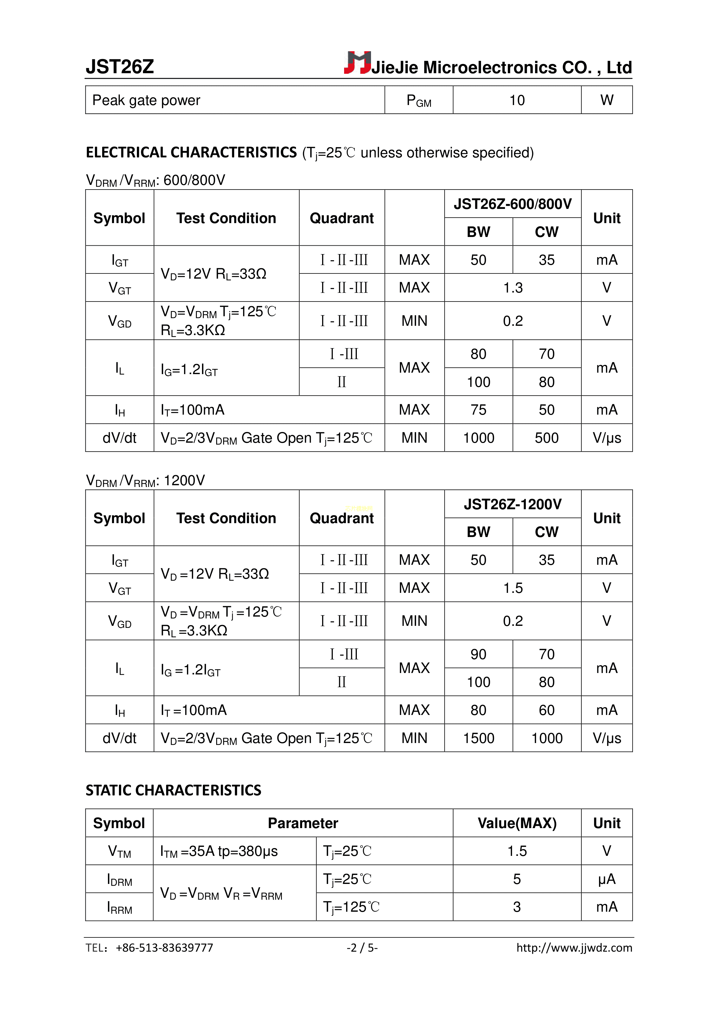 JST26Z-600BW数据手册TO-3P封装JJW(捷捷微)PDF规格书,中英文下载