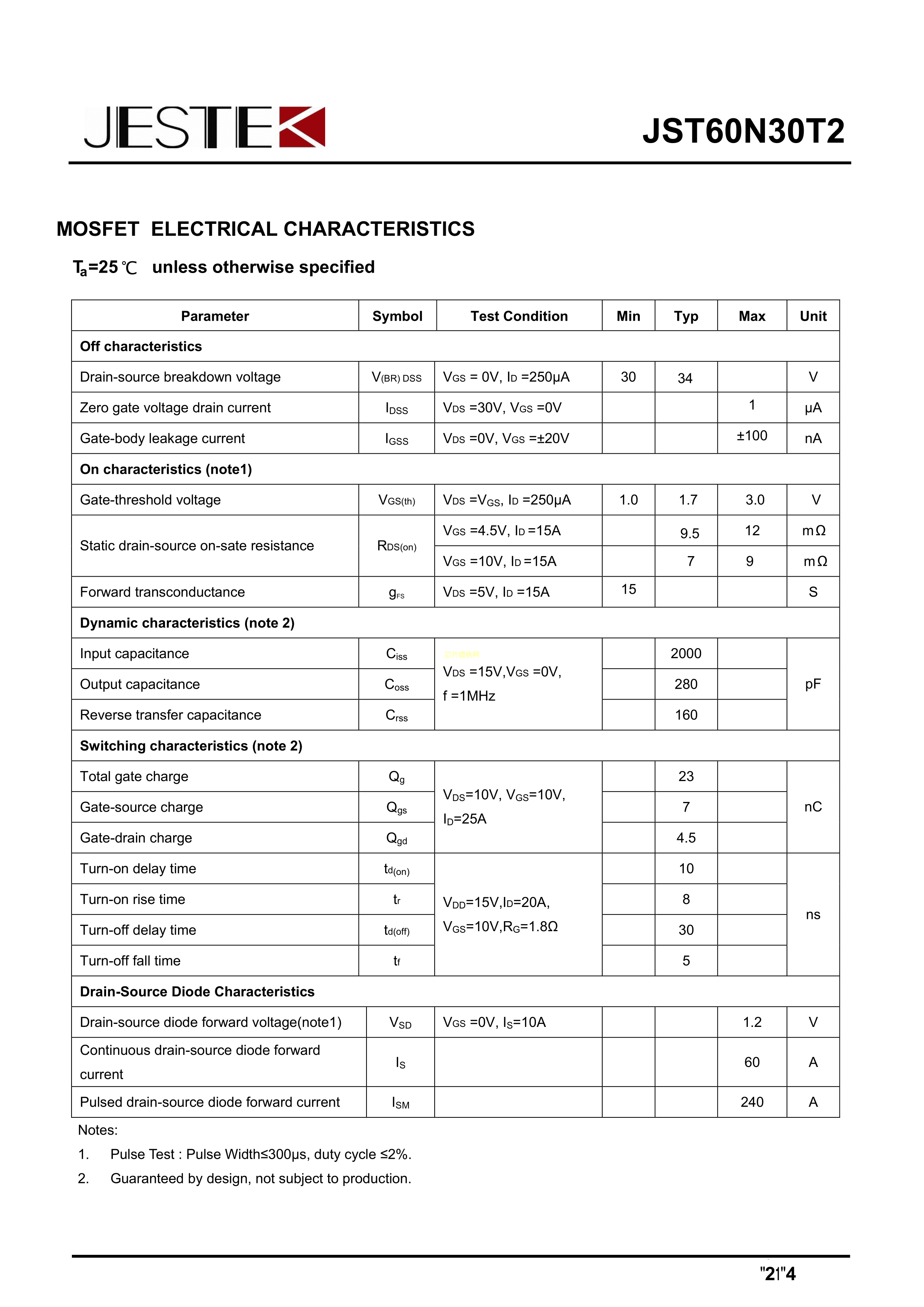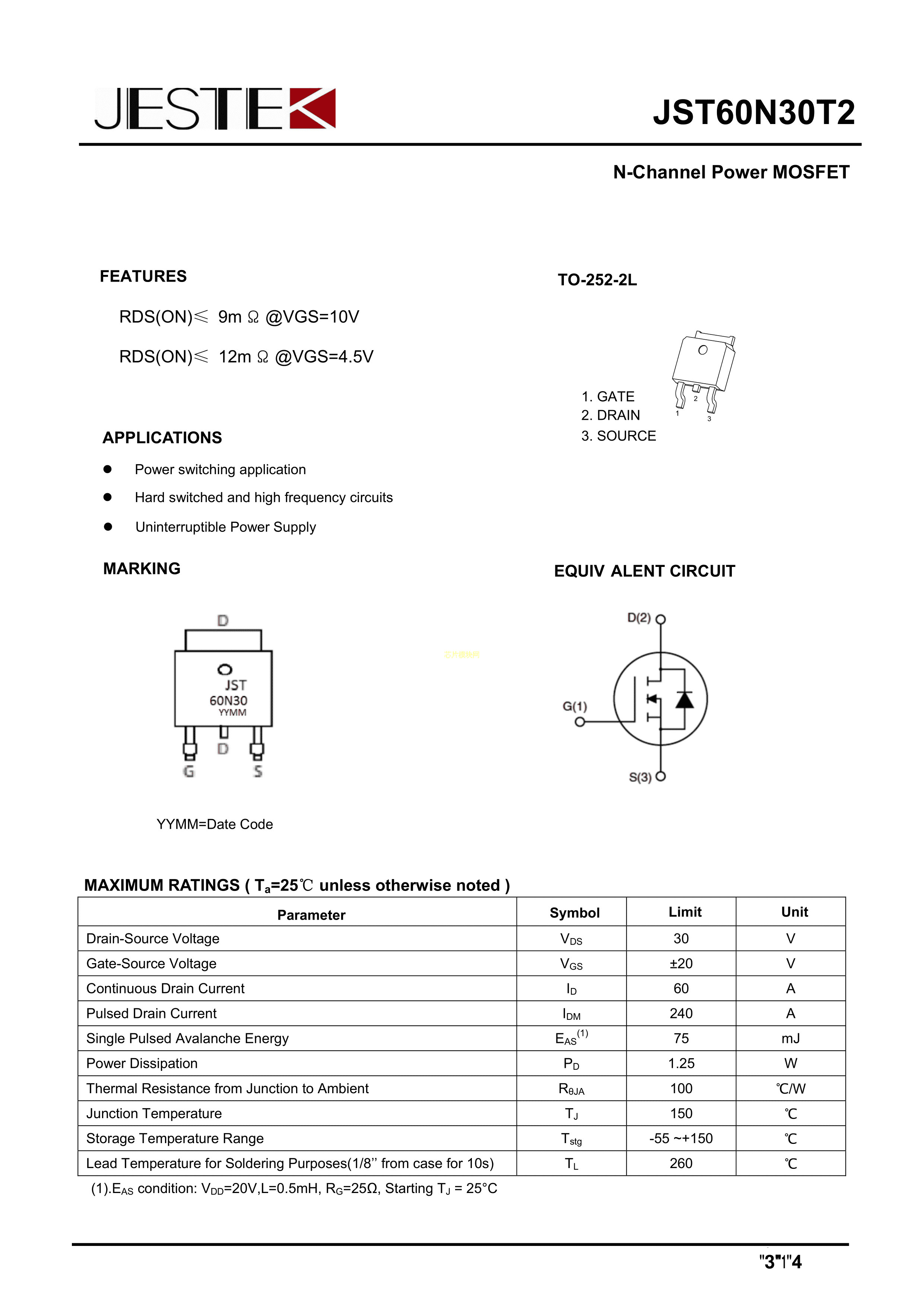 JST60N30T2数据手册TO-252-2L封装JESTEK(吉思泰)PDF规格书,中英文下载