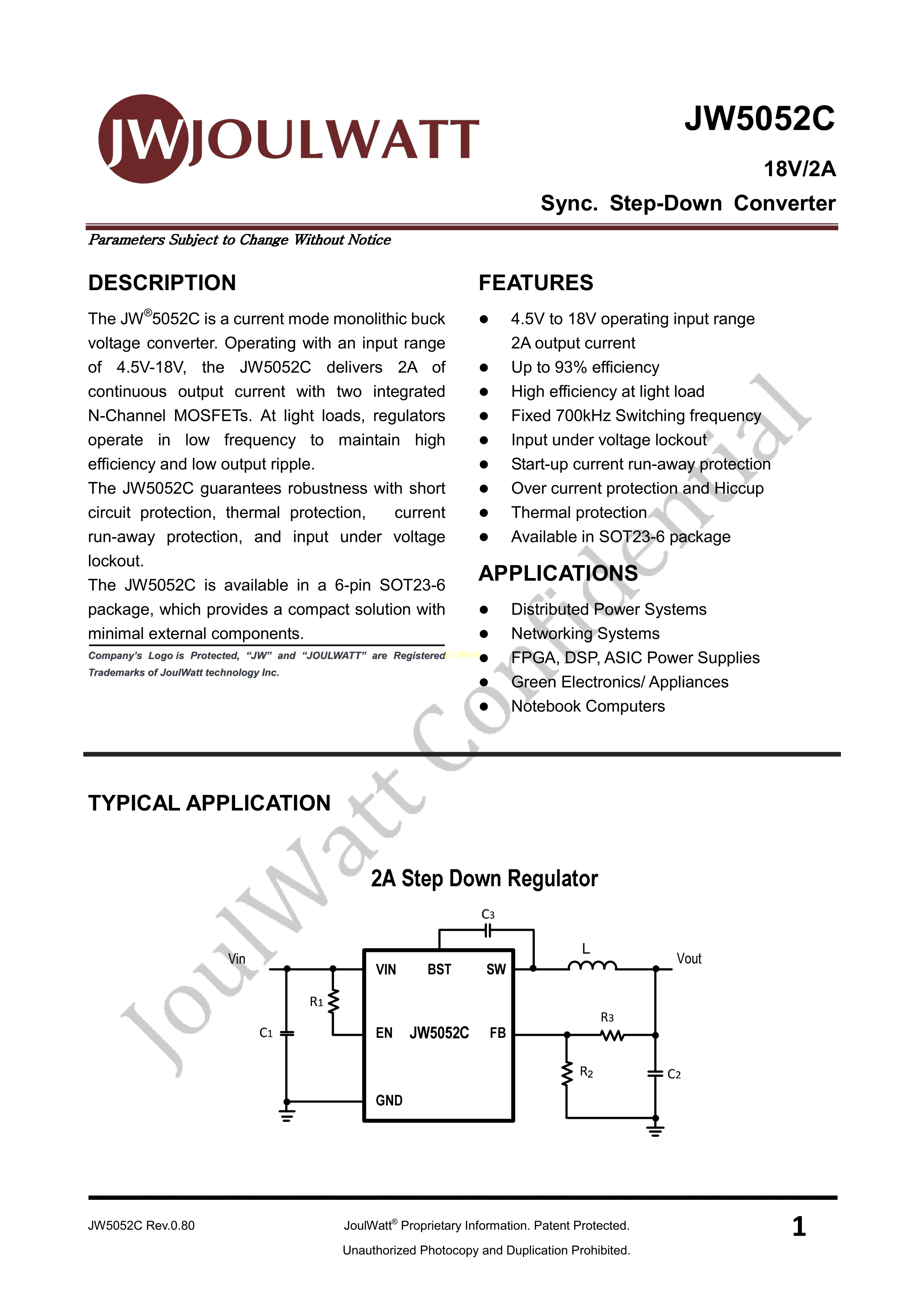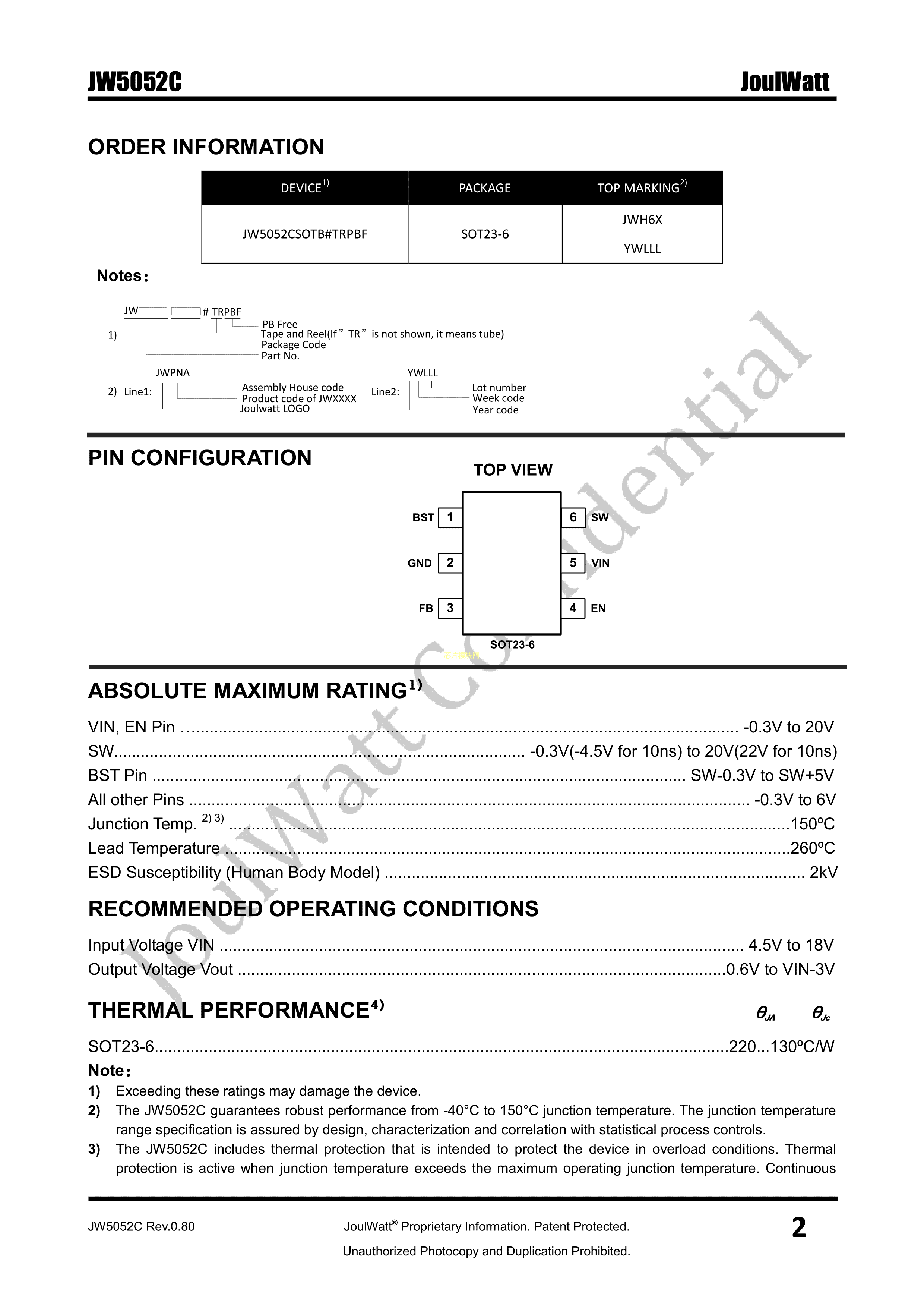 JW5052C数据手册SOT-23-6封装Joulwatt(杰华特)PDF规格书,中英文下载