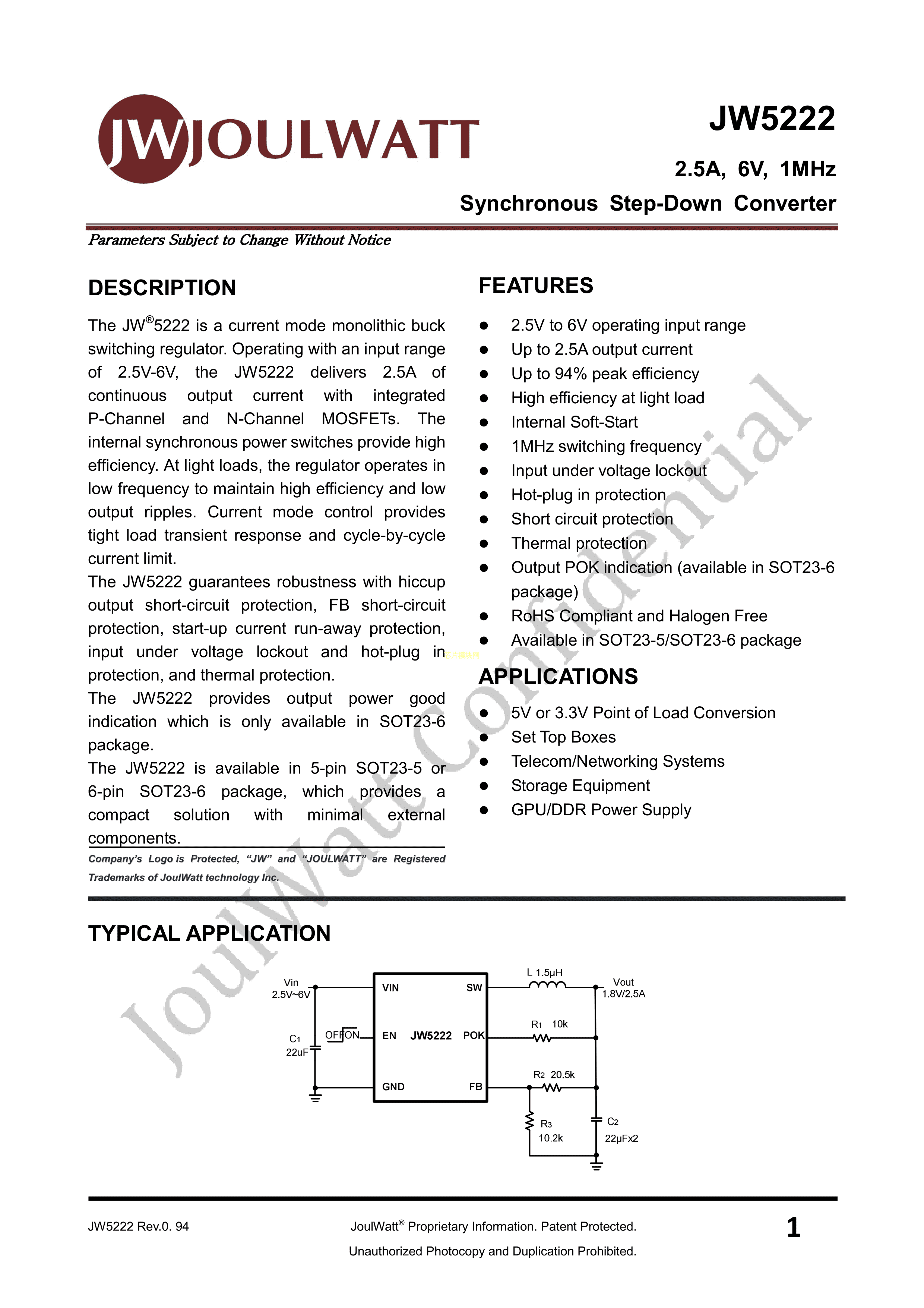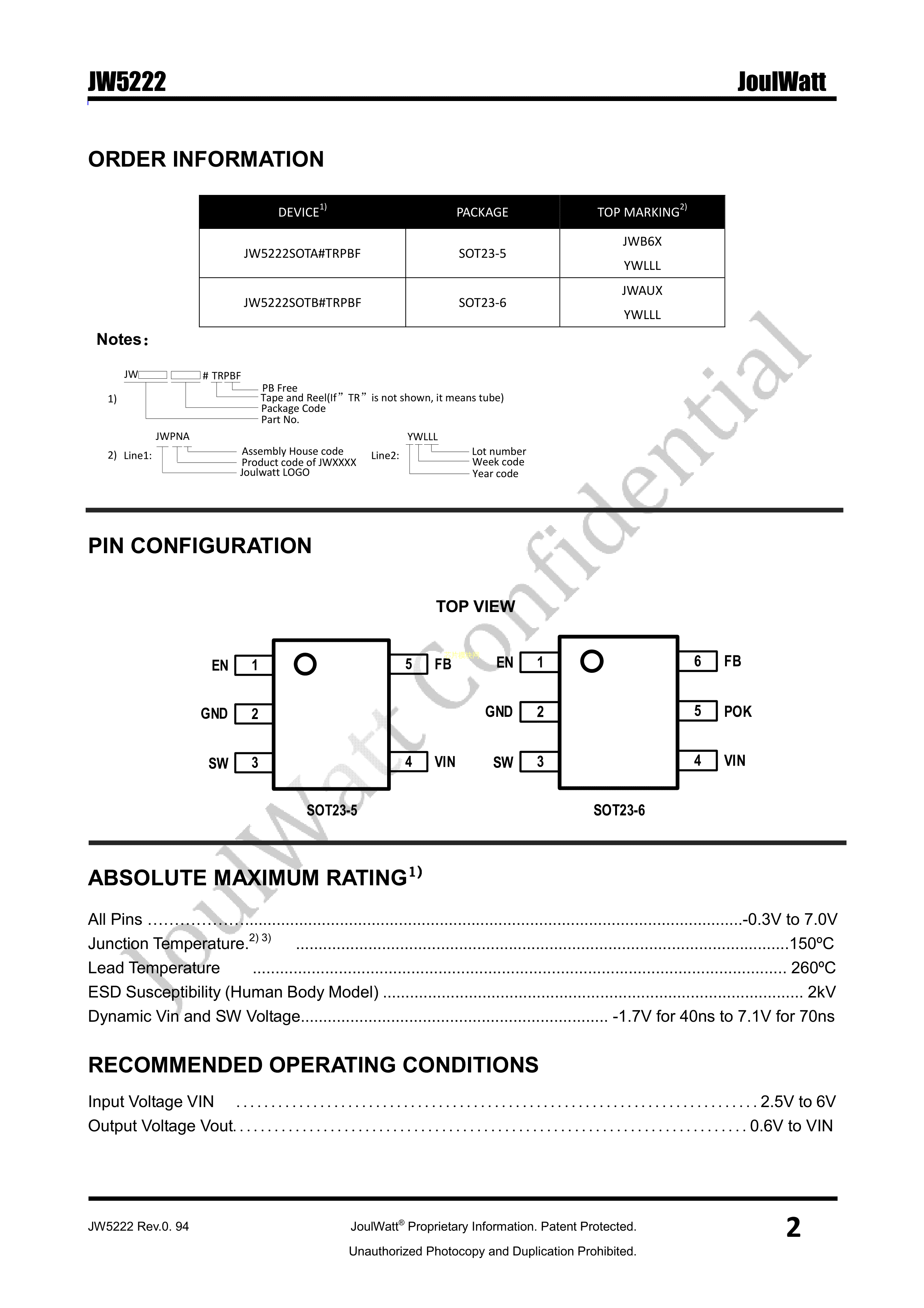 JW5222数据手册SOT-23-5封装Joulwatt(杰华特)PDF规格书,中英文下载