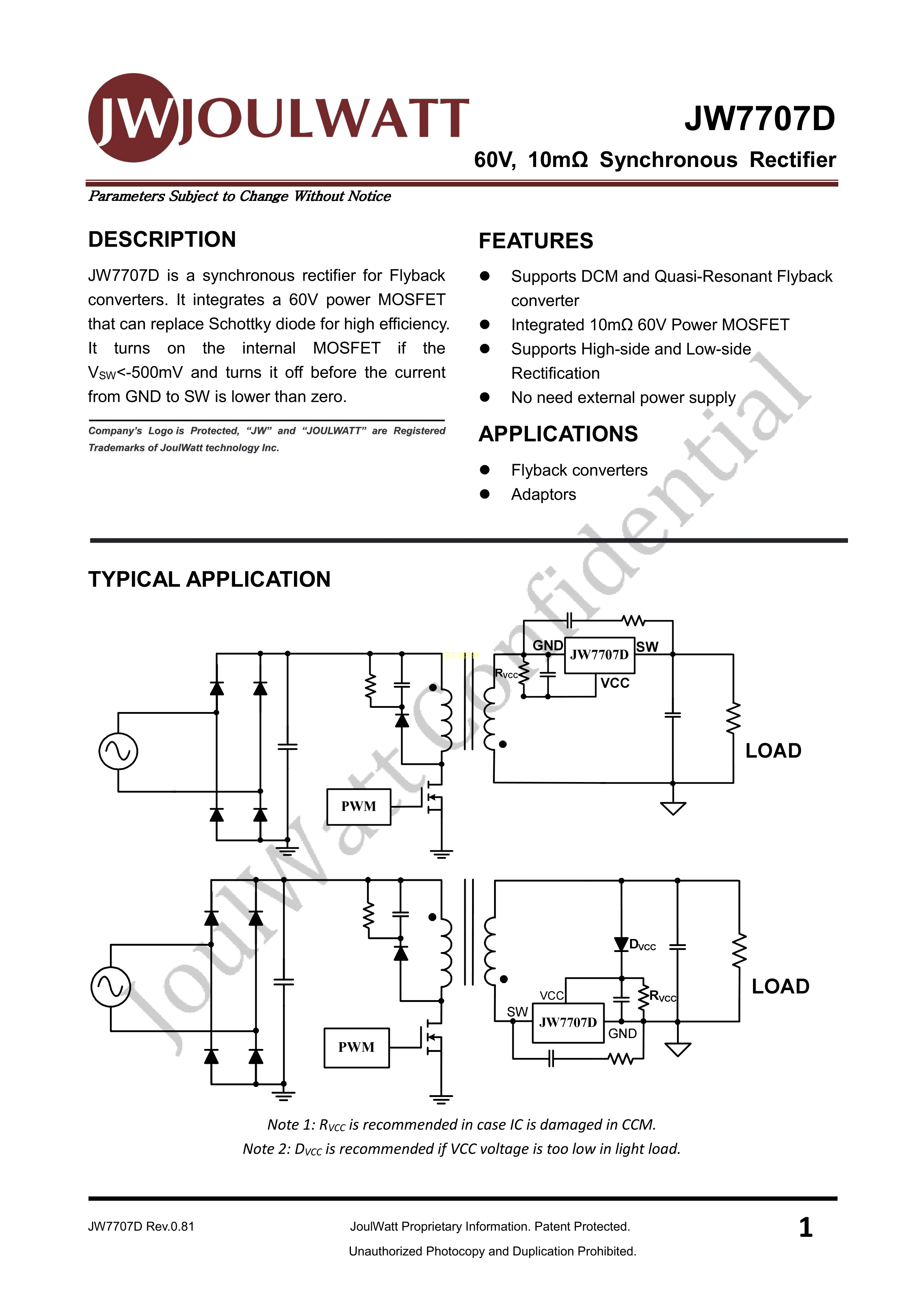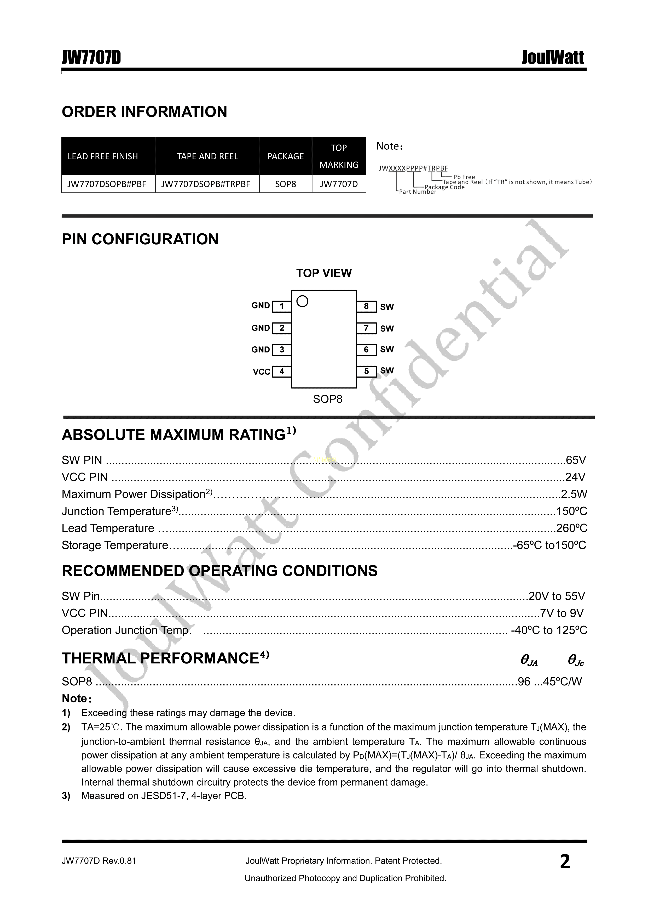 JW7707D数据手册SOP-8封装Joulwatt(杰华特)PDF规格书,中英文下载