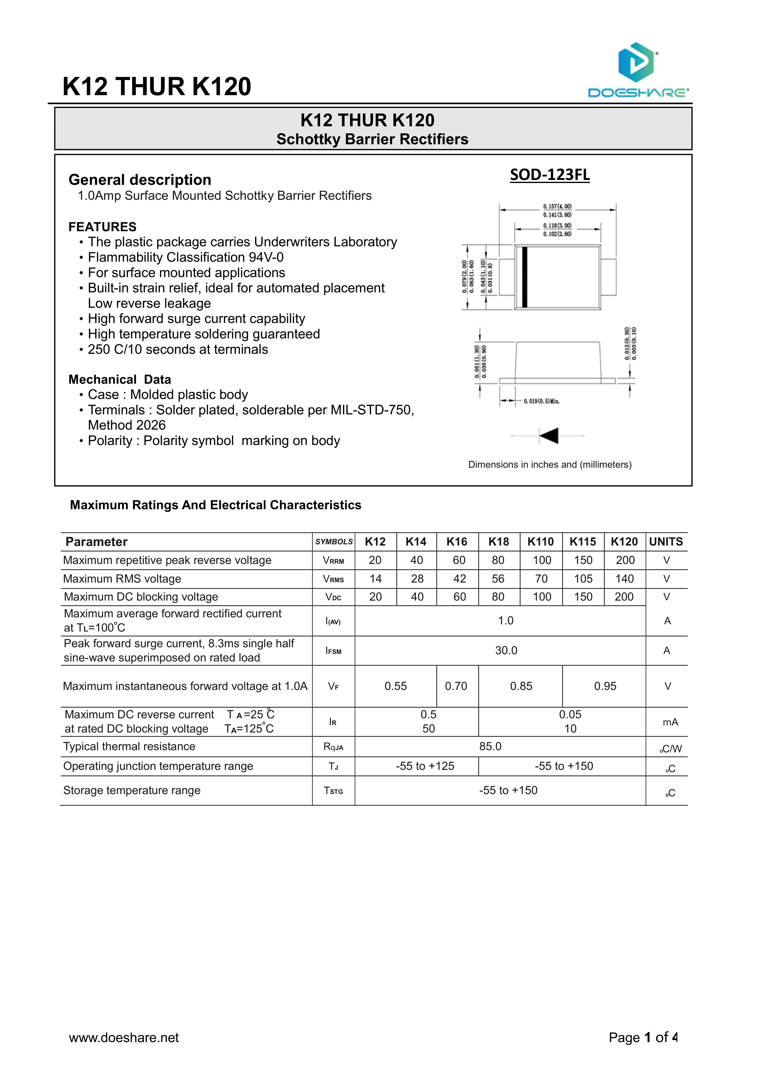 K110数据手册SOD-123FL封装Doeshare(德芯)PDF规格书,中英文下载