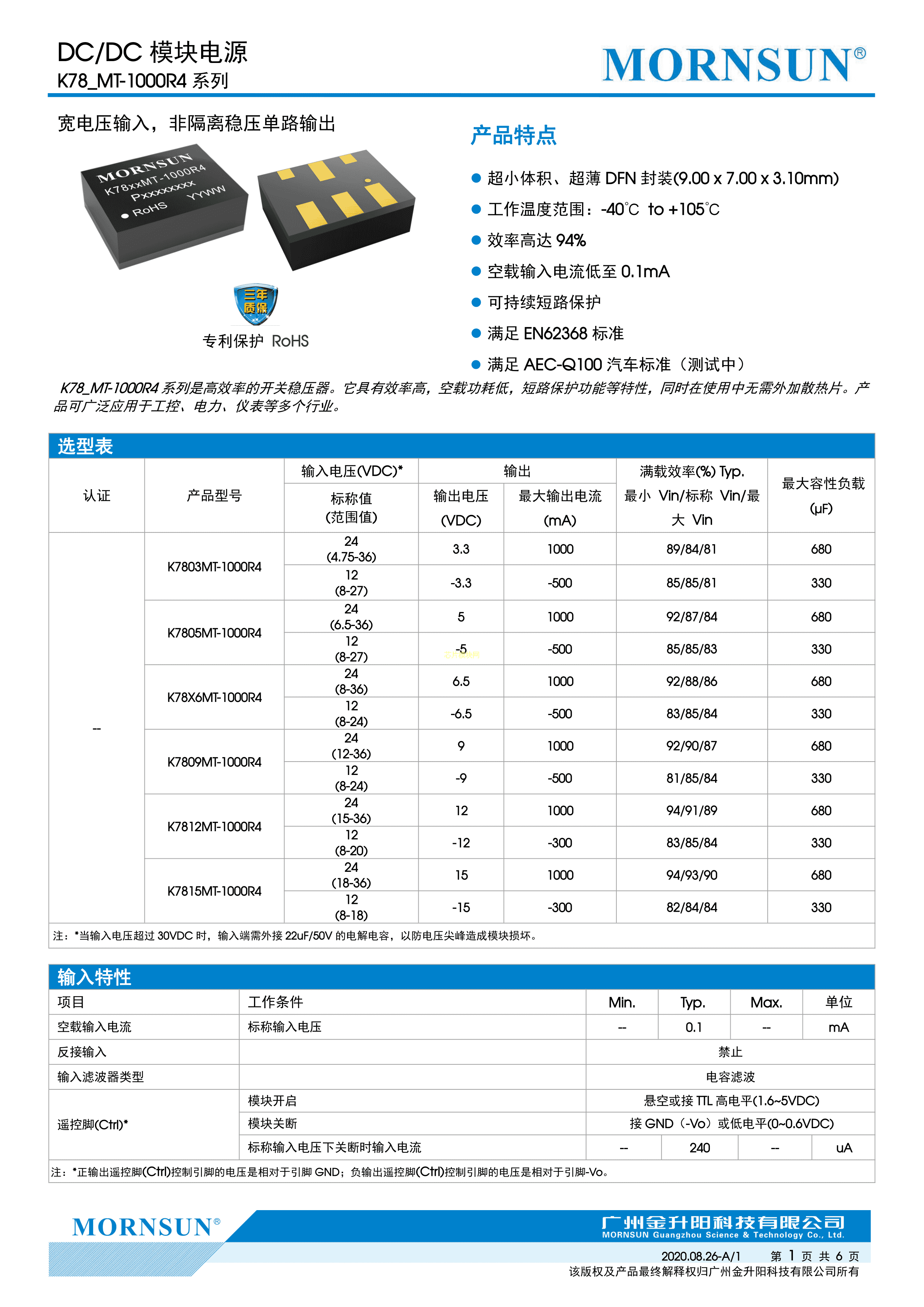 K7805MT-1000R4数据手册-封装MORNSUN(金升阳)PDF规格书,中英文下载