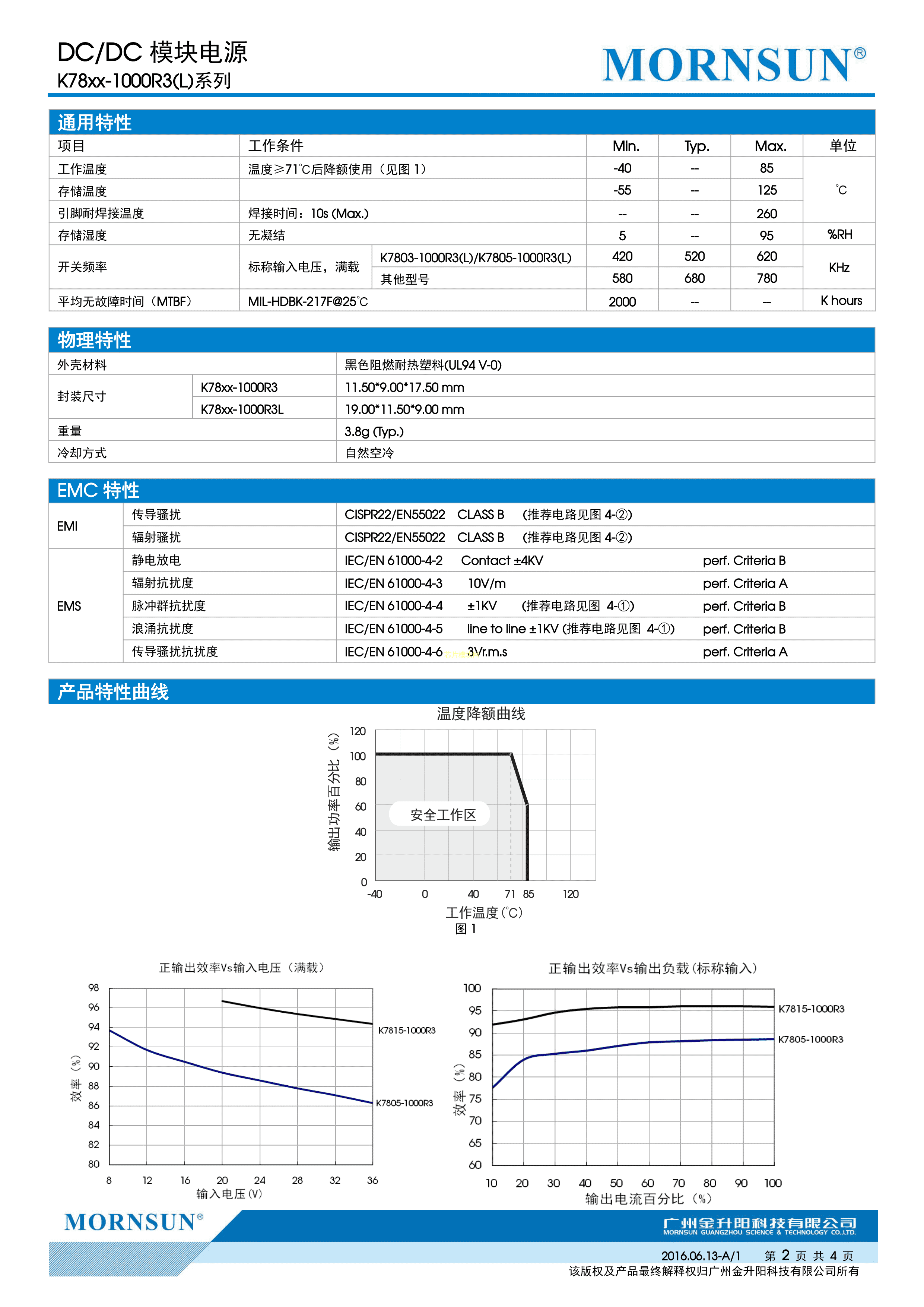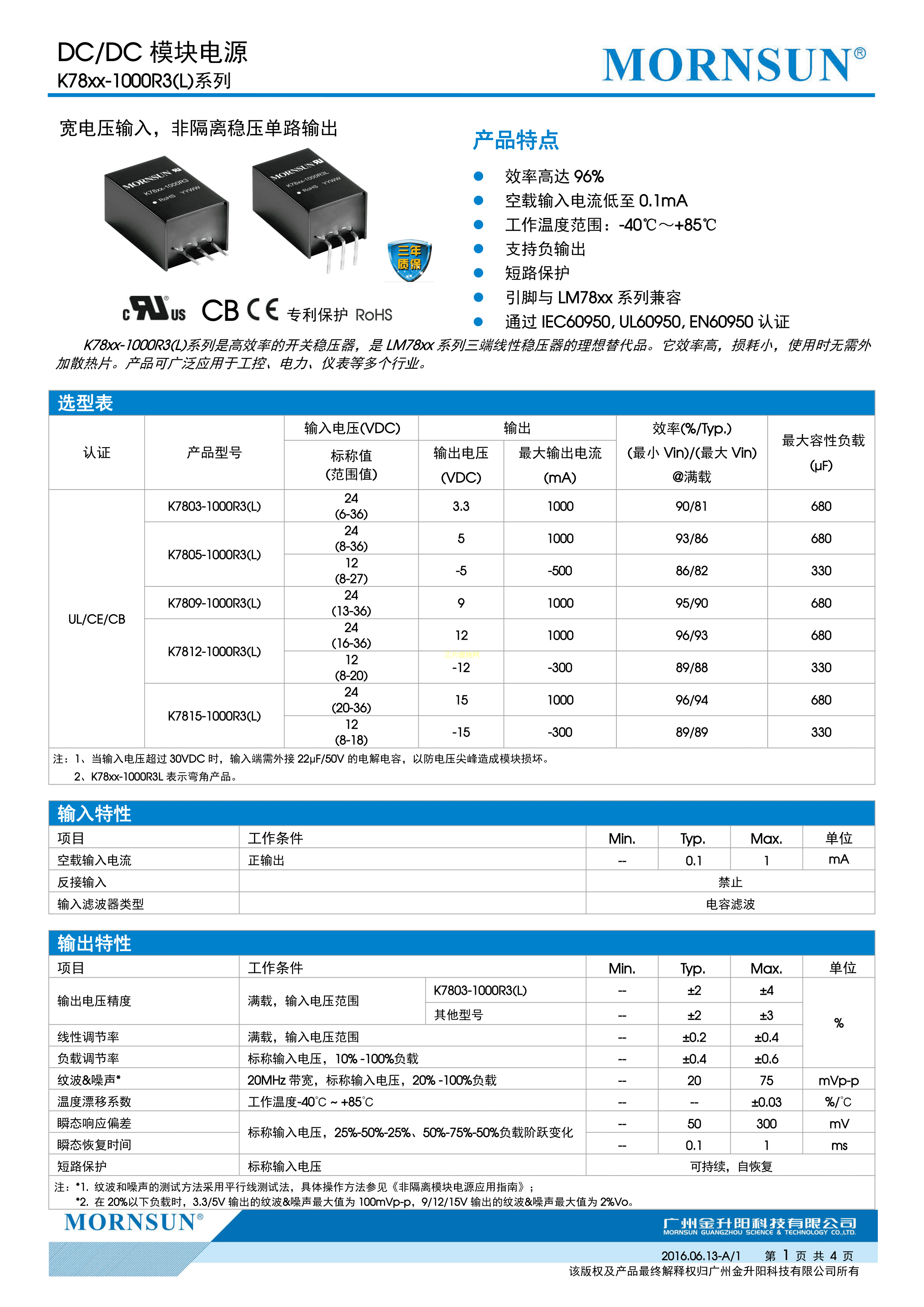 K7812-1000R3L数据手册插件封装MORNSUN(金升阳)PDF规格书,中英文下载