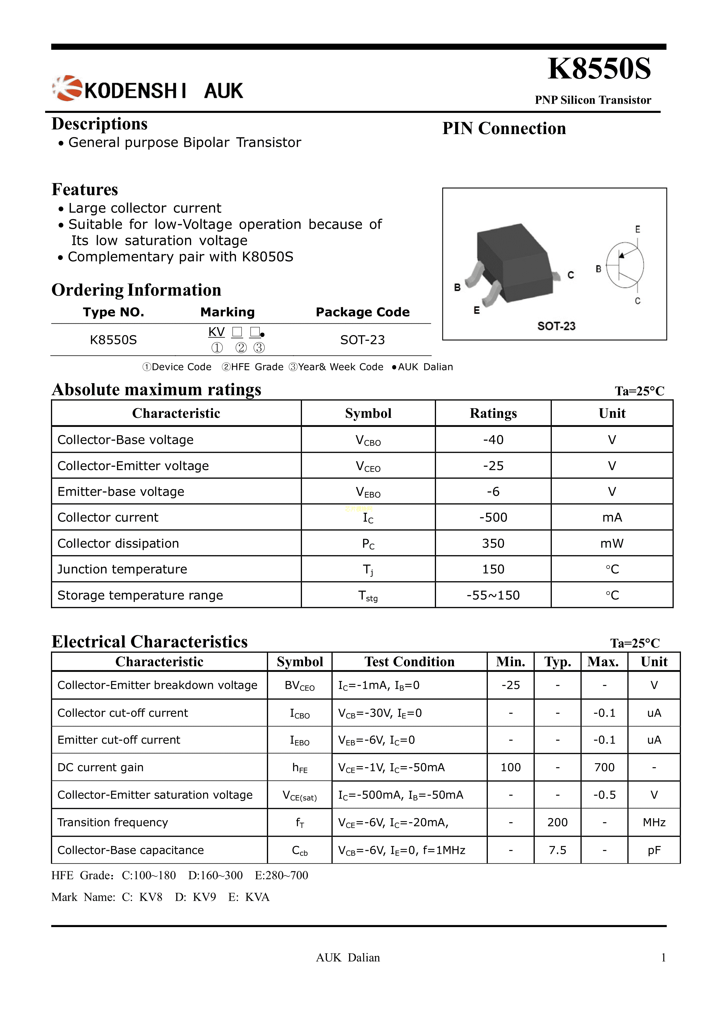 K8550SCD数据手册SOT-23封装KODENSHIAUK(光电子)PDF规格书,中英文下载
