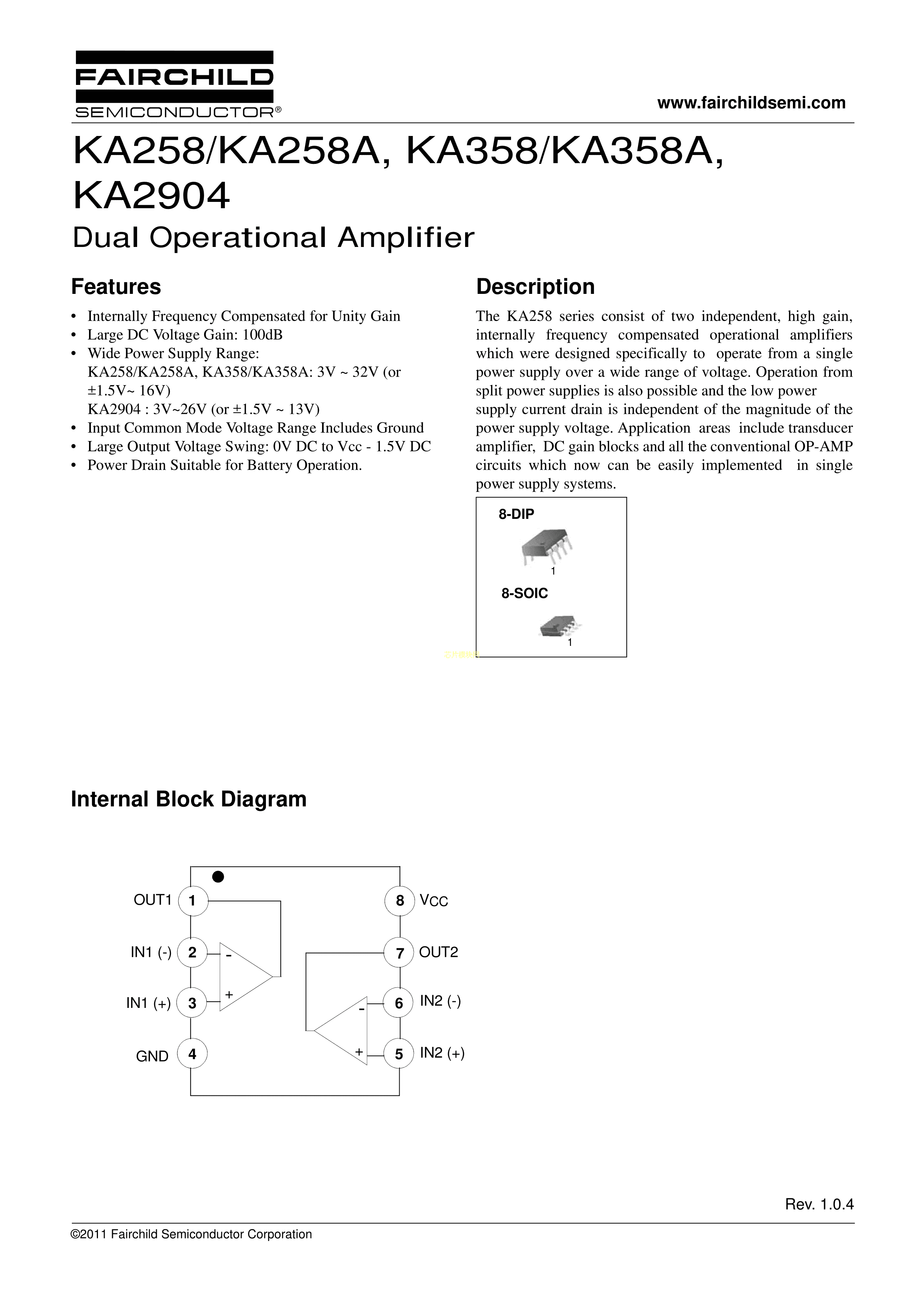 KA2904DTF数据手册SOIC-8_150mil封装onsemi(安森美)PDF规格书,中英文下