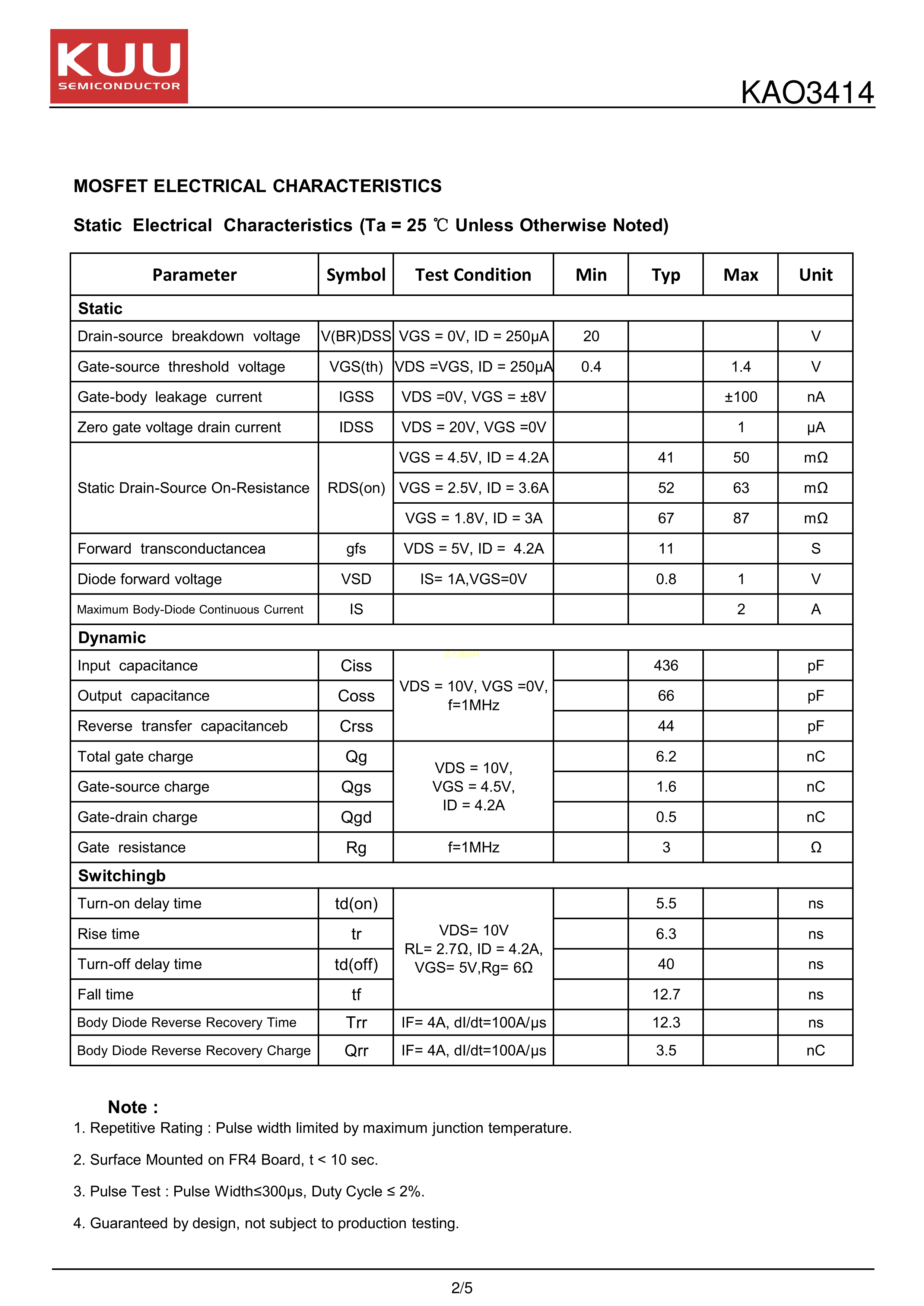 KAO3414数据手册SOT-23封装KUUPDF规格书,中英文下载