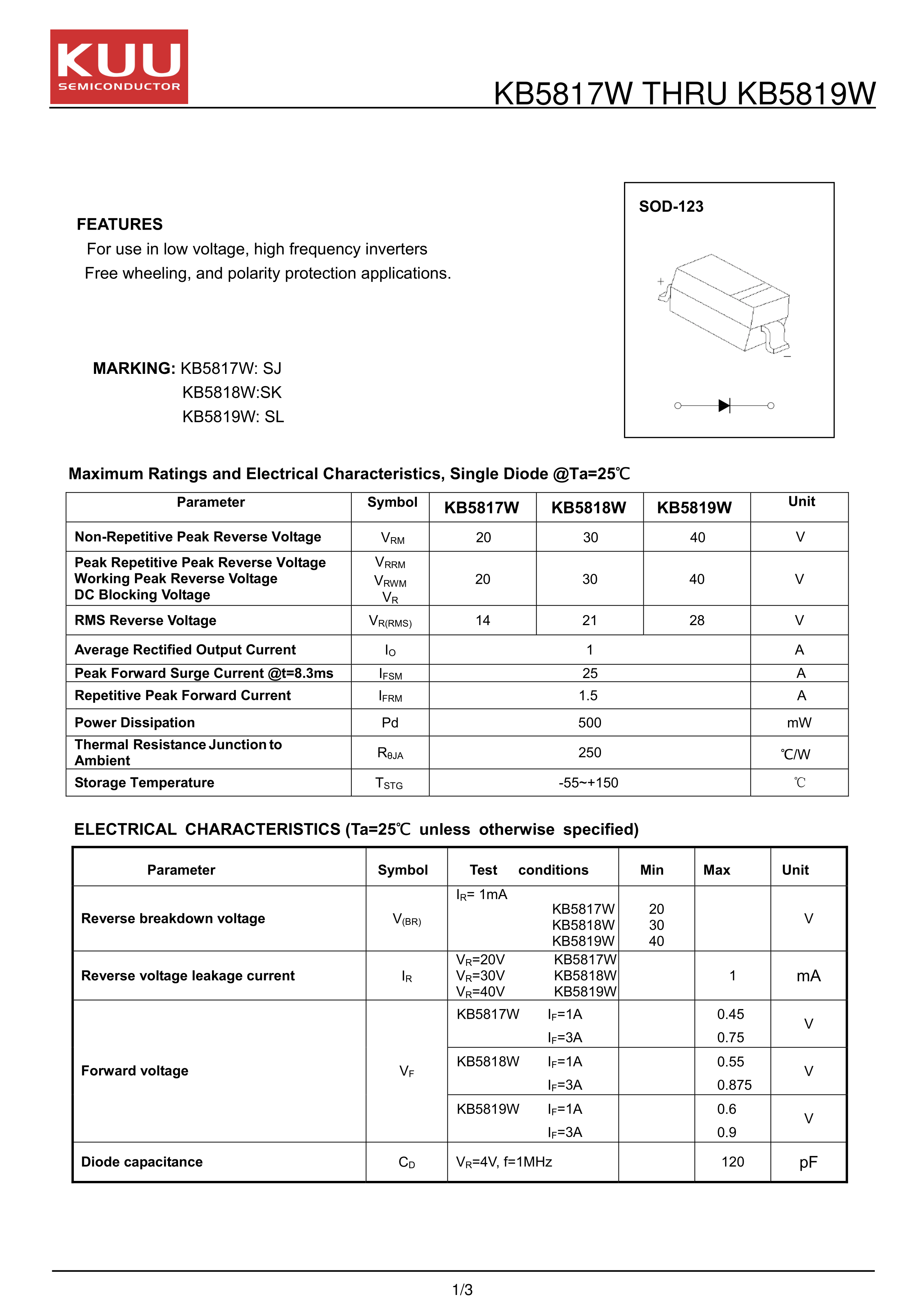 KB5819W数据手册SOD-123封装KUUPDF规格书,中英文下载