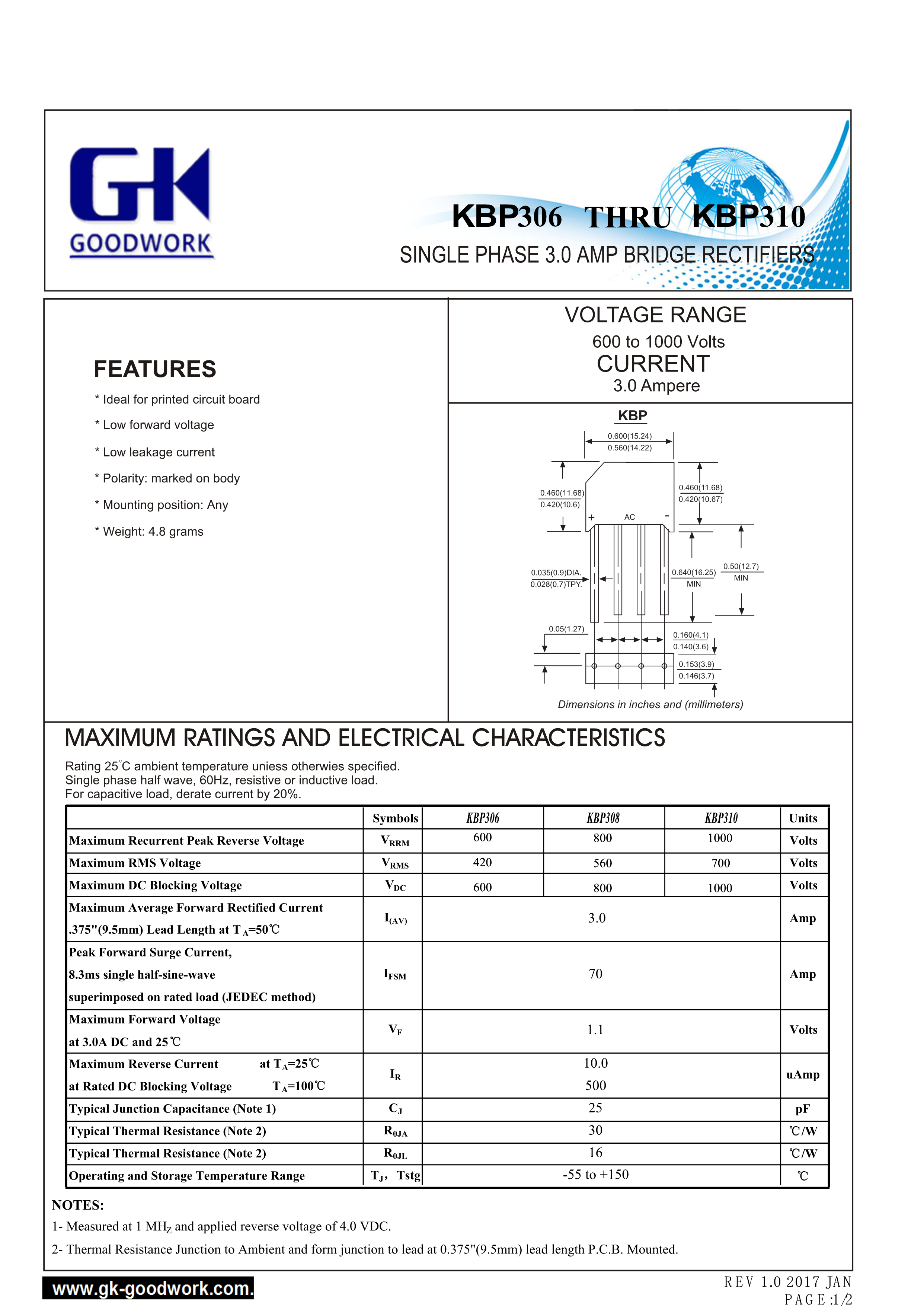 KBP310数据手册KBP封装GOODWORK(固得沃克)PDF规格书,中英文下载
