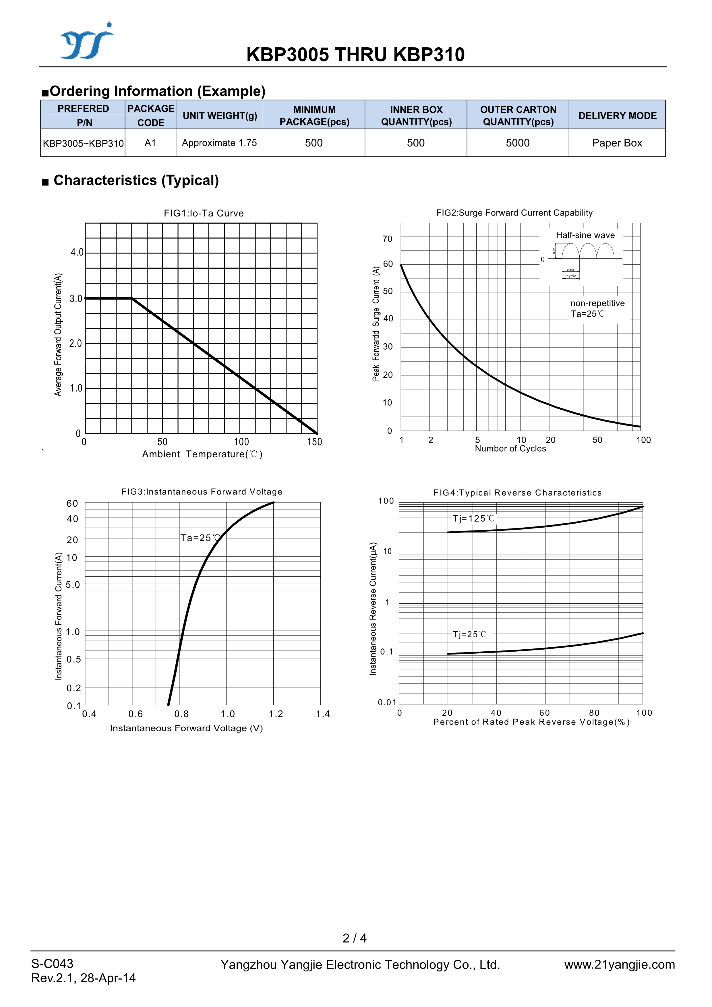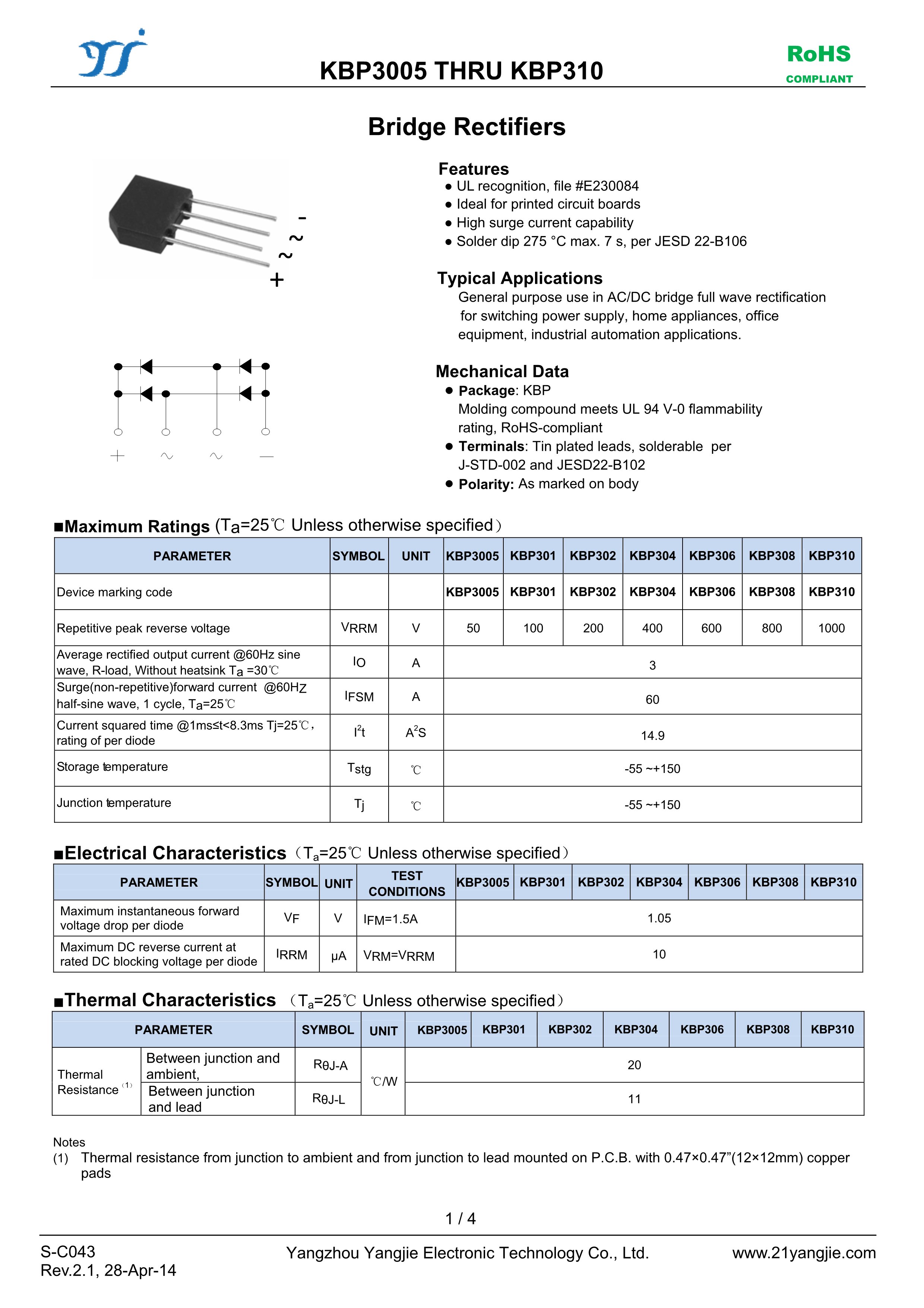 KBP310数据手册KBP封装YANGJIE(扬杰)PDF规格书,中英文下载