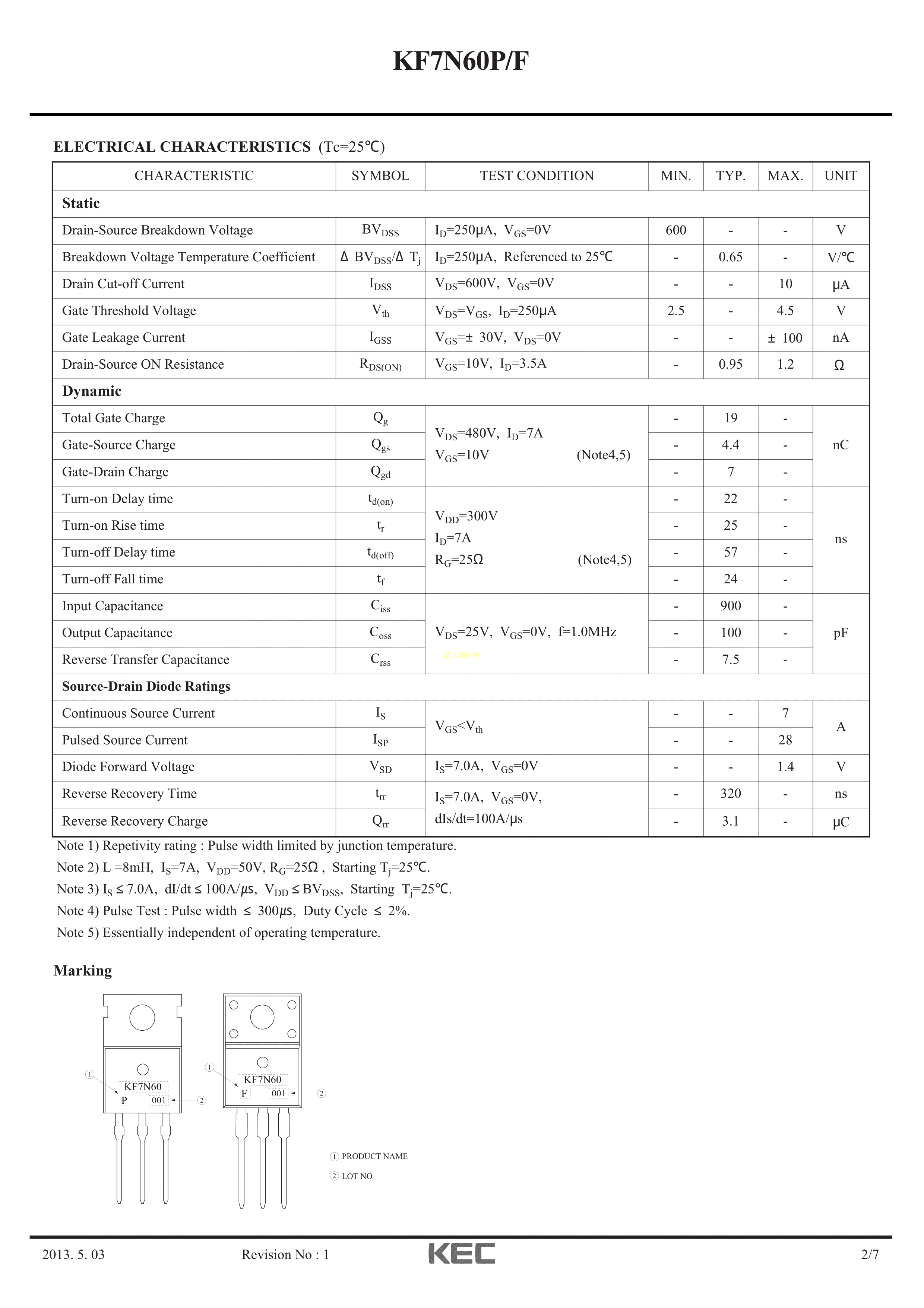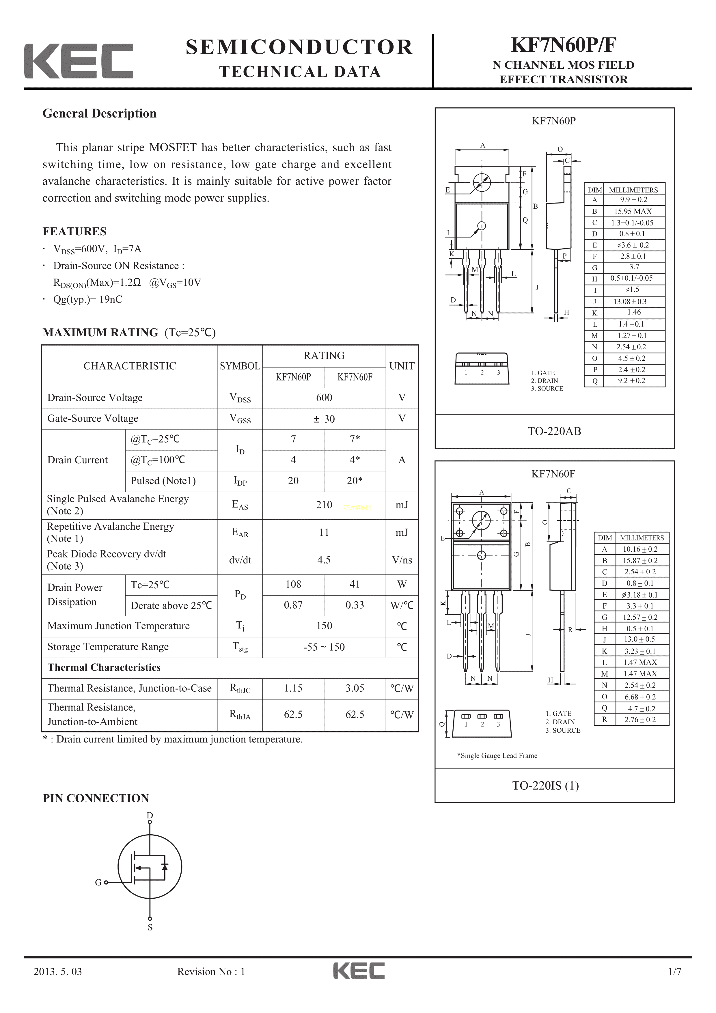 KF7N60F-U-PSF数据手册TO-220F(TO-220IS)封装KECPDF规格书,中英文下