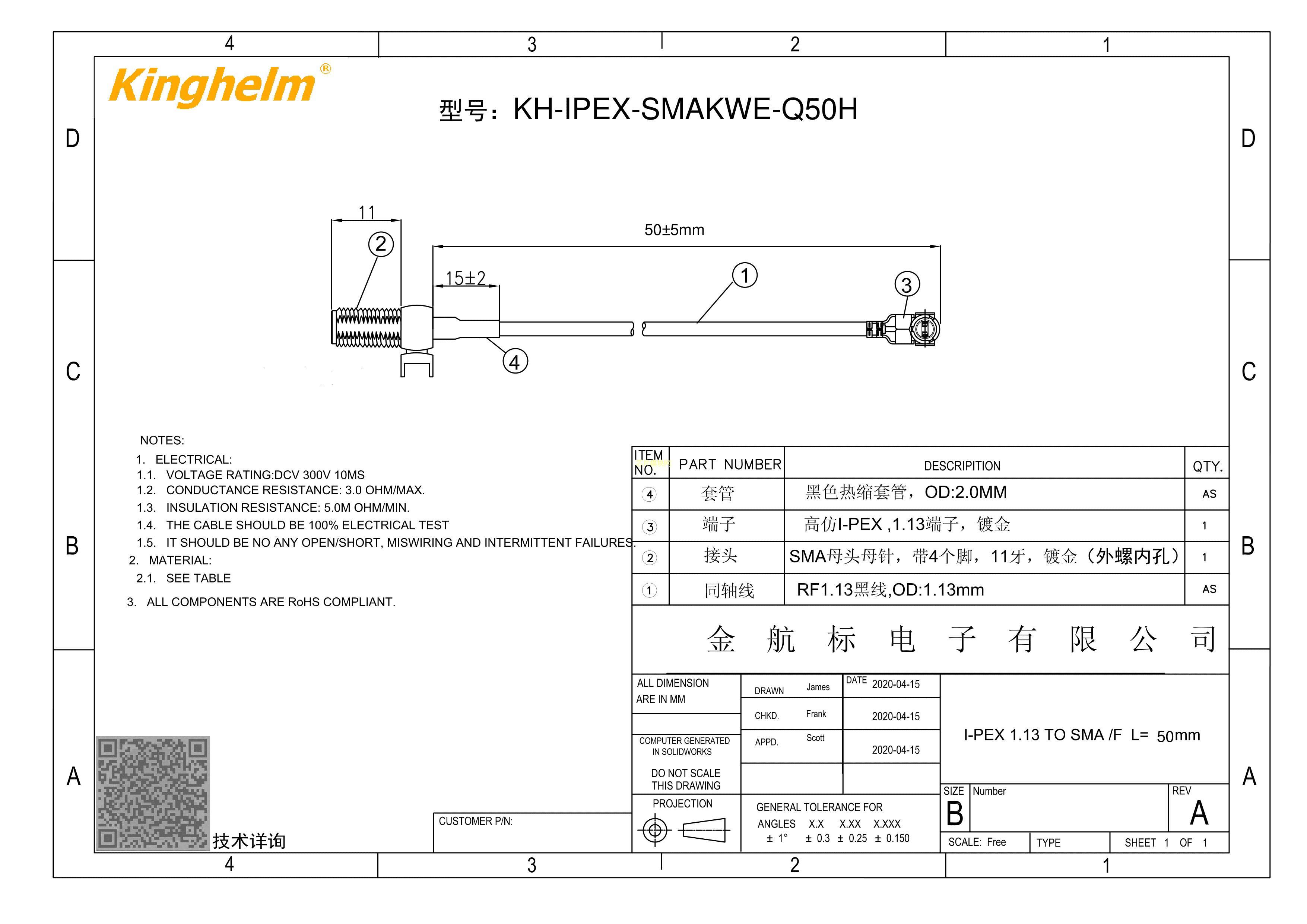 KH-IPEX-SMAKWE-Q50H数据手册L50mm封装kinghelm(金航标)PDF规格书,中英文下载