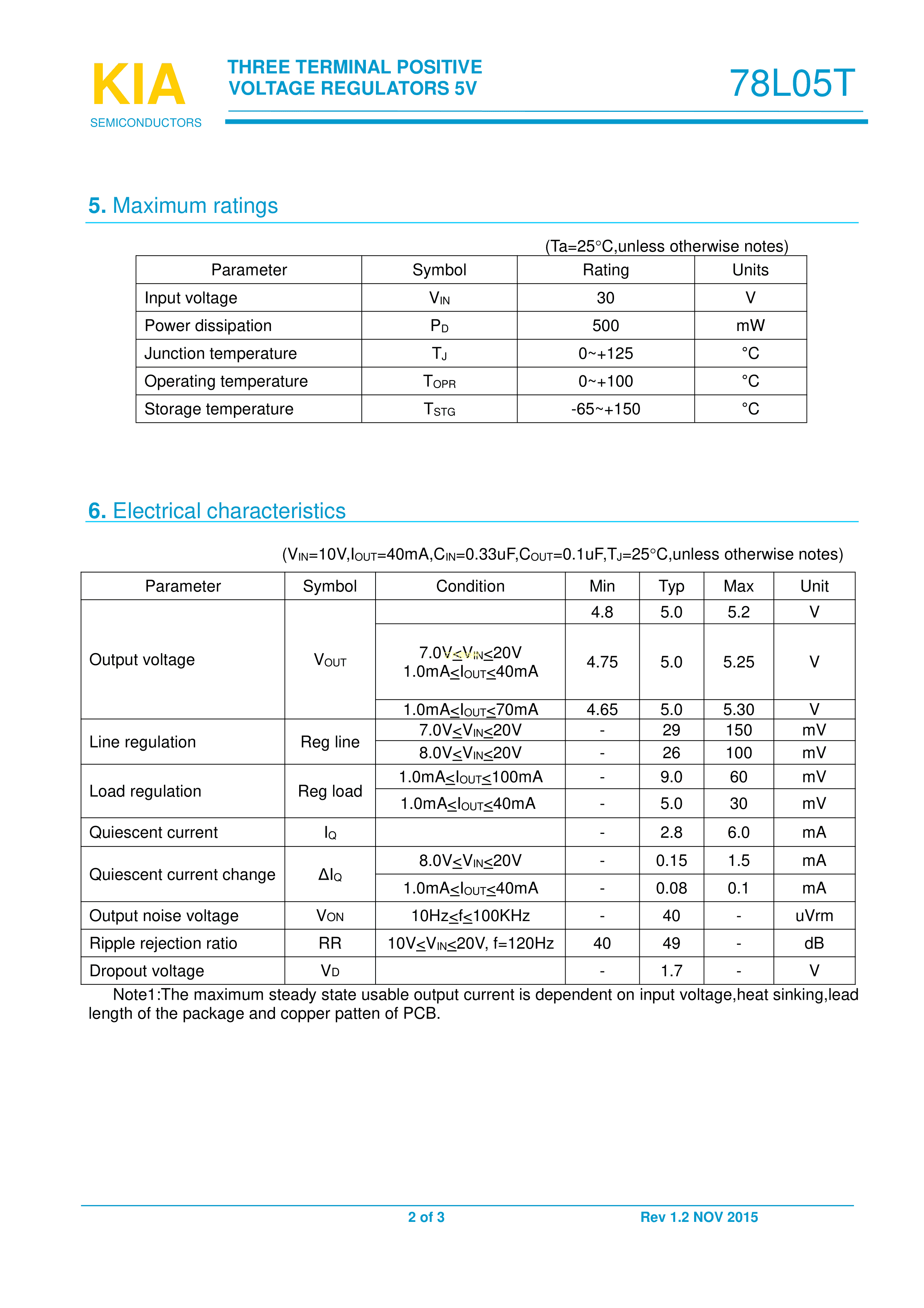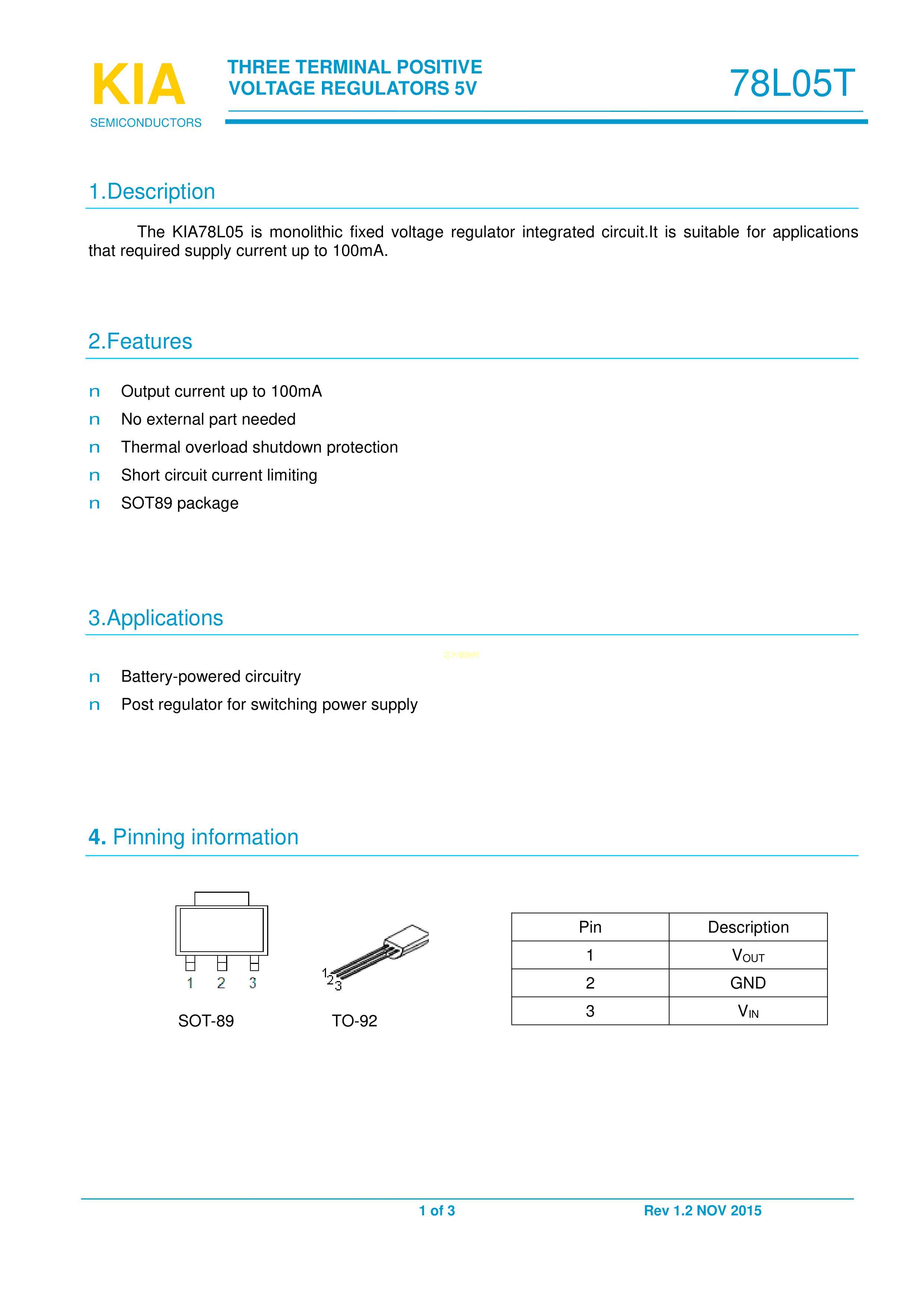 KIA78L05T数据手册SOT-89(SOT-89-3)封装KIAPDF规格书,中英文下载