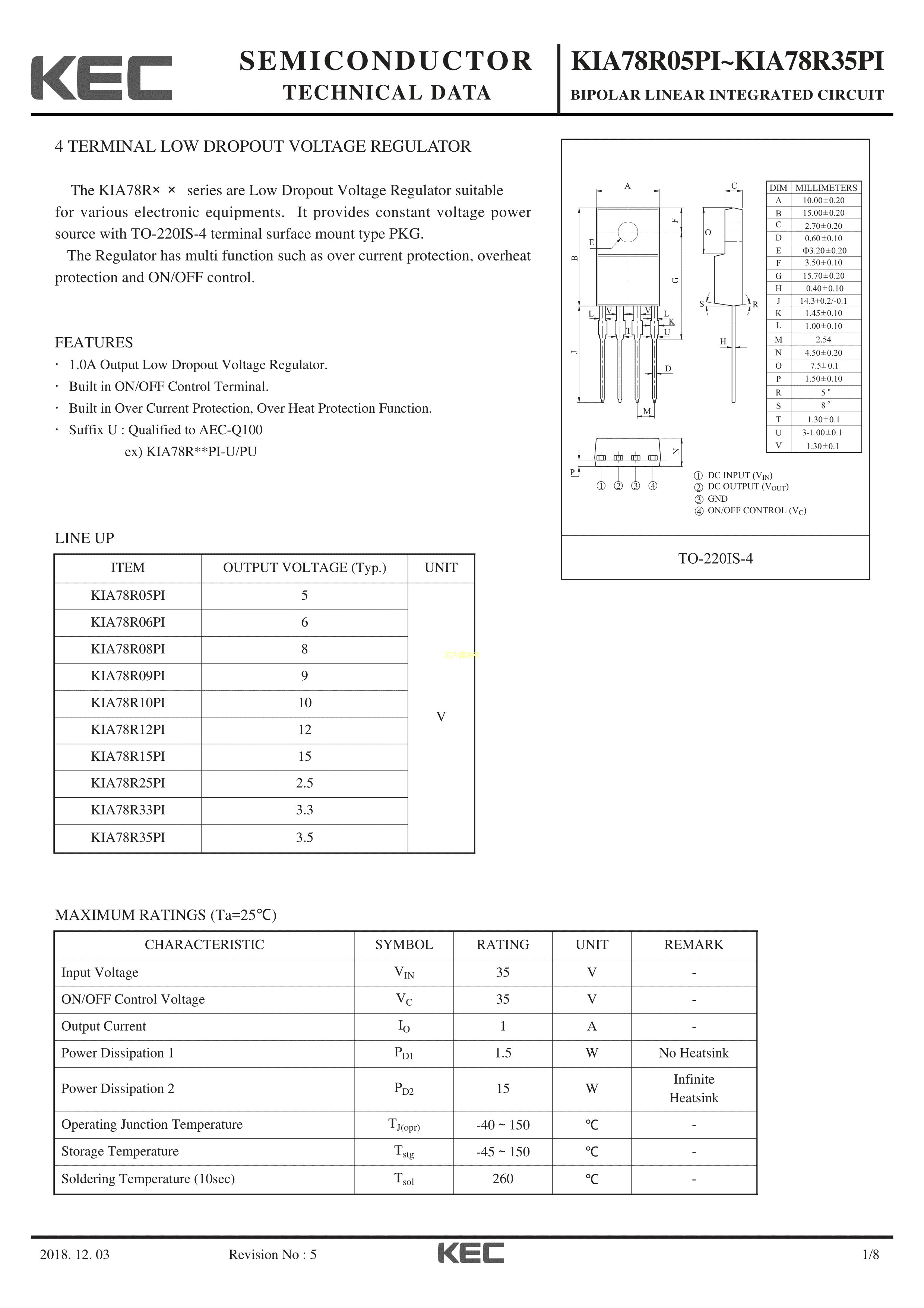 KIA78R06PI-U-P数据手册TO-220IS-4封装KECPDF规格书,中英文下载