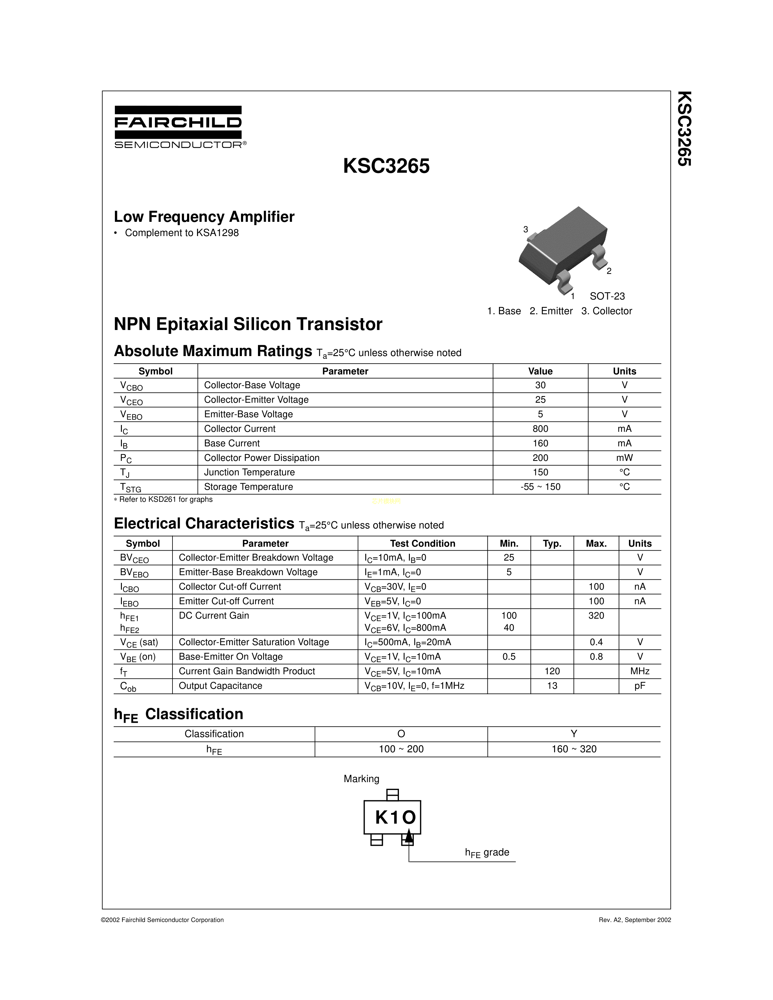 KSC3265YMTF数据手册SOT-23-3封装onsemi(安森美)PDF规格书,中英文下载