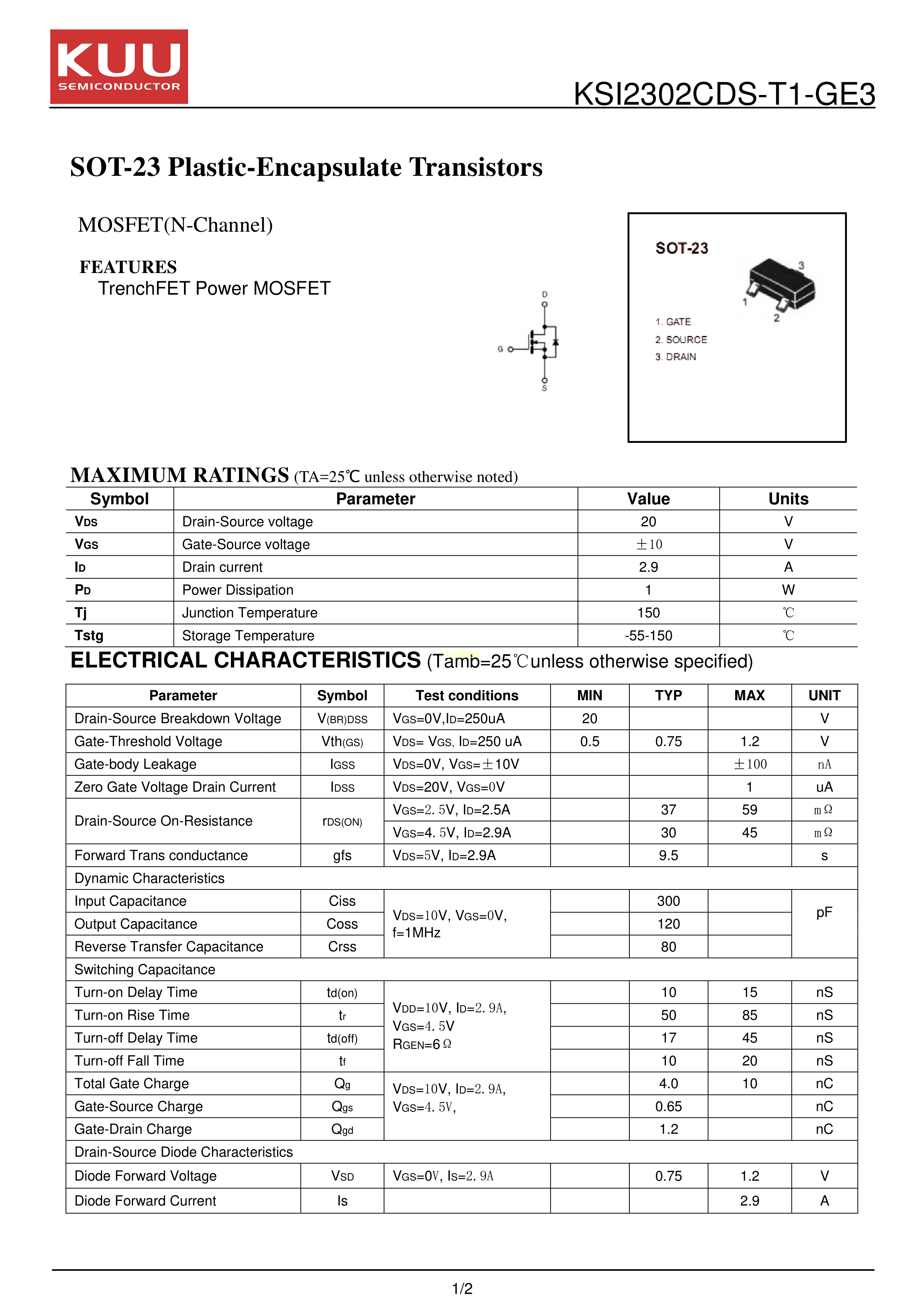 KSI2302CDS-T1-GE3数据手册SOT-23封装KUUPDF规格书,中英文下载