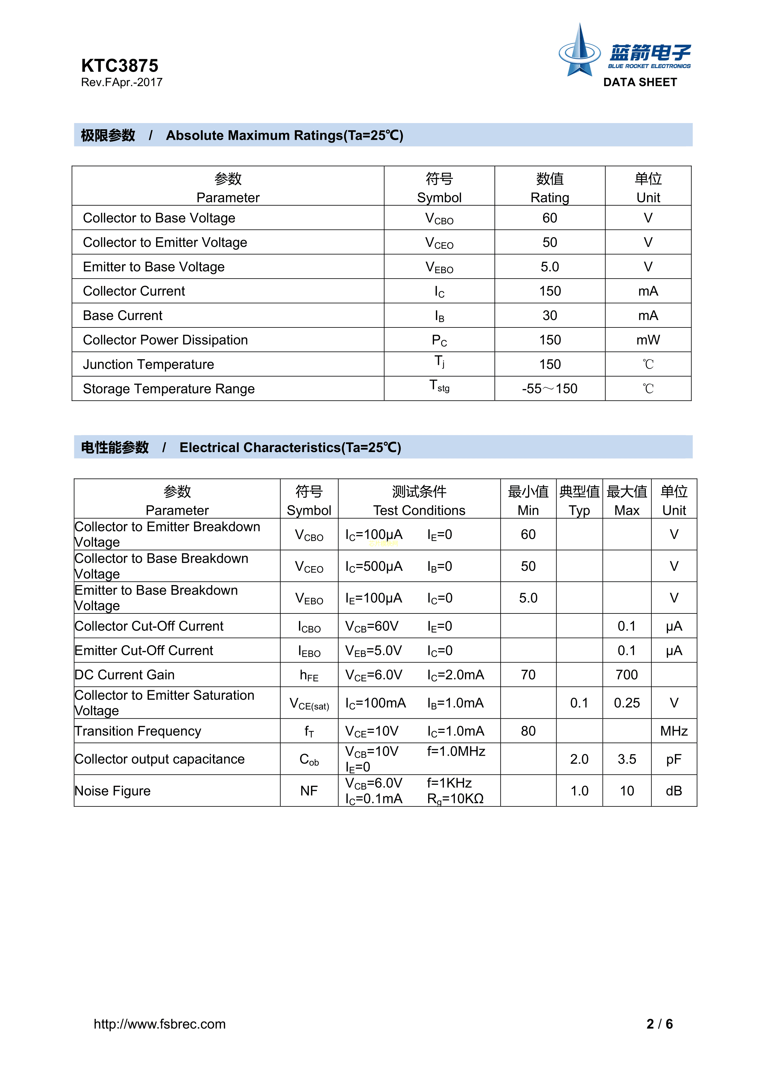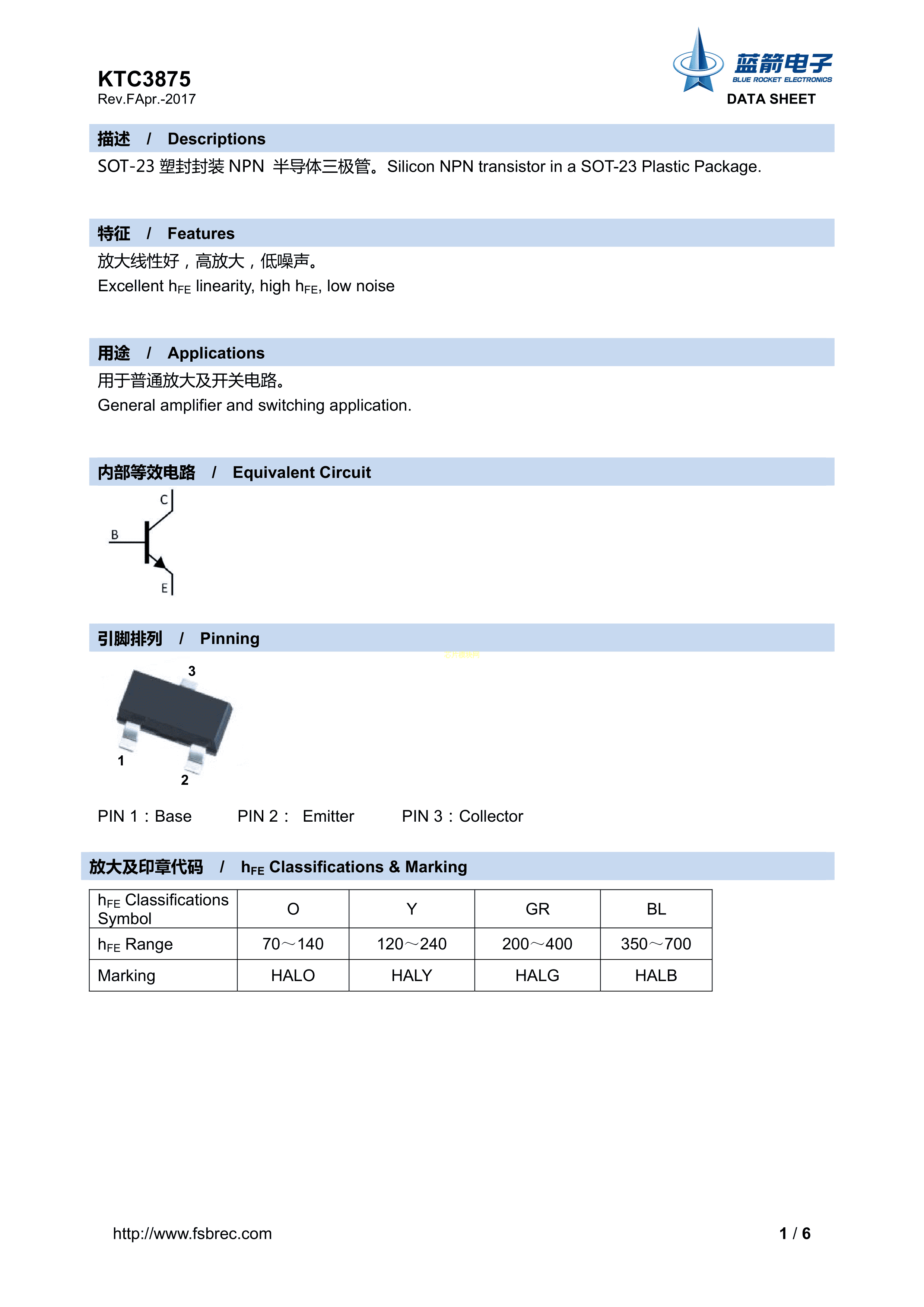 KTC3875-Y数据手册SOT-23封装BLUE ROCKET(蓝箭)PDF规格书,中英文下载