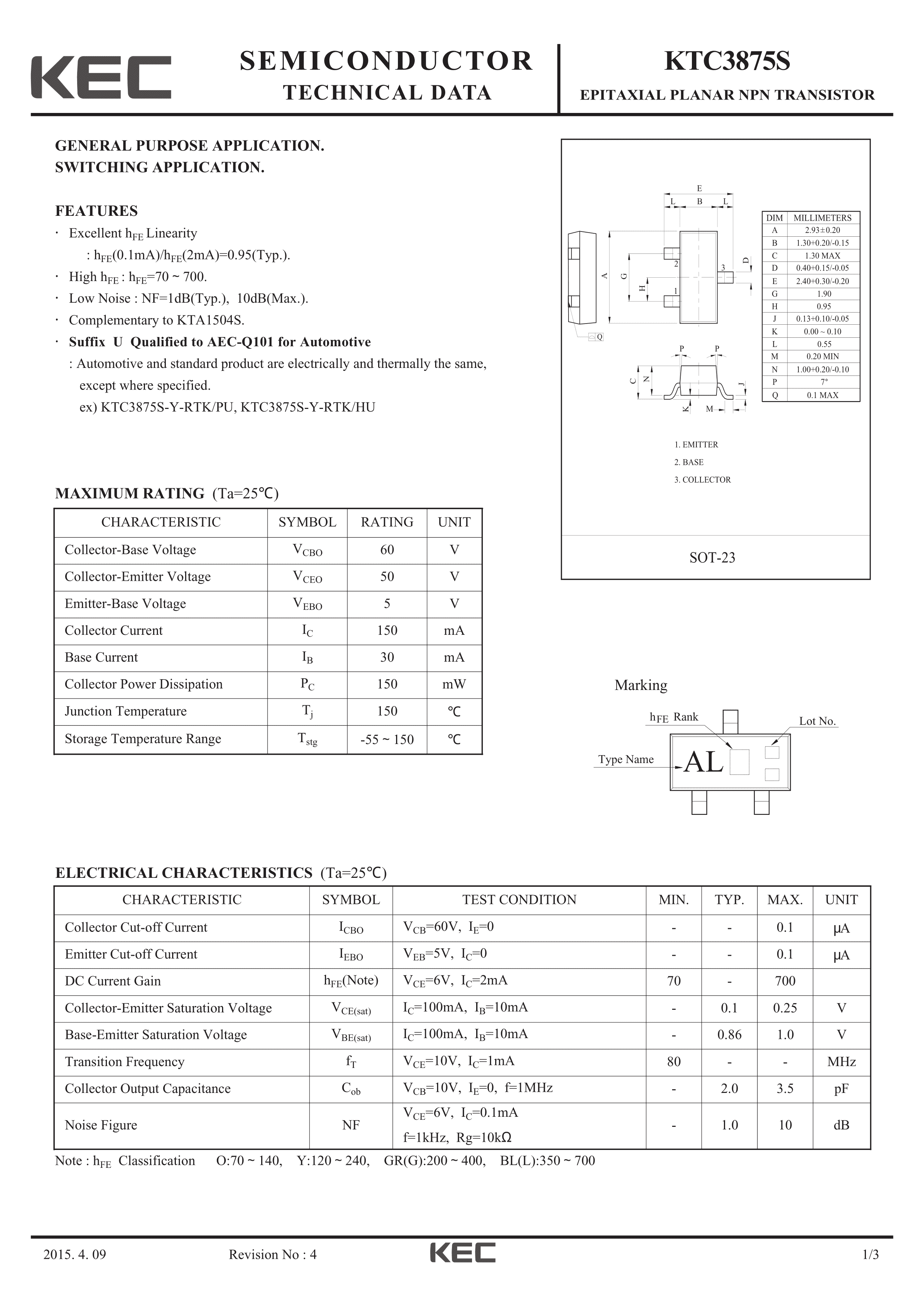 KTC3875S-GR-RTK-P数据手册SOT-23(SOT-23-3)封装KECPDF规格书,中