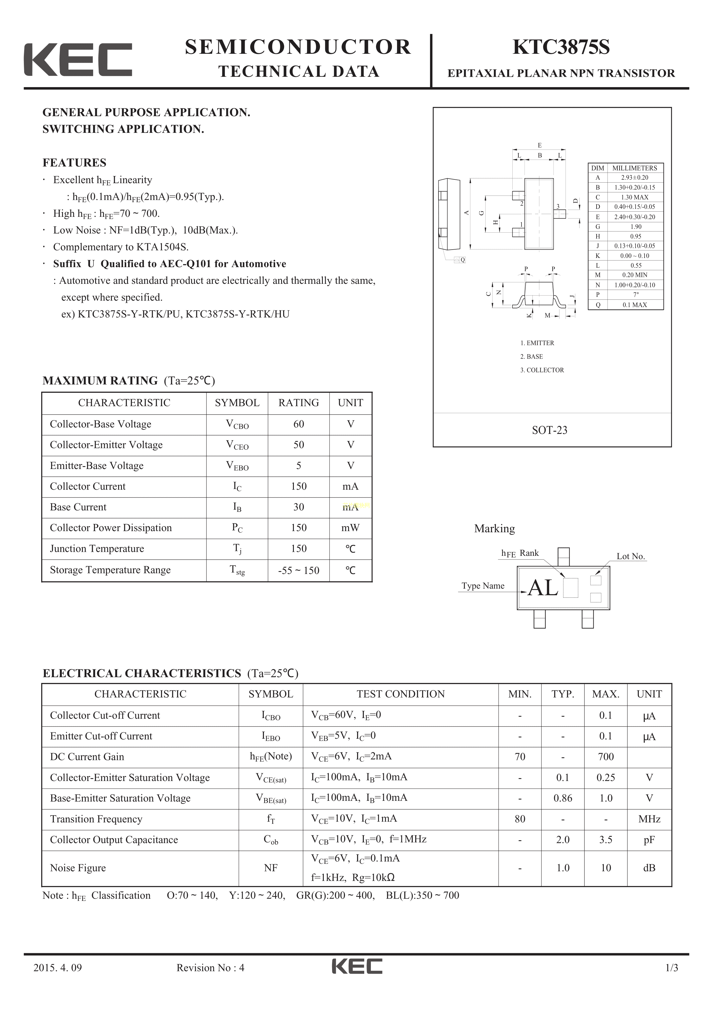 KTC3875S-Y-RTK-P数据手册SOT-23(SOT-23-3)封装KECPDF规格书,中英