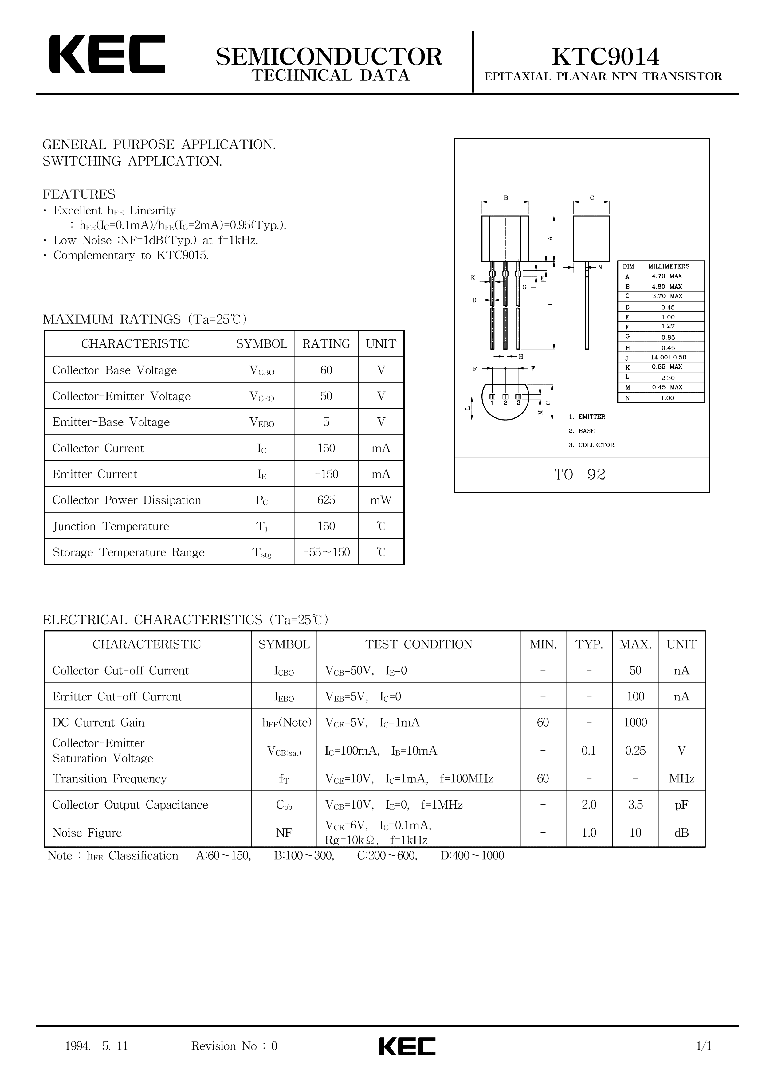 KTC9014-C-PC数据手册TO-92(TO-92-3)封装KECPDF规格书,中英文下载