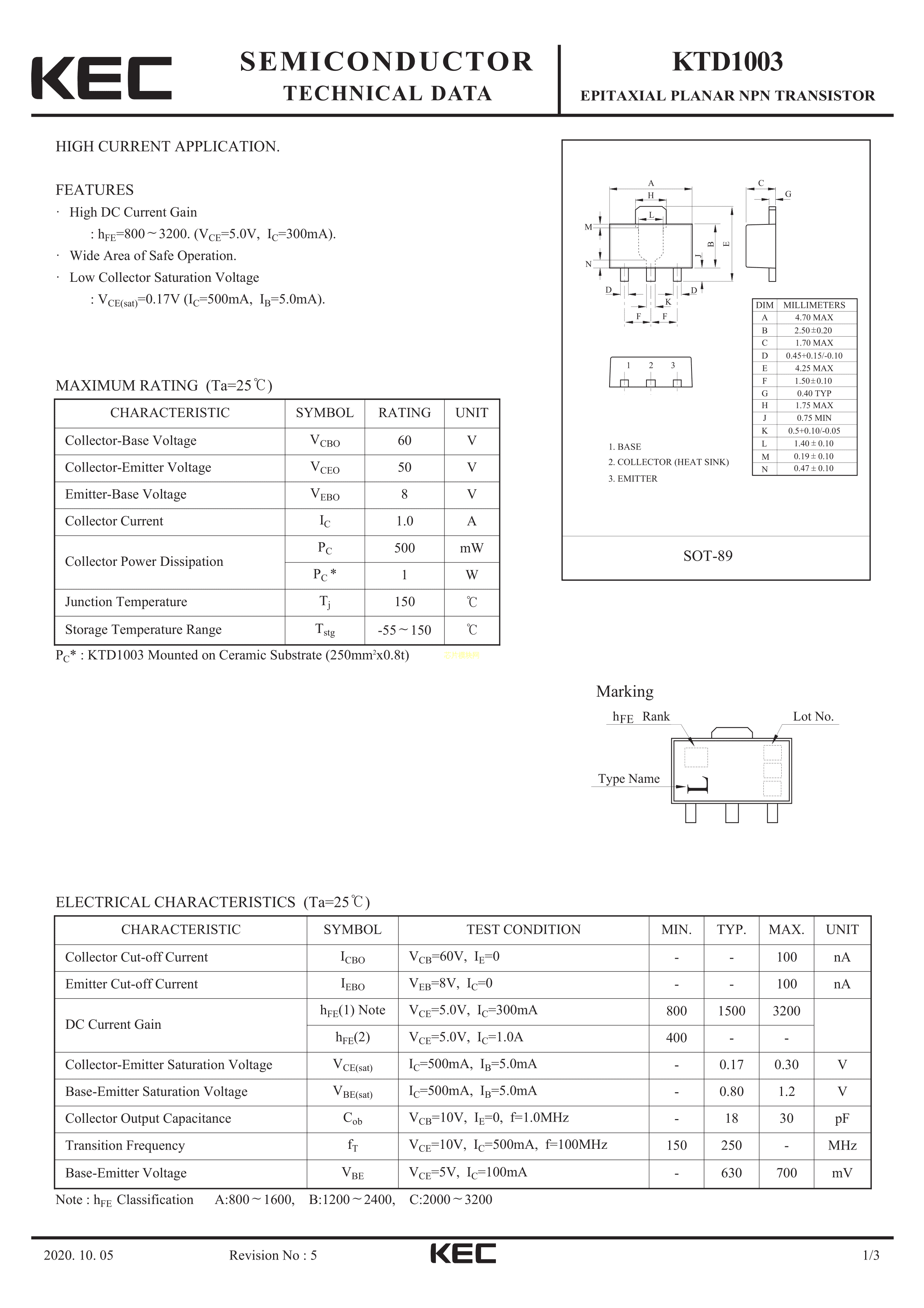KTD1003-B-RTF-P数据手册SOT-89封装KECPDF规格书,中英文下载