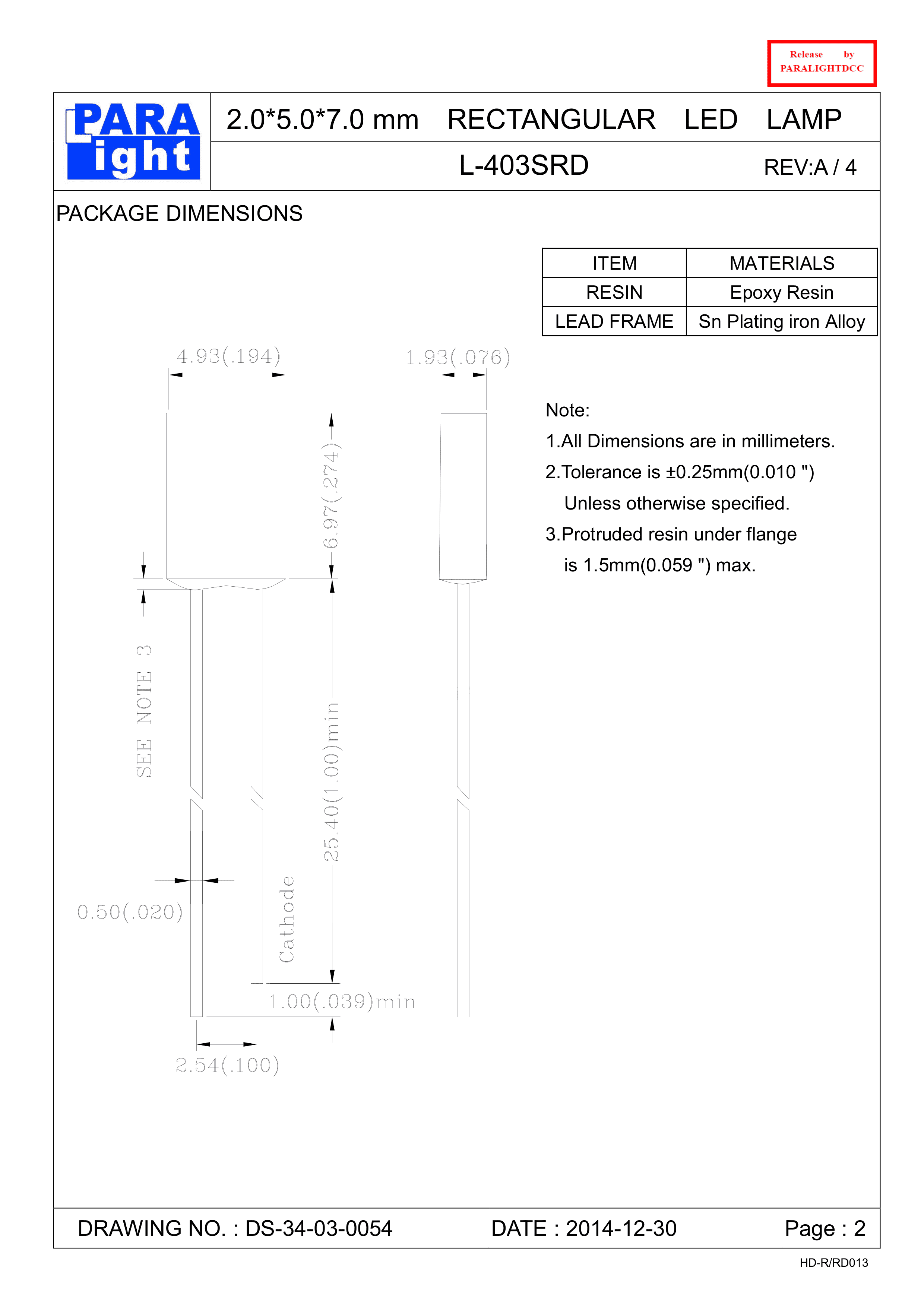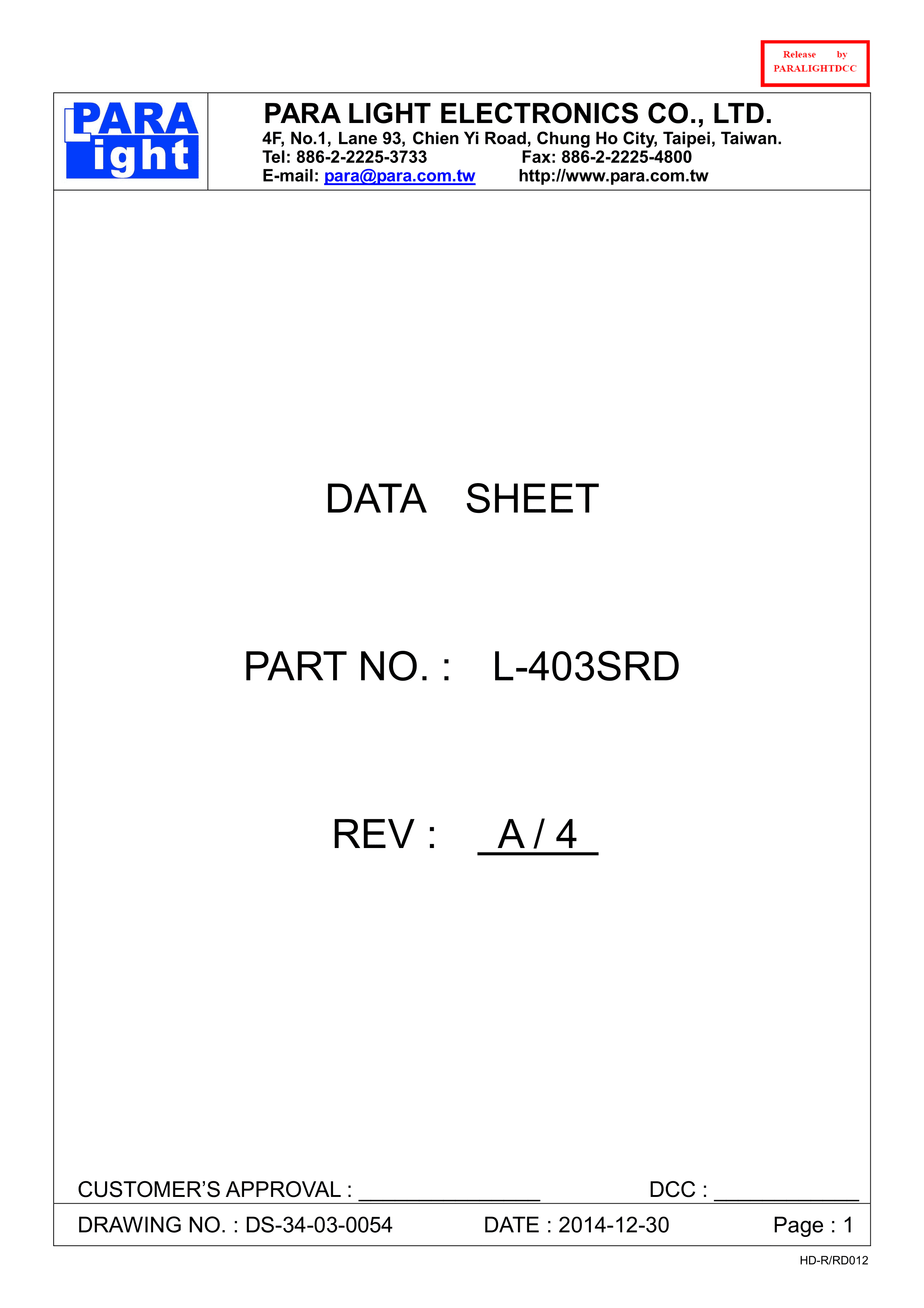 L-403SRD数据手册插件封装PARALIGHT(台湾光鼎)PDF规格书,中英文下载